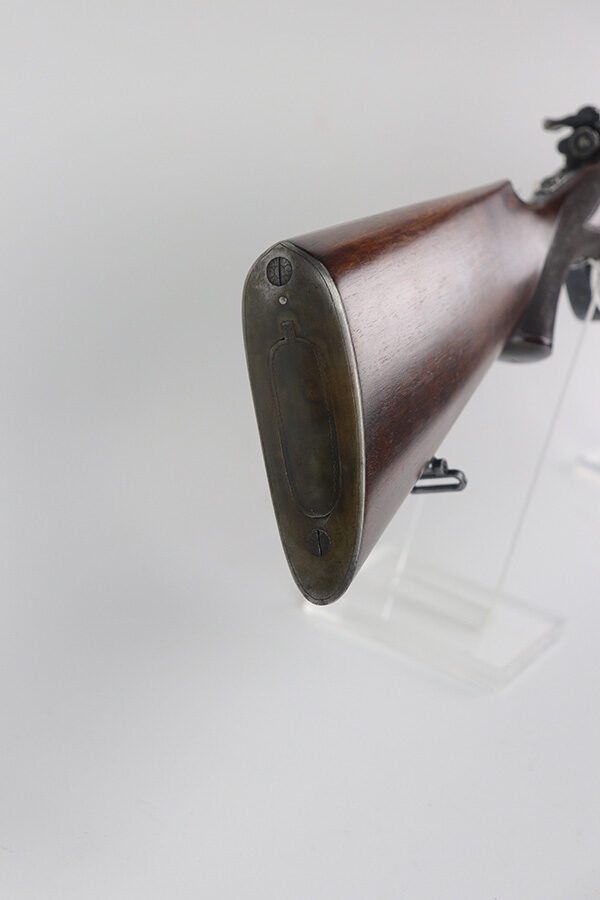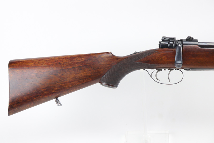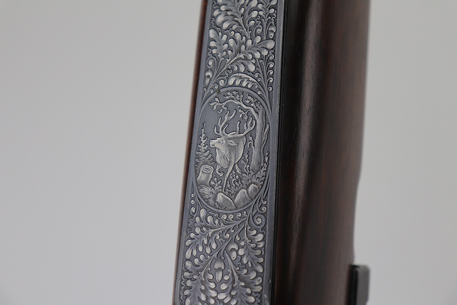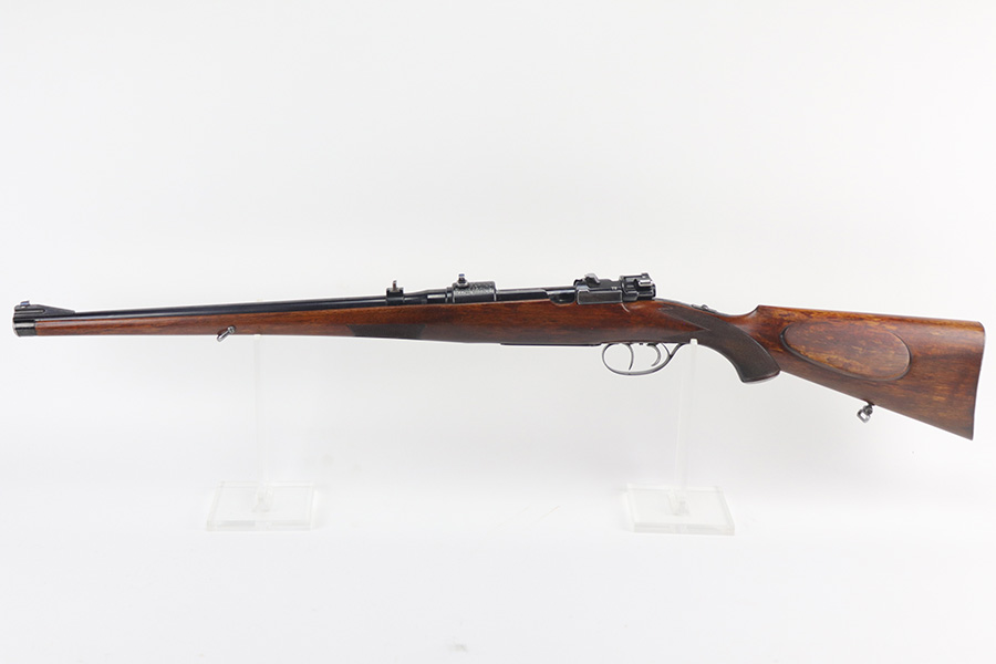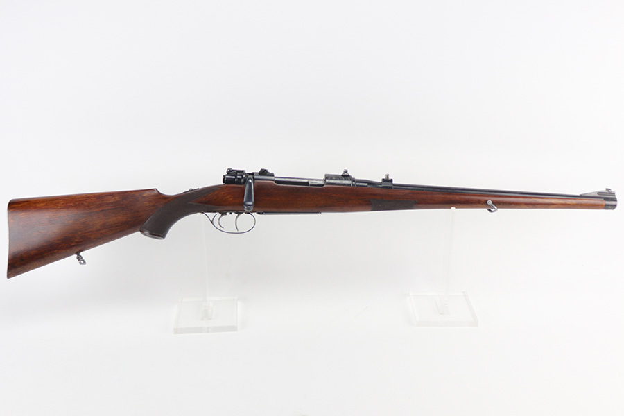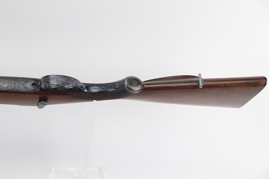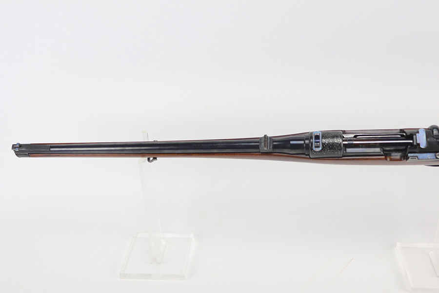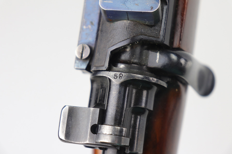11/17/21 – This is a gorgeous example of a factory-engraved Steyr Mannlicher Model 1903 Carbine, manufactured in 1929. The gun features a beautiful and very ornate oak leaf and acorn engraving pattern on the chamber, tang, floor plate, and trigger group. There is also a detailed engraving of what we assume is a stag and an antelope on the floor plate and underside of the trigger guard. The gun has retained about 95% of its original high polish bluing. There is just some very light scratchy wear around the muzzle and some minor wear on the bolt stop. There is noticeable thinning and minor discoloration on the grip cap and the butt plate. There is still some fire blue intact on some of the small parts. The stock is beautiful and near-mint. Mint bore.