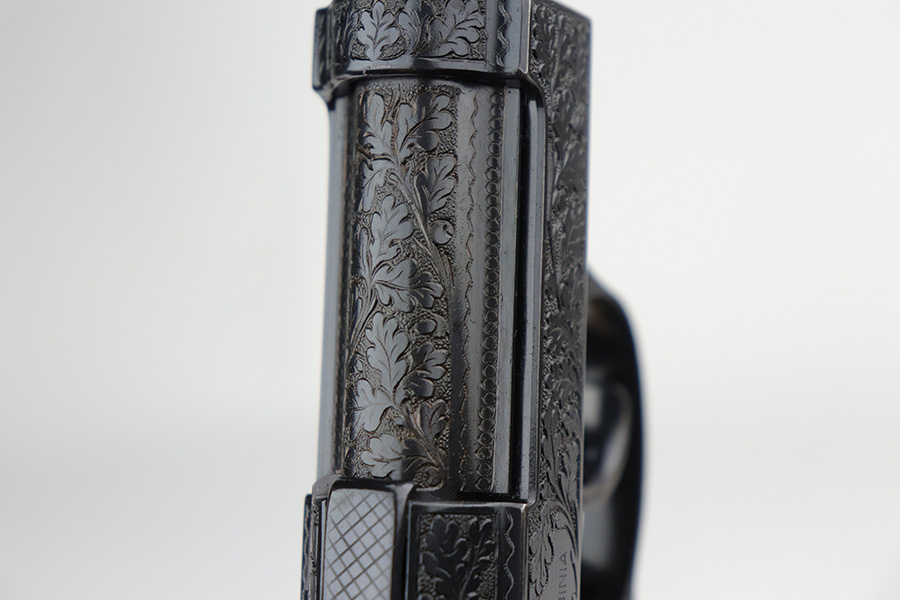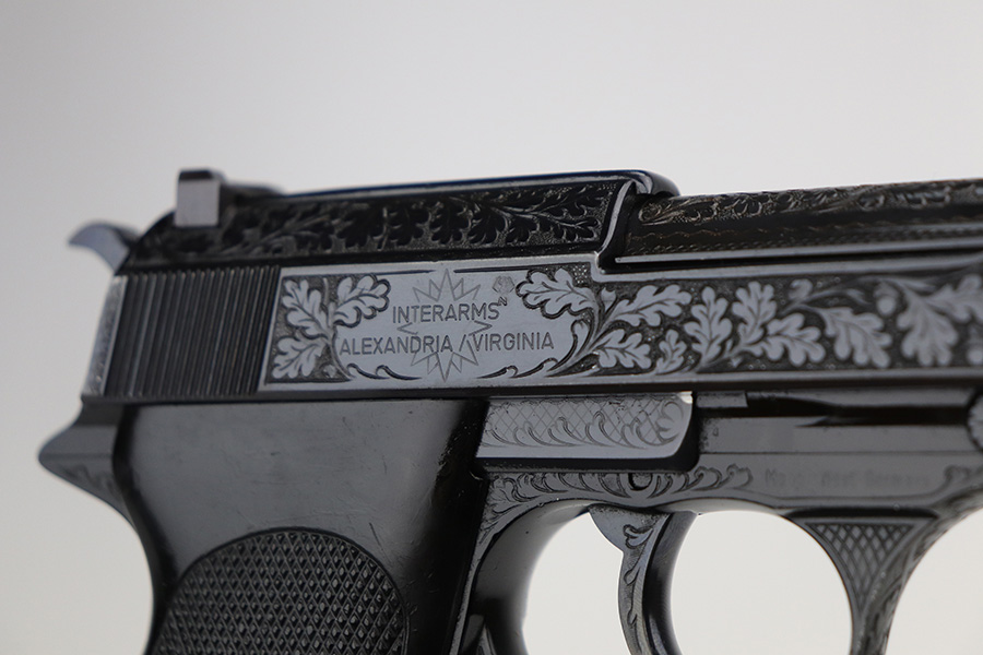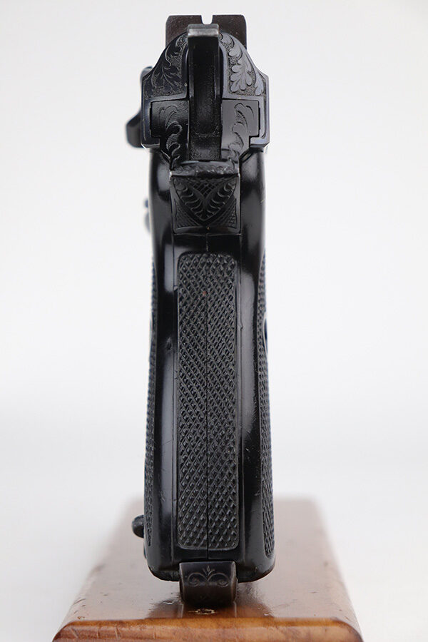 9/24/21 – This is a stunning example of a factory-engraved Walther P.38 manufactured in 1969. The gun is all matching and has the proper post-war West German “Eagle N” commercial proofs. The gun comes with a period-correct box that is hand-numbered to the gun. The gun features a gorgeous factory-engraved floral pattern throughout. There is some really nice geometric cross-hatching on the top plate and front strap. It is in mint condition with no obvious signs of wear. Comes with excellent black grips and a proper magazine that is engraved on the bottom. The bore is mint.
