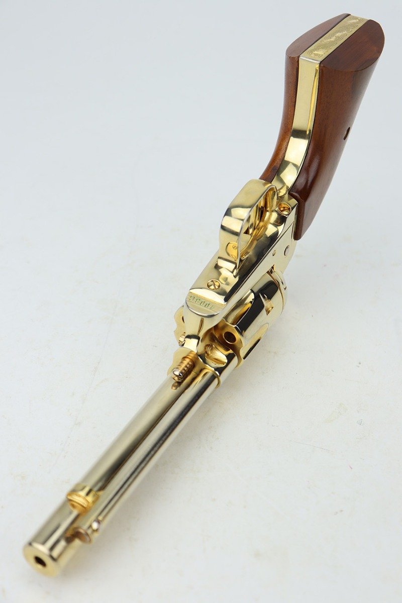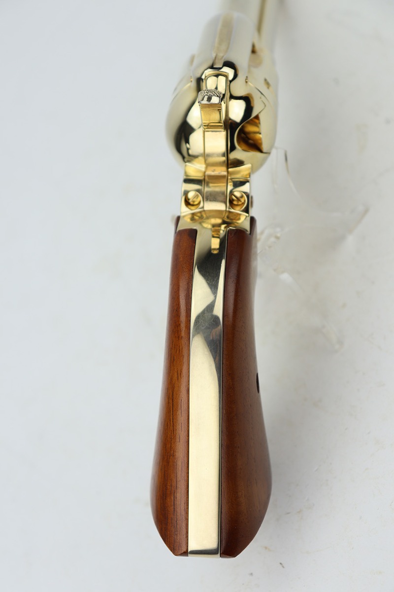 02/20/2024 – For sale is a spectacular 1861 Kansas Centennial edition Colt Frontier Scout in .22 caliber. Every part of the revolver is covered in gold and has no wear visible. There are also no signs of wear from the cylinder stop turning. The bore cannot be determined and assumed to be in unfired condition due to the lack of wear. The wood grips are also in excellent condition with no blemishes.