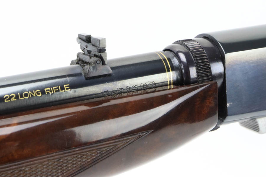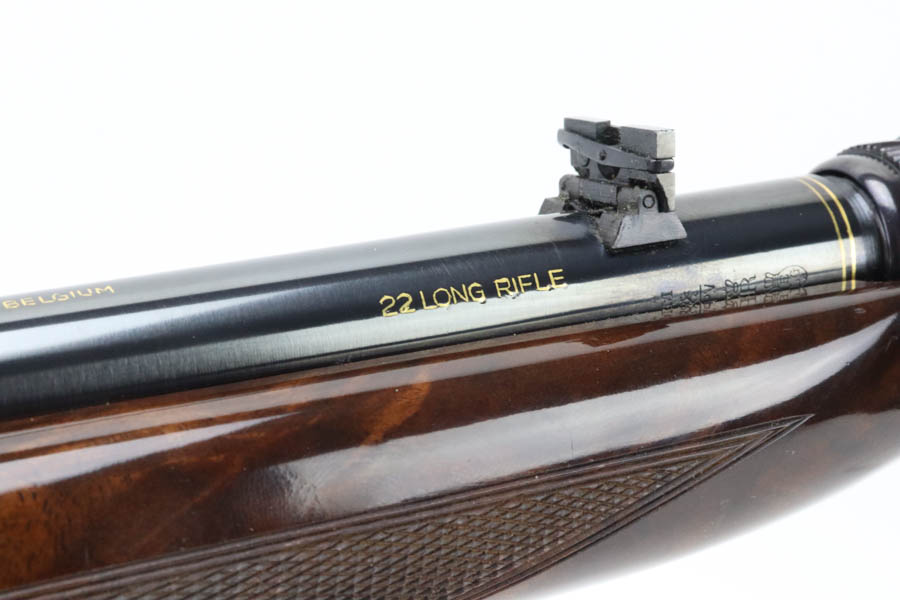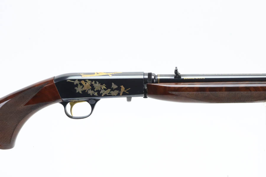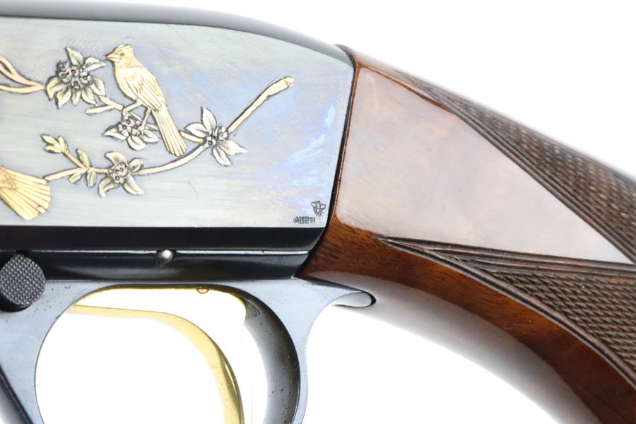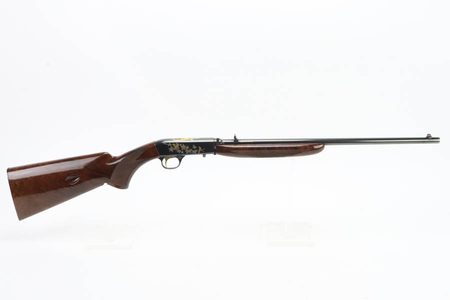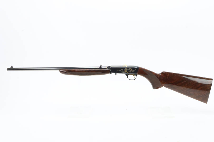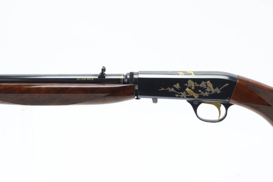 05/31/2024 – For sale is a Fantastic Gold engraved Belgian Browning SA-22 chambered in .22. This takedown rifle has a special gold inlay/engraving done by Angelo Bee. The receiver and trigger guard have a series of birds and butterflies in gold throughout. The receiver and barrel have a nice, deep polished bluing. There are some small scratches on the stock and on the front of the receiver. The bore is mirror bright and excellent.