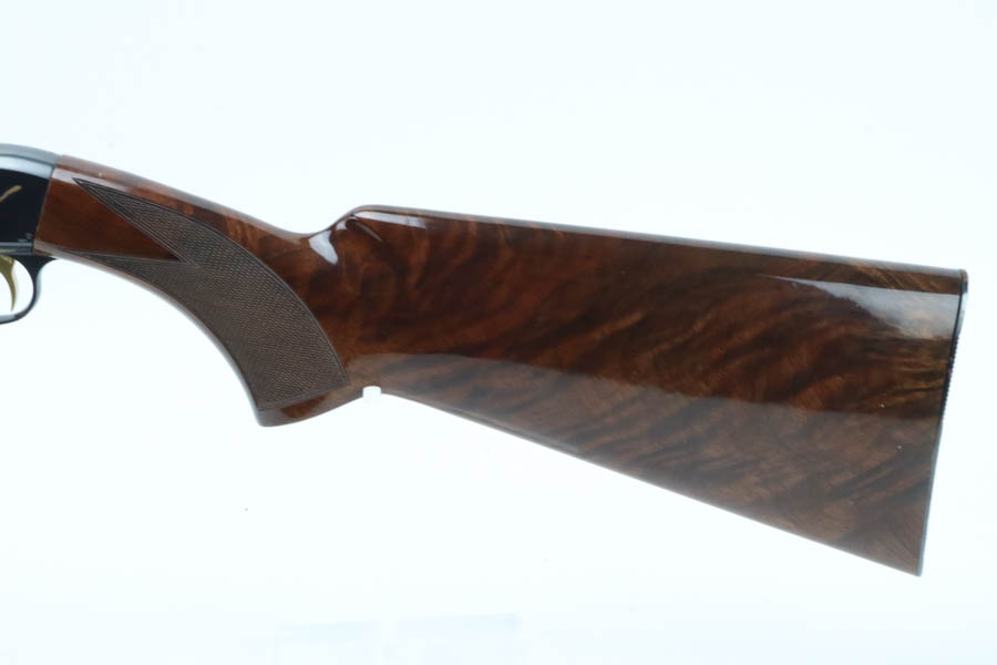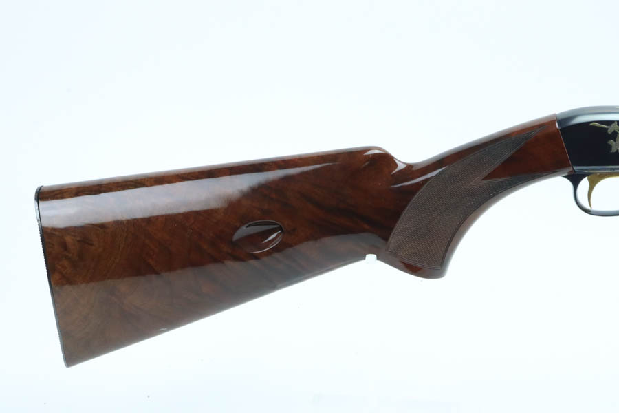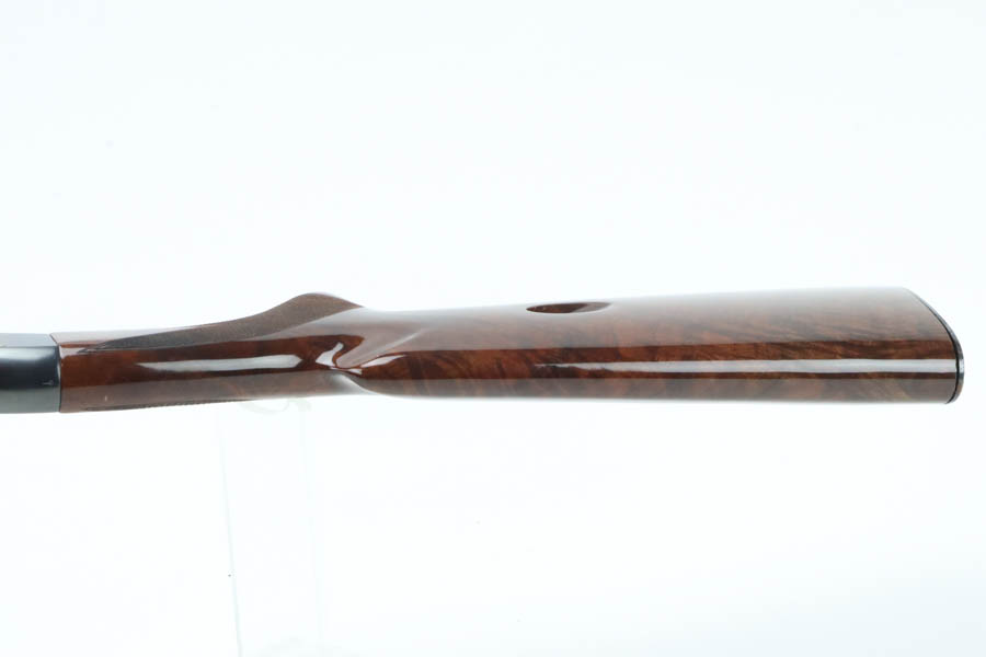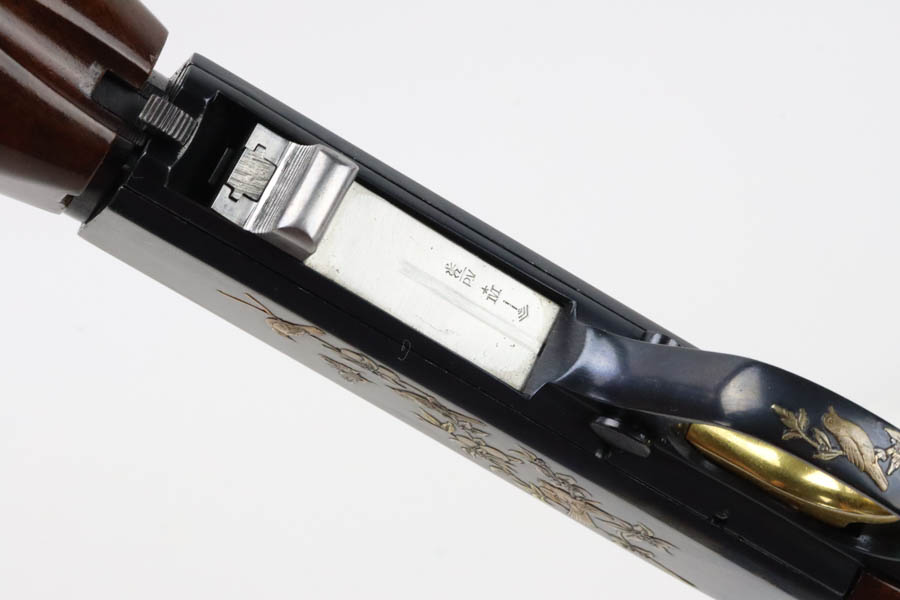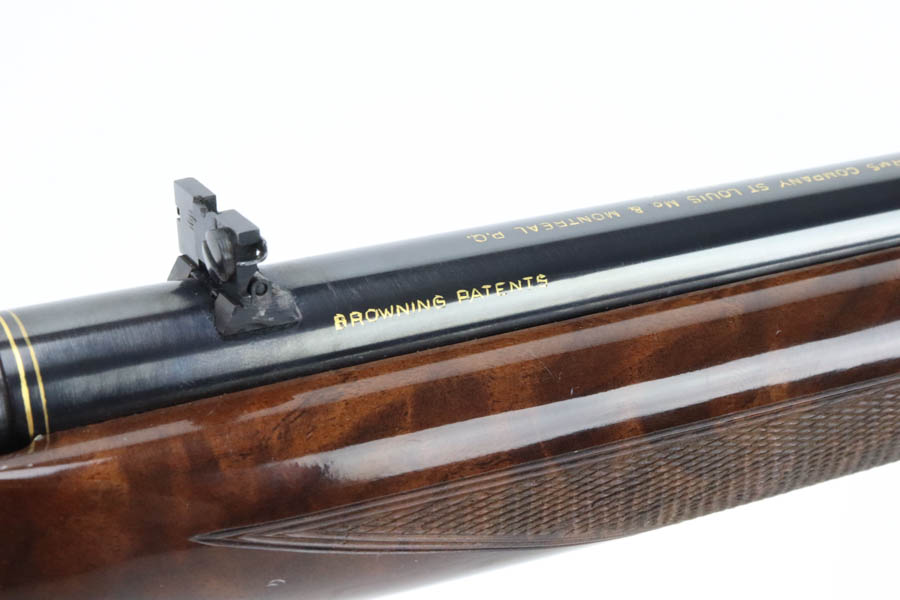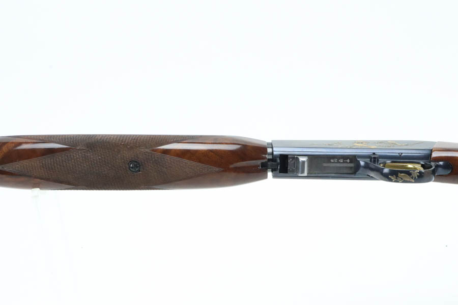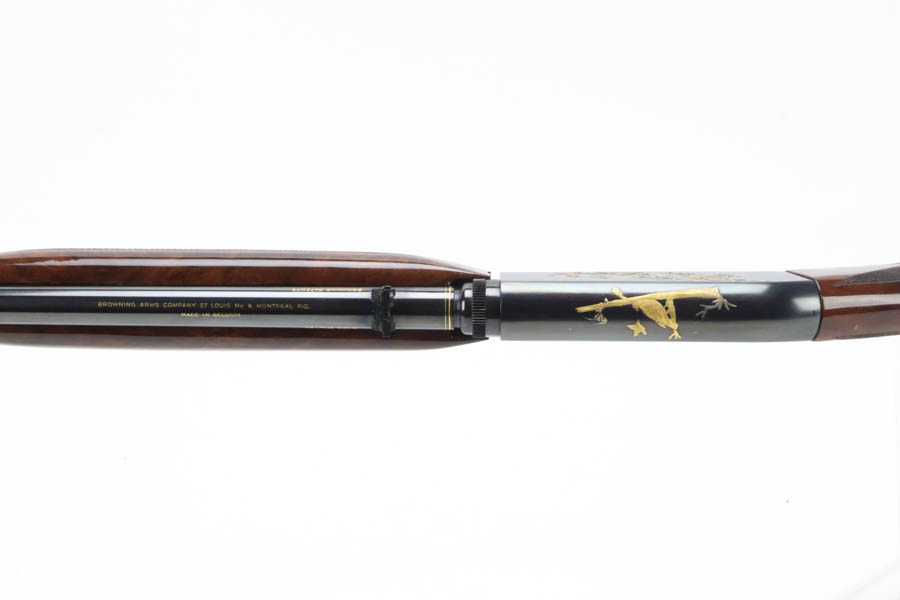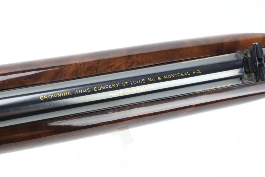 05/31/2024 – For sale is a Fantastic Gold engraved Belgian Browning SA-22 chambered in .22. This takedown rifle has a special gold inlay/engraving done by Angelo Bee. The receiver and trigger guard have a series of birds and butterflies in gold throughout. The receiver and barrel have a nice, deep polished bluing. There are some small scratches on the stock and on the front of the receiver. The bore is mirror bright and excellent.