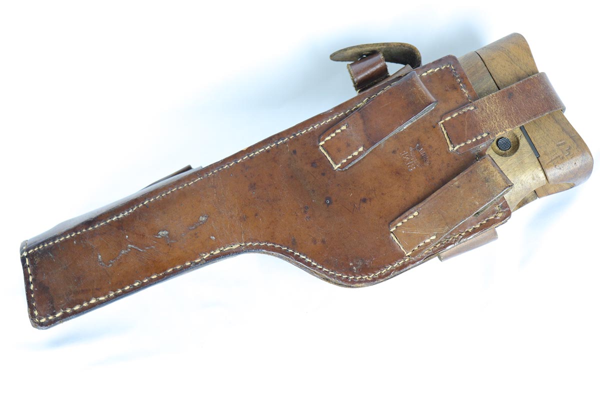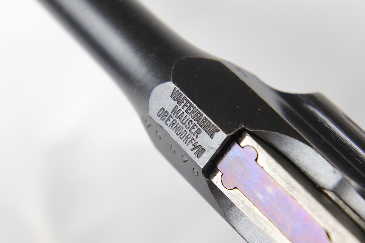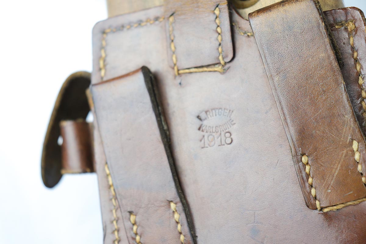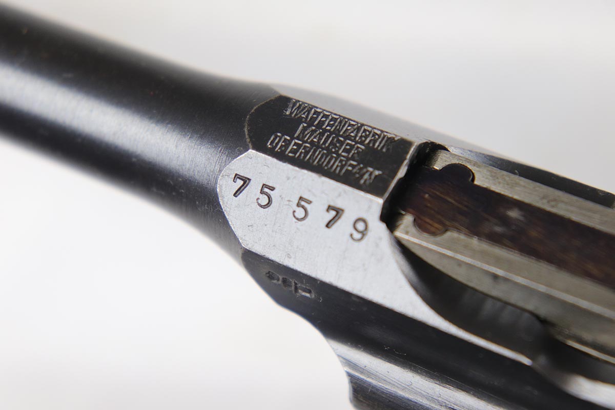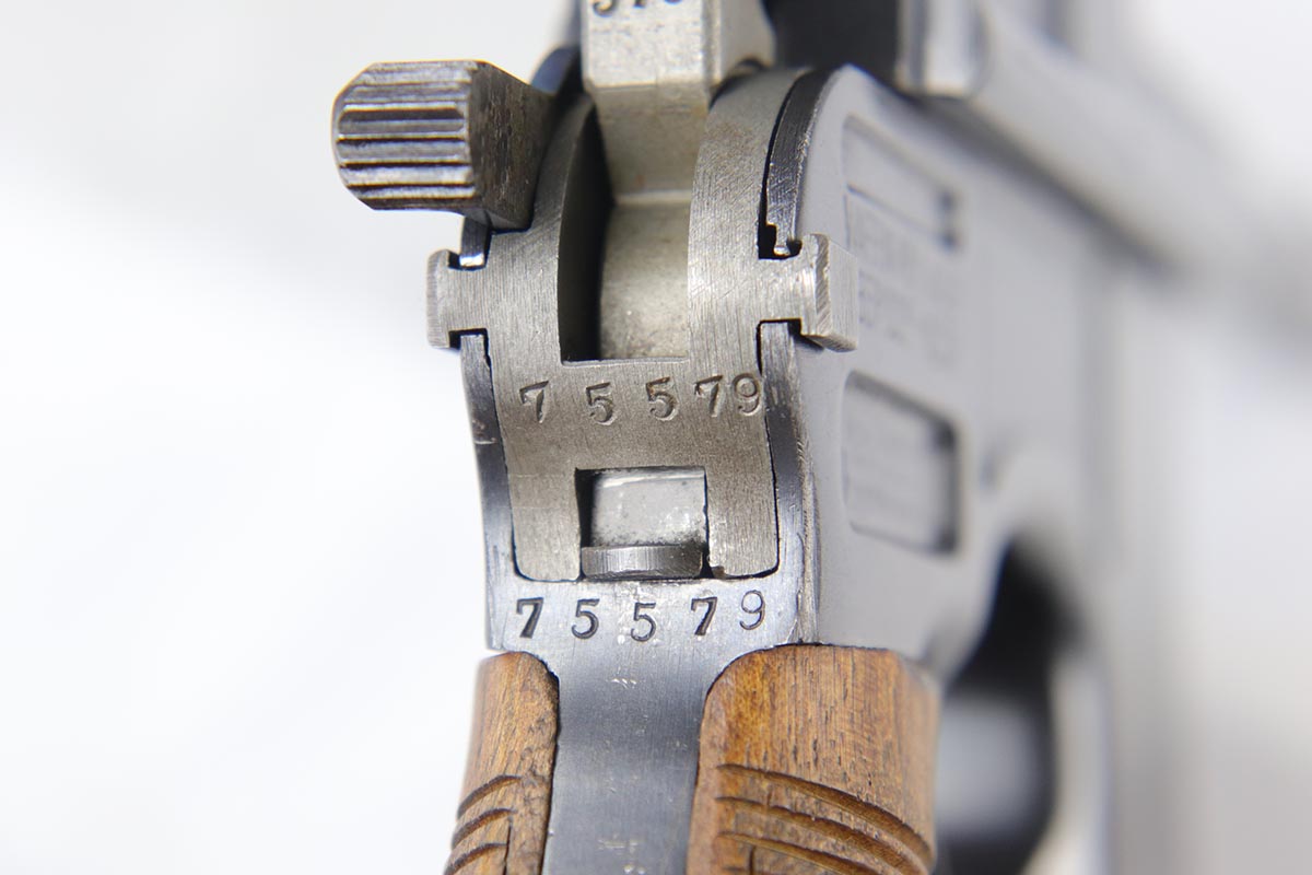 6/4/18 – This is a complete, all matching example of a Mauser “Red 9” broomhandle pistol made during WWI as part of the Imperial German Army contract. Unlike its commercial counterparts, “red 9” broomhandles were chambered in more common 9mm Para caliber, which was used by the german army and were marked with a large 9 on the grips which was then filled with red or orange paint to help German soldiers differentiate its caliber from the standard .30 mauser cartridge. Only about 130,000 of these very collectible guns were made, with only about 100,000 being accepted by the army and issued to the troops. Considered to be a substitute for a light carbine, they became very popular in trench warfare and were used by some of the Germany’s elite crack troops. This gun retains around 96-97% of its original blue, with most of the wear found under the barrel from being inserted in the wood shoulder stock. There is no pitting anywhere and the blue is deep and even without any browning or patination. There are a couple of small nicks midway on the left side of the barrel. Grips and bore are in excellent condition. All the numbers match, including the grips and all the internals. Vivid fire blue is present on the rear sight cursor, bolt stop and on the trigger and safety lever. This is a complete rig with its original minty matching shoulder stock with no defects or cracks and an imperial proofmark stamped in the wood below the hinge. An imperial acceptance mark is also present on the right side of the barrel extension. Beautiful original leather harness, maker marked and dated 1918, competes this incredible set.