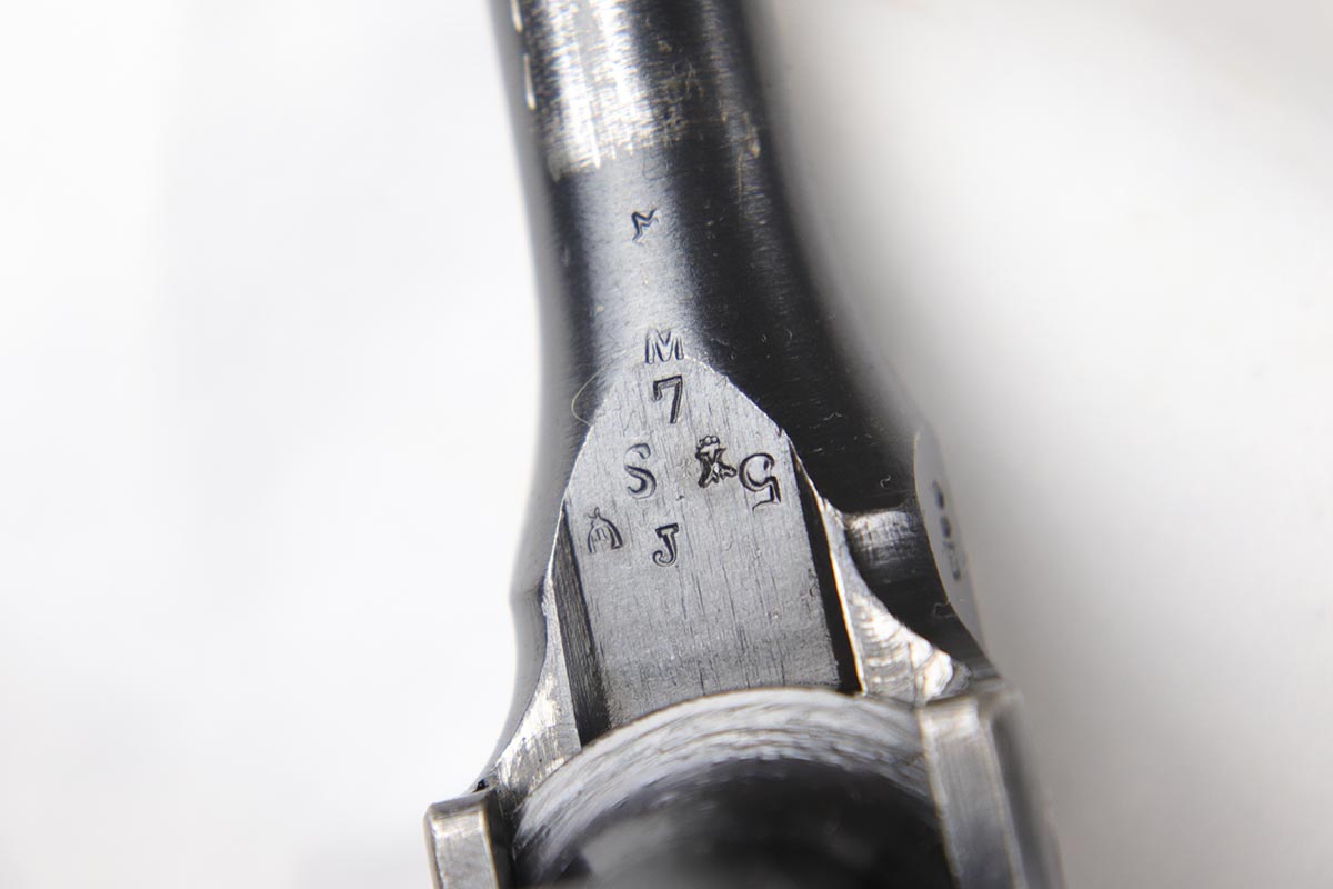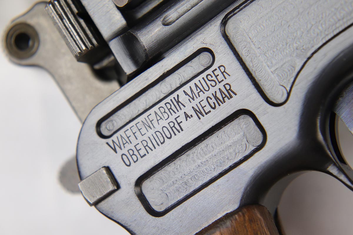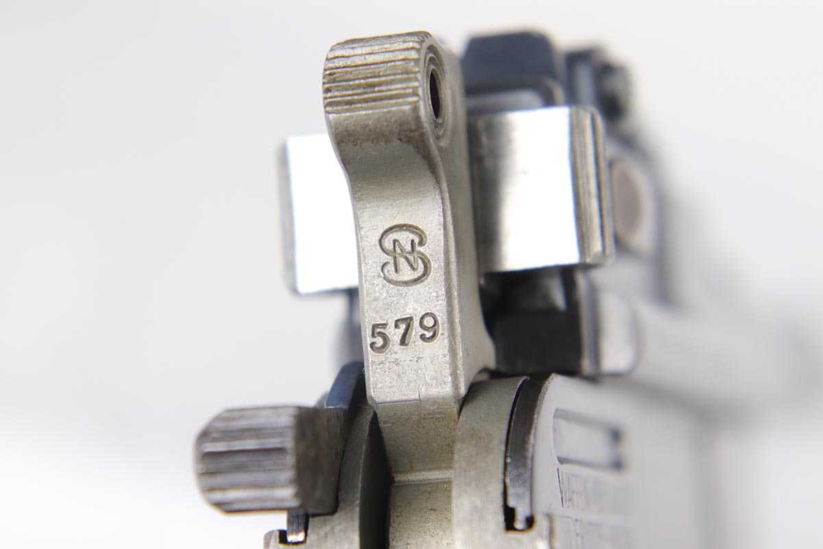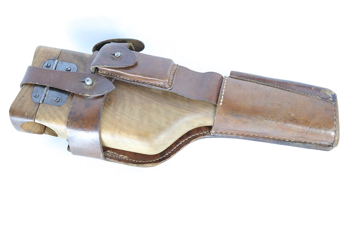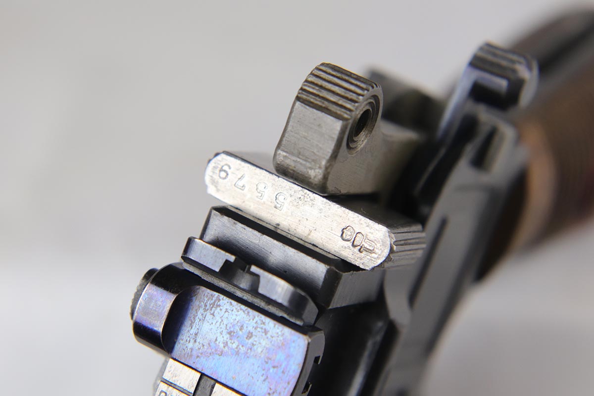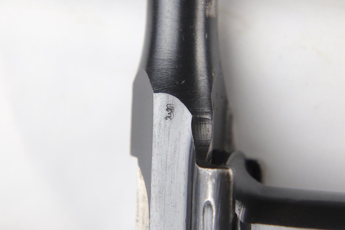 6/4/18 – This is a complete, all matching example of a Mauser “Red 9” broomhandle pistol made during WWI as part of the Imperial German Army contract. Unlike its commercial counterparts, “red 9” broomhandles were chambered in more common 9mm Para caliber, which was used by the german army and were marked with a large 9 on the grips which was then filled with red or orange paint to help German soldiers differentiate its caliber from the standard .30 mauser cartridge. Only about 130,000 of these very collectible guns were made, with only about 100,000 being accepted by the army and issued to the troops. Considered to be a substitute for a light carbine, they became very popular in trench warfare and were used by some of the Germany’s elite crack troops. This gun retains around 96-97% of its original blue, with most of the wear found under the barrel from being inserted in the wood shoulder stock. There is no pitting anywhere and the blue is deep and even without any browning or patination. There are a couple of small nicks midway on the left side of the barrel. Grips and bore are in excellent condition. All the numbers match, including the grips and all the internals. Vivid fire blue is present on the rear sight cursor, bolt stop and on the trigger and safety lever. This is a complete rig with its original minty matching shoulder stock with no defects or cracks and an imperial proofmark stamped in the wood below the hinge. An imperial acceptance mark is also present on the right side of the barrel extension. Beautiful original leather harness, maker marked and dated 1918, competes this incredible set.