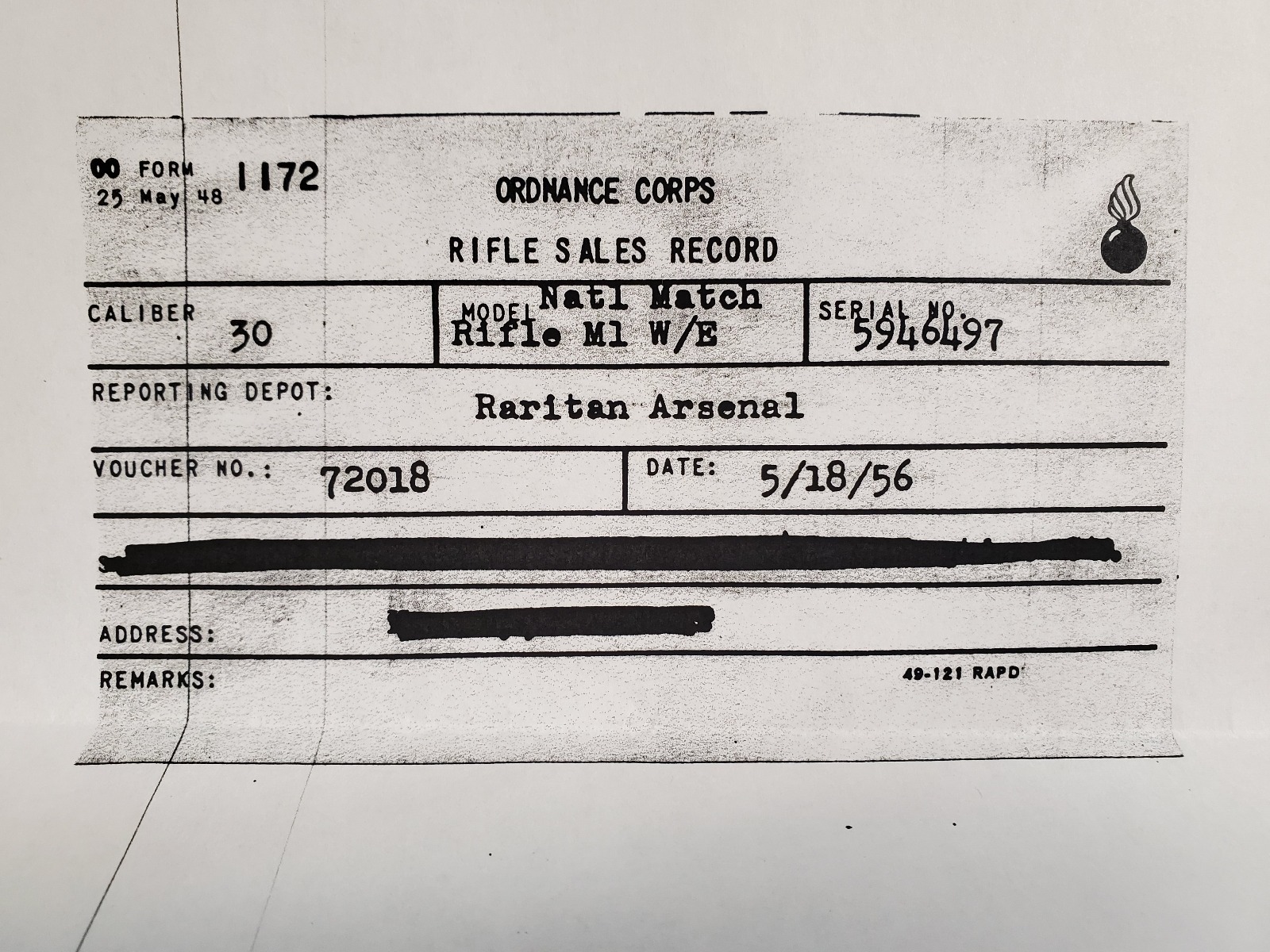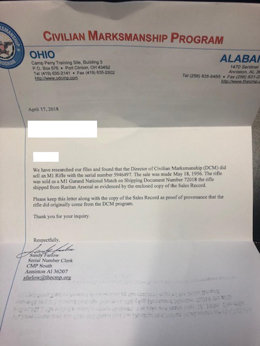 4/2/19 – This is one of the most difficult National Match Garand rifles for collector to acquire: an all original, CMP documented, mint type 1 gun. As the name implies, Type 1 National Match rifles were first intruduced in the mid-1950s with the idea of making a rifle that could compete in national matches. With that in mind, the best barrels were selected, and paired up with the existing inventory of receivers and using the best components available. These were sold to various shooting clubs, at Camp Perry events and to individuals through the DCM (Director of Civilian Marksmanship) – predecessor of CMP. Only Springfield arsenal parts were used, and the barrel was the only part marked with a “NM” on the left side. Springfield Arsenal stocks were used as well as were marked with a “serif P in the circle” and a DOD cartouche on the left side. This particular gun is all correct and has all of the distinguishing characteristics mentioned above. It is near mint with beautiful parkerizing on the metal and practically no wear on the stock. It is accompanied by a letter from CMP (Civilian Marksmanship Program), verifying that the rifle was indeed sold as a National Match rifle. Many of these were eventually converted to Type 2 configurations, with very few originals (like this one) remaining in factory Type 1 configuration.