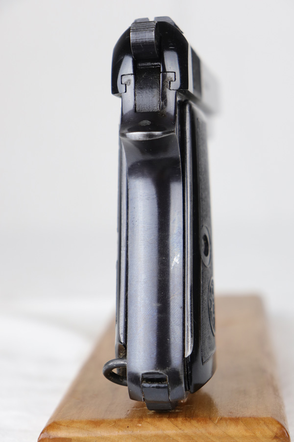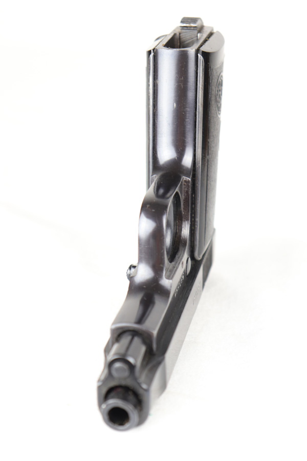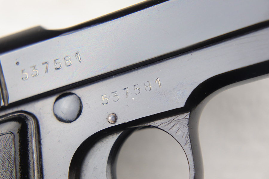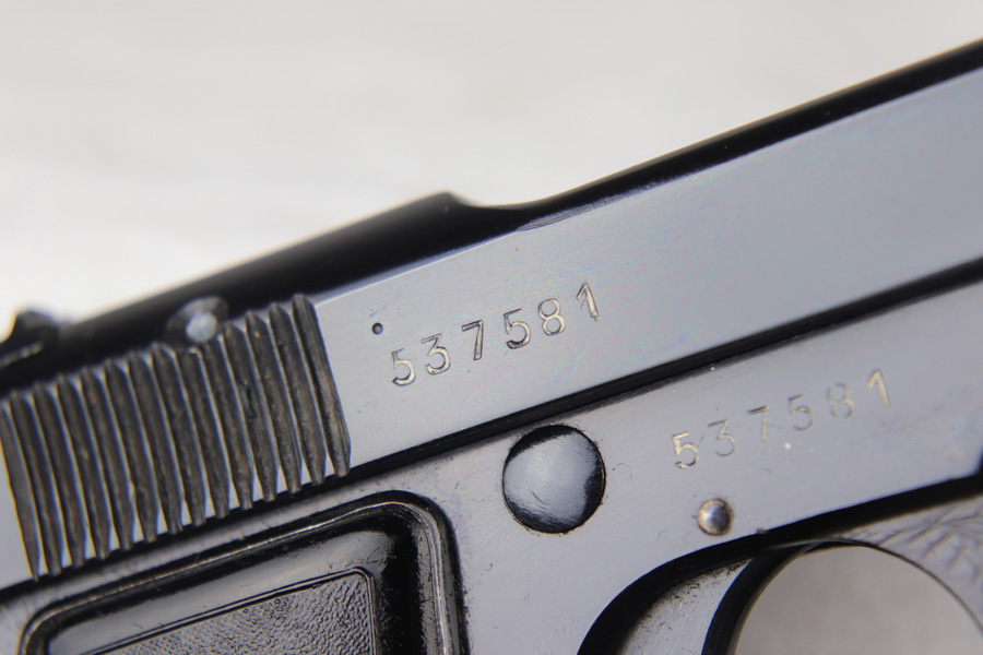 10/24/18 – This is a scarce Nazi Beretta M1935 with high-polish blued finish. It is all original and matching with 98% blue remaining, showing minor strap wear and a couple small dings on the frame. 4UT proof is clearly visible on right side frame. Slide is 1944 dated. Excellent grips and mag. Bore is shiny with strong rifling.