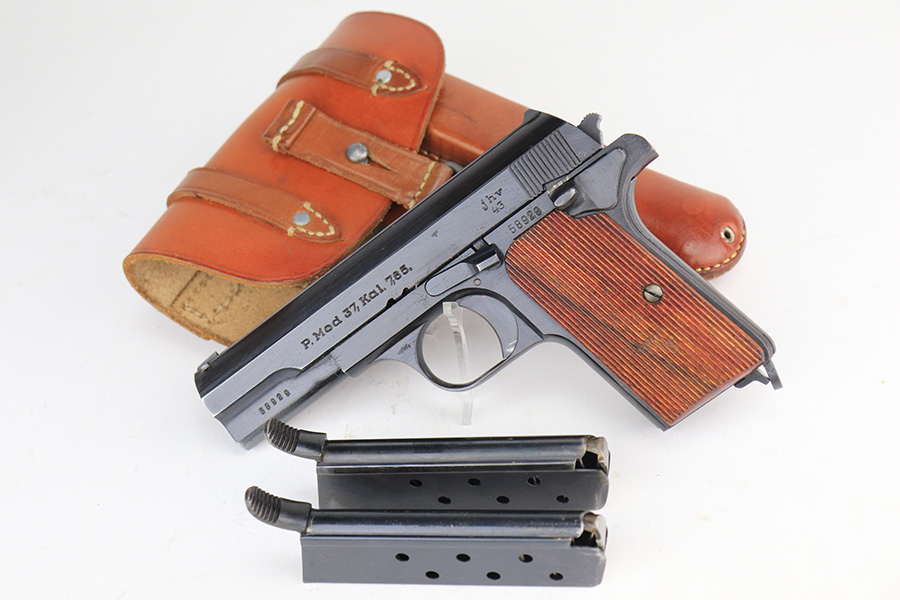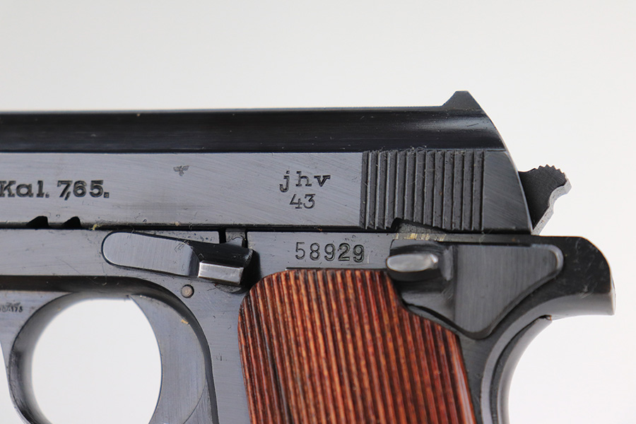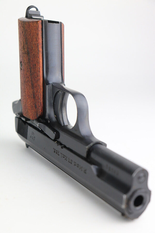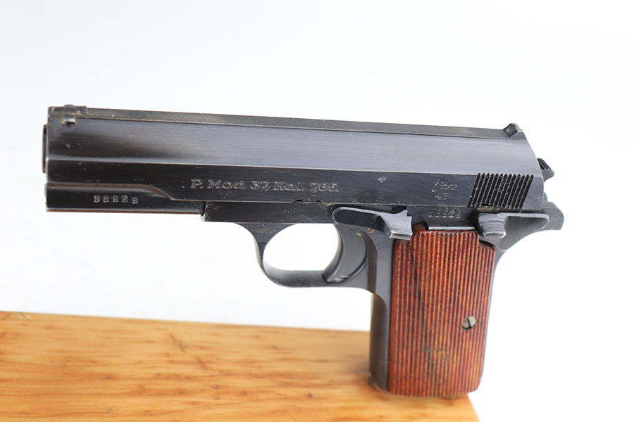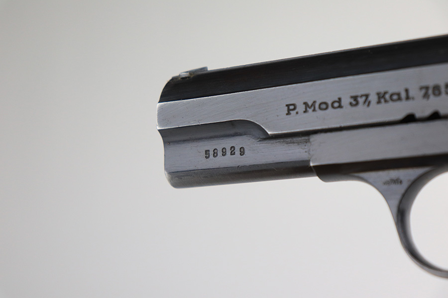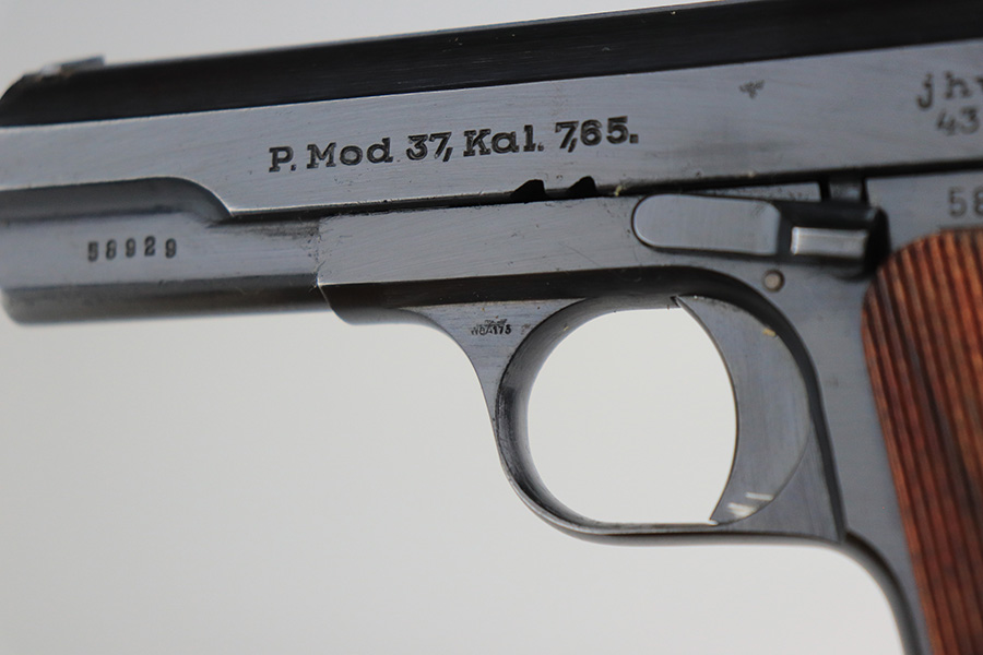 12/8/21 – This is a gorgeous example of a Femaru Model 37 issued to the Luftwaffe in 1943. It is all matching and has the proper Nazi military acceptance proof on the left side of the trigger guard. It comes as a rig with a mint Luftwaffe-marked 1942-dated holster (ink stamp on the inside completely intact), one original matching-numbered magazine, and one spare mismatched period-correct magazine. The gun is in mint condition, retaining virtually all of its bluing. There are just hints of wear on the slide and very tiny freckling on the front strap. It comes with excellent wood grips. The bore is mint.