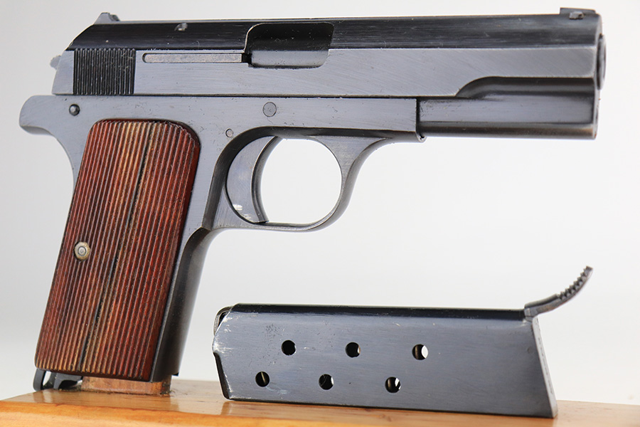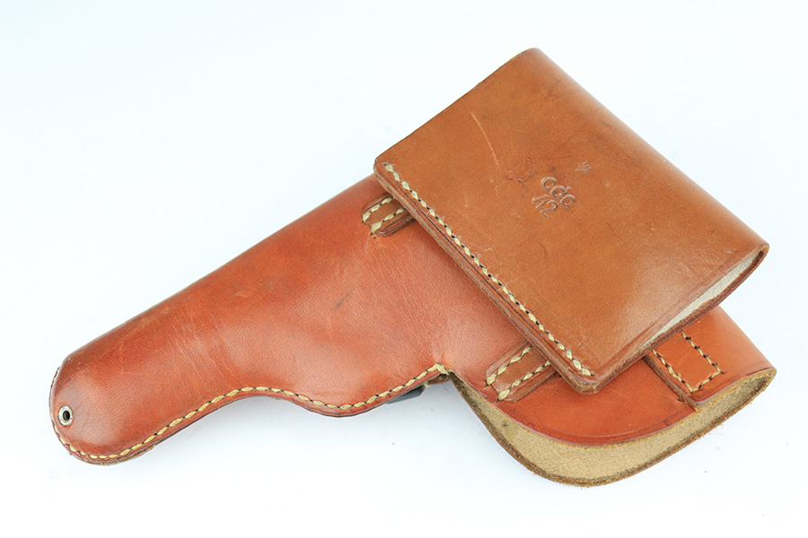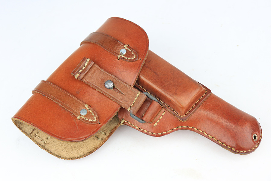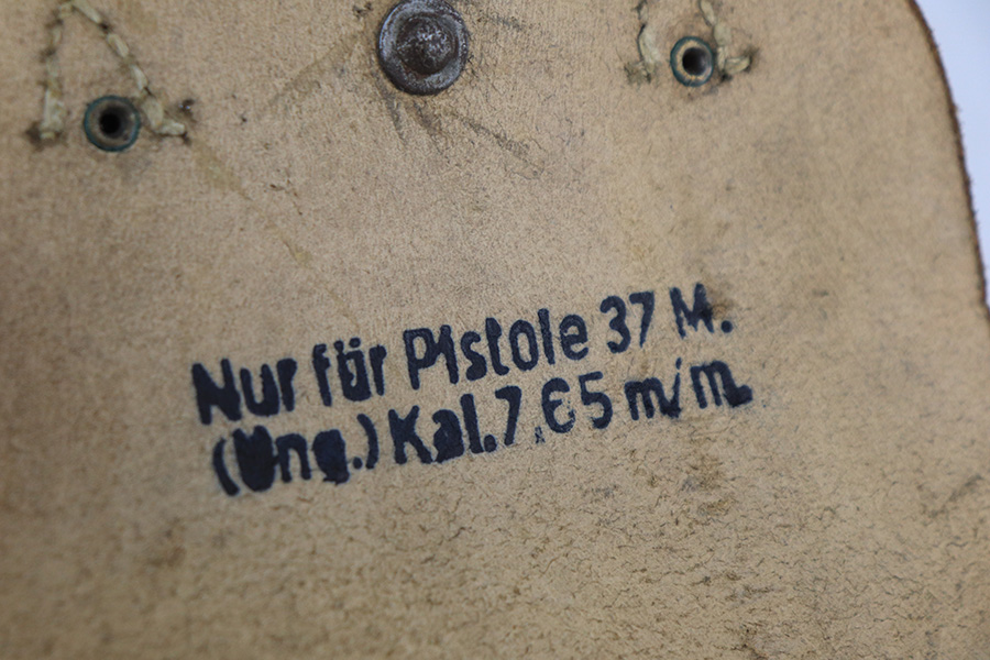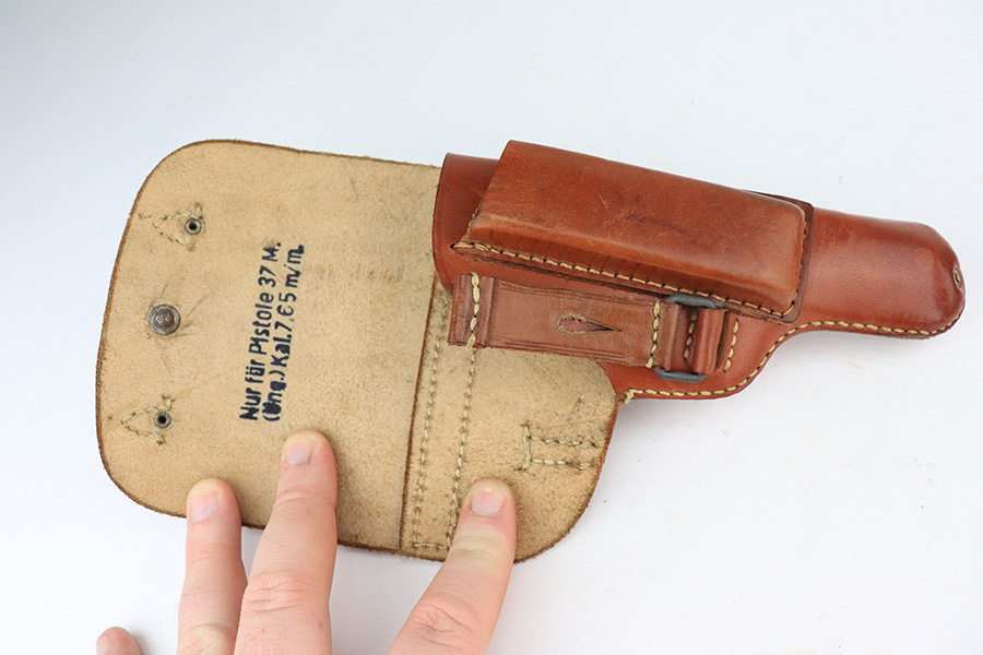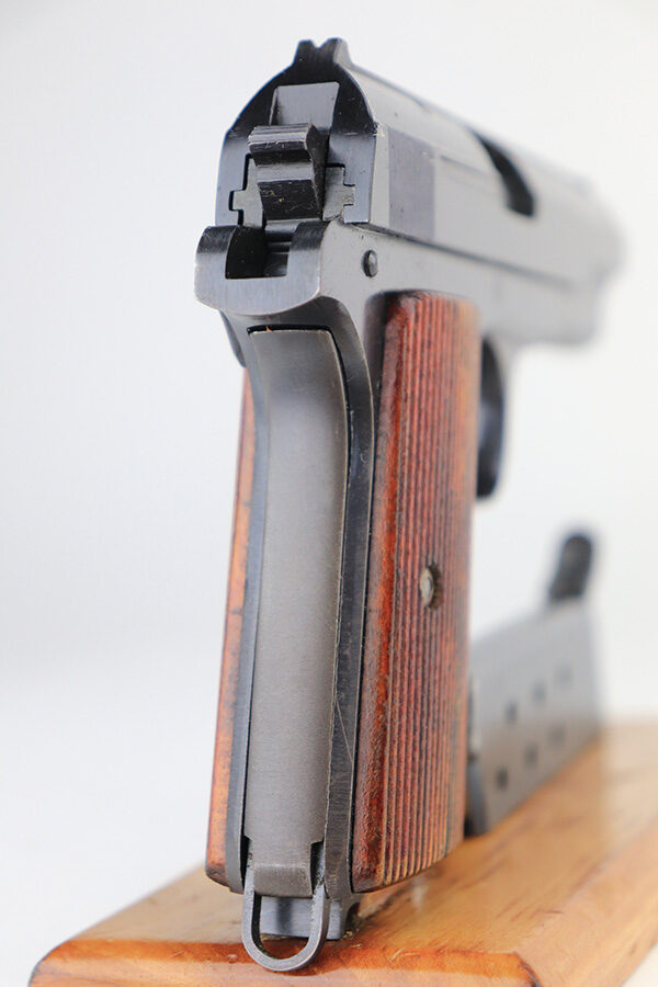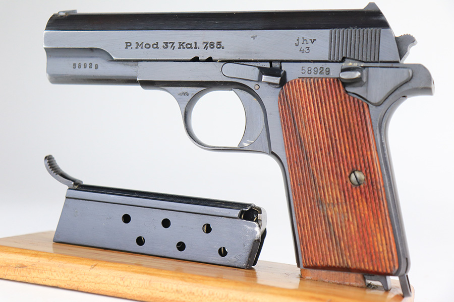 12/8/21 – This is a gorgeous example of a Femaru Model 37 issued to the Luftwaffe in 1943. It is all matching and has the proper Nazi military acceptance proof on the left side of the trigger guard. It comes as a rig with a mint Luftwaffe-marked 1942-dated holster (ink stamp on the inside completely intact), one original matching-numbered magazine, and one spare mismatched period-correct magazine. The gun is in mint condition, retaining virtually all of its bluing. There are just hints of wear on the slide and very tiny freckling on the front strap. It comes with excellent wood grips. The bore is mint.