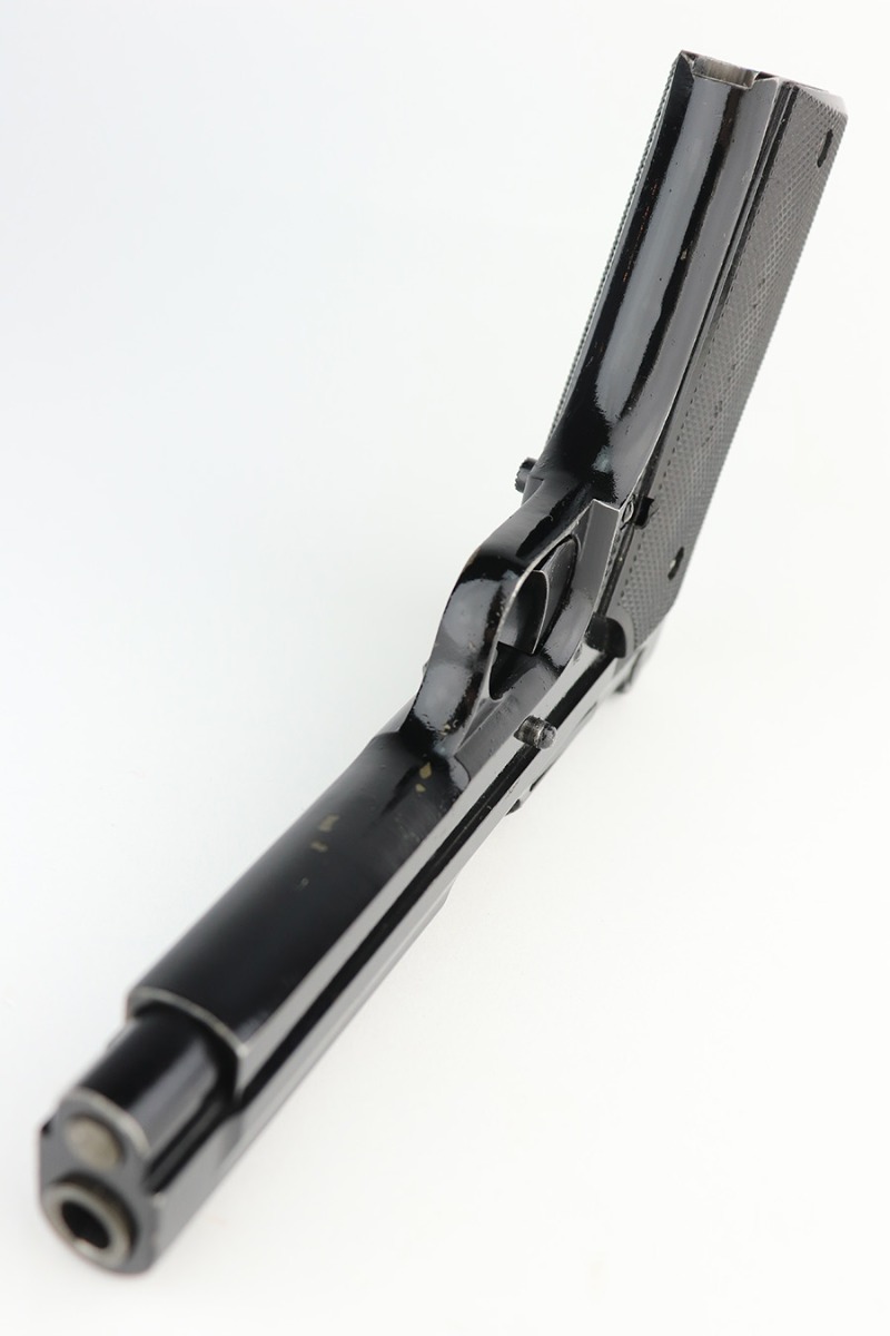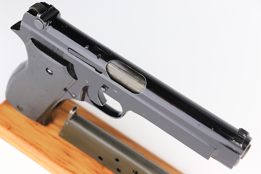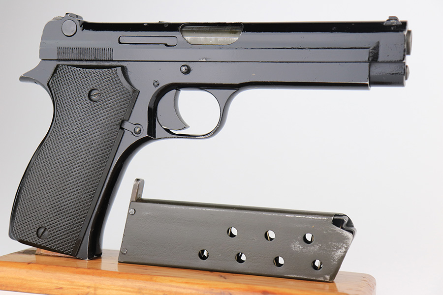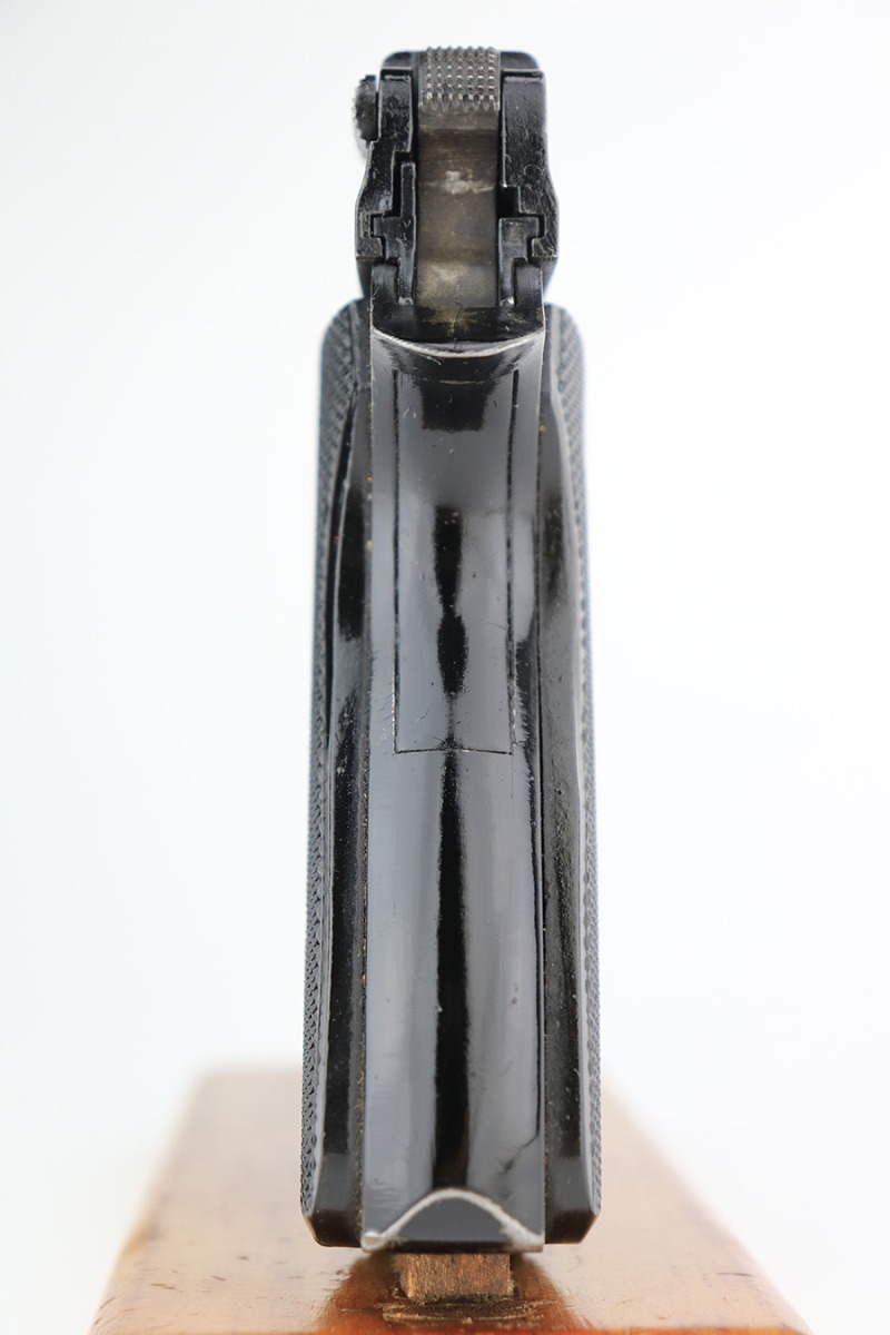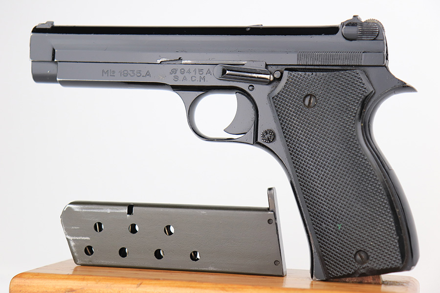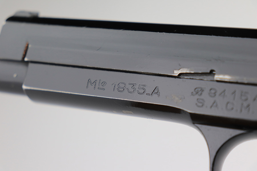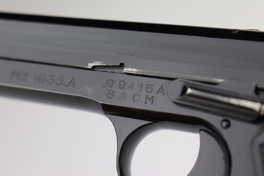 3/3/23 – This is a gorgoeous example of a French SACM Model 1935A issued to the Nazi military during WW2. It is all matching and has the proper Waffen military acceptance proof on the left side of the frame. There is almost no actual finish loss in its black enamel painted finish, just a couple of tiny chips and handling marks here and there along the slide. Comes with nice period-correct black plastic grips (some minor chipping at the bottom edge of the left grip) and a proper magazine. The bore is factory-new.