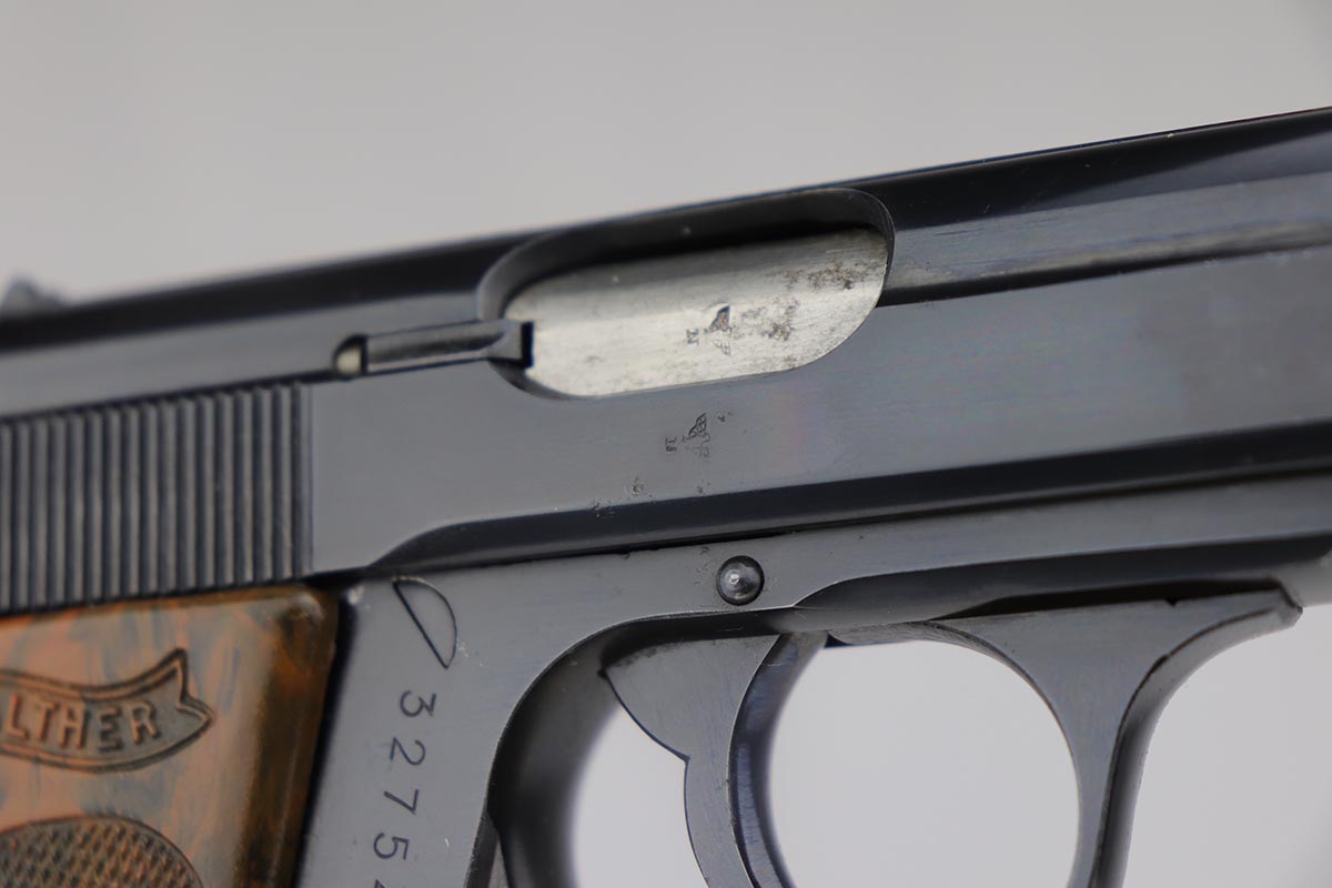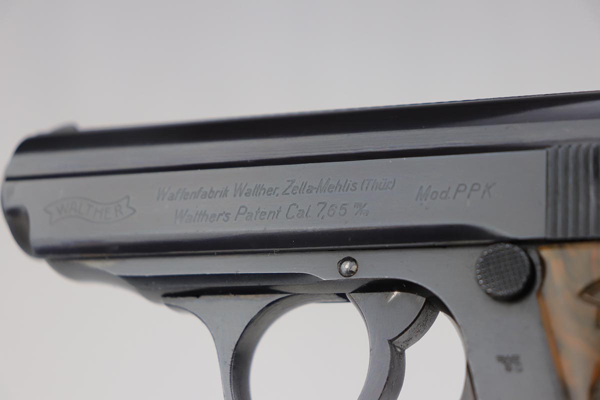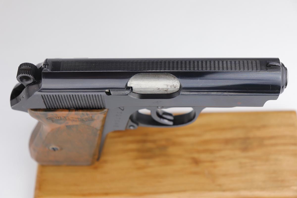 7/22/19 – This is a scarce variation of a Police issued Walther PPK, in minty, original condition. The pistol is an uncommon find as it has a high-polish blued finish, but Eagle/N proofs. Only a small fraction of the police-issued Walther PPKs had those features. The bluing on this pistol rates at 98-99% with minor muzzle wear, and a spot of discoloration on the right side of the slide. Mint bore and similarly terrific grip. Correct, early banner magazine.