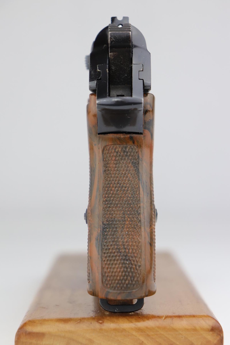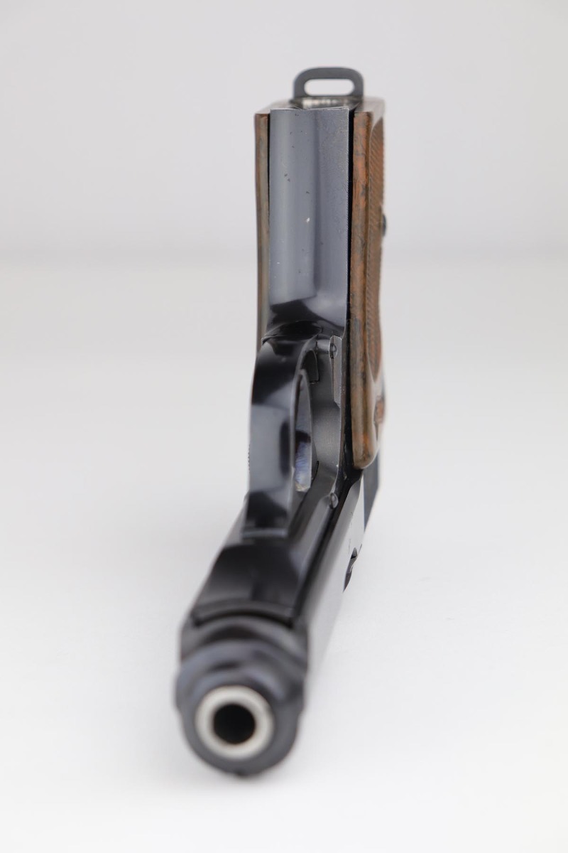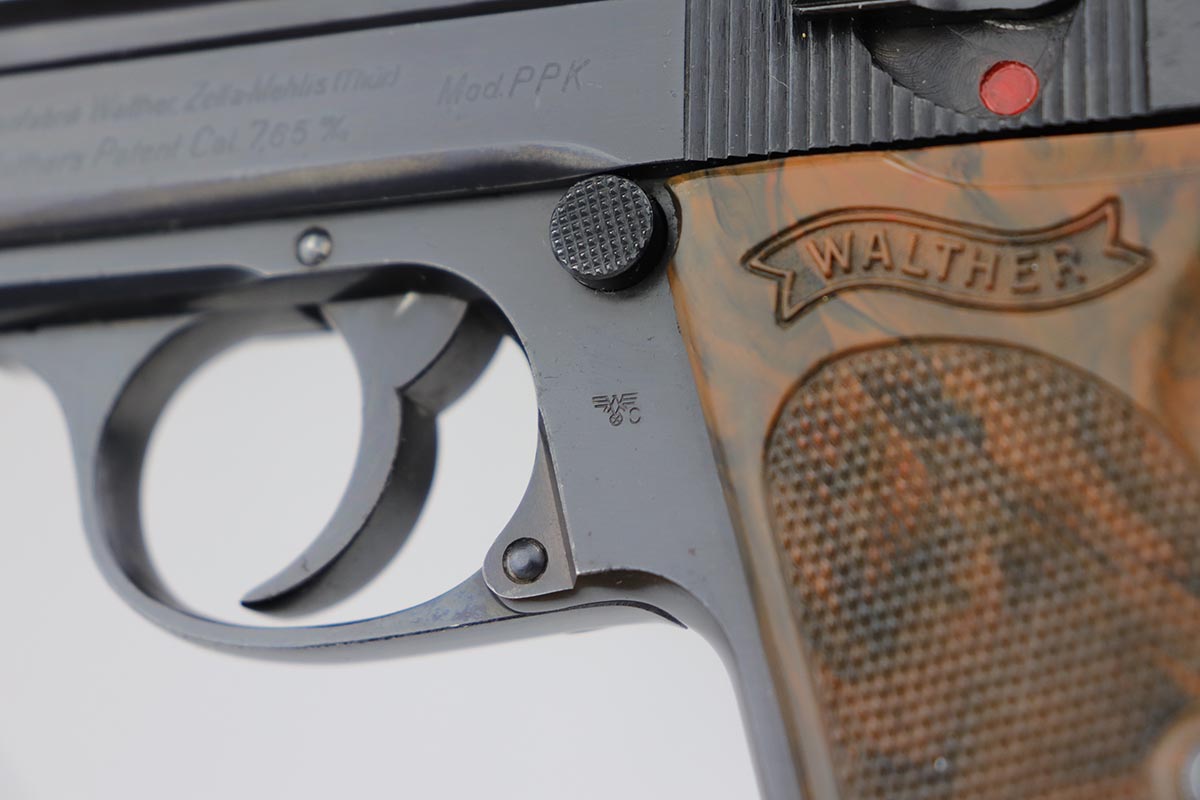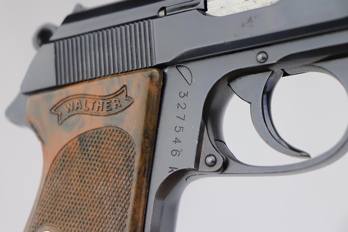 7/22/19 – This is a scarce variation of a Police issued Walther PPK, in minty, original condition. The pistol is an uncommon find as it has a high-polish blued finish, but Eagle/N proofs. Only a small fraction of the police-issued Walther PPKs had those features. The bluing on this pistol rates at 98-99% with minor muzzle wear, and a spot of discoloration on the right side of the slide. Mint bore and similarly terrific grip. Correct, early banner magazine.
