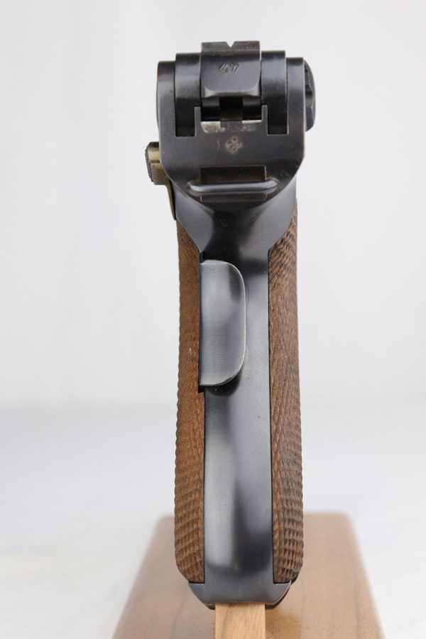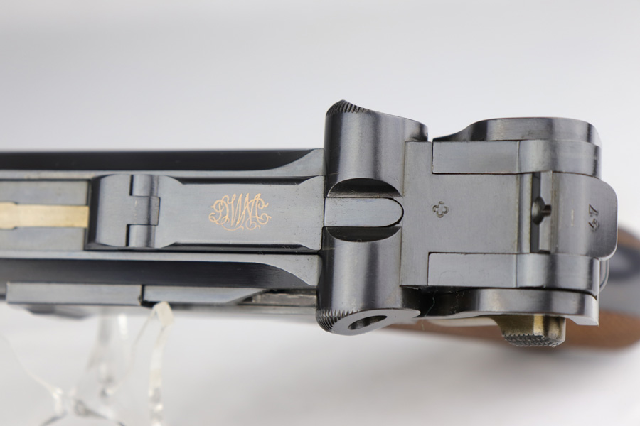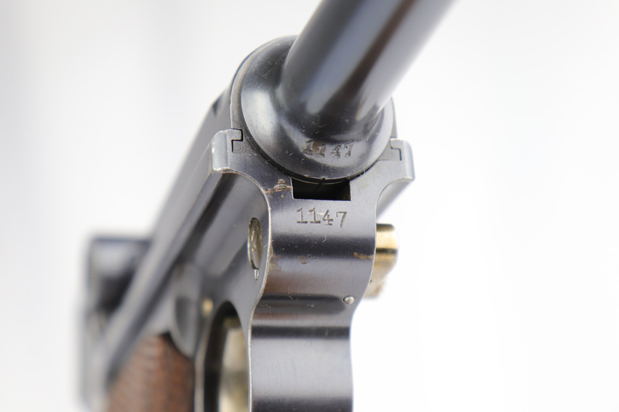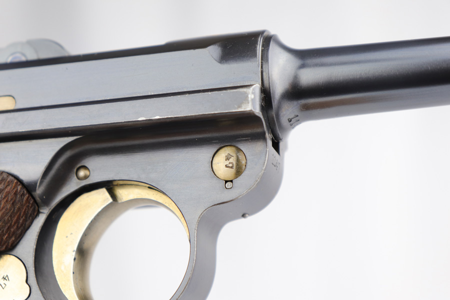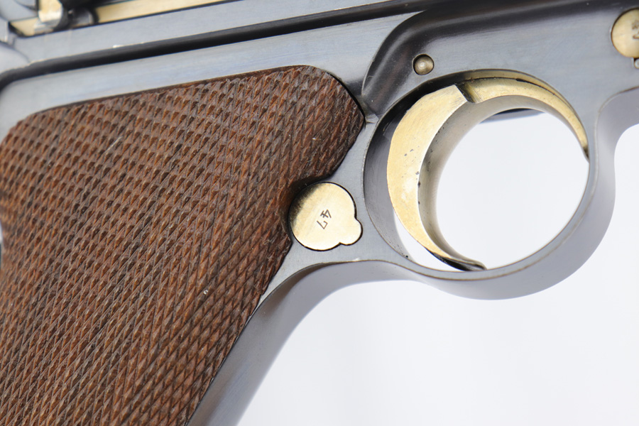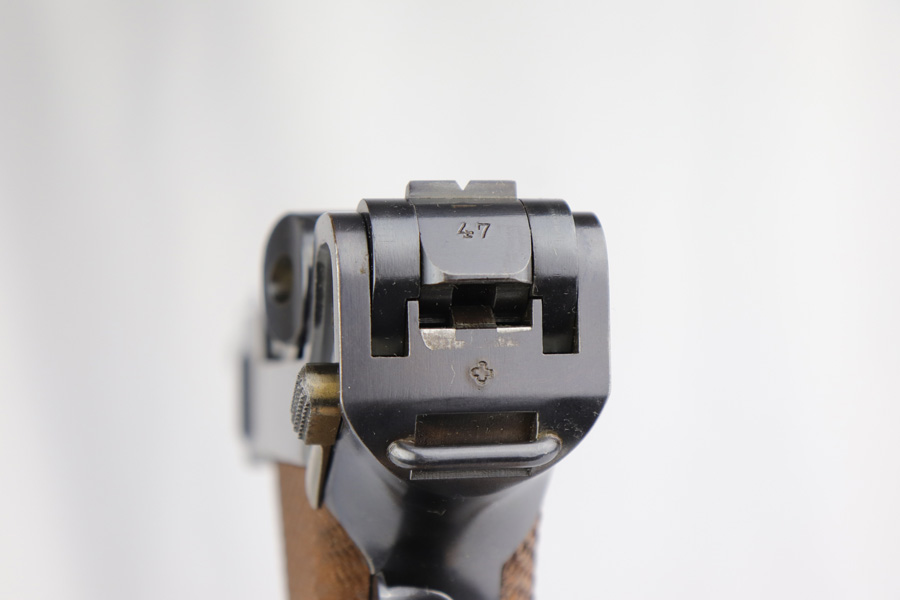 2/28/19 – This is a fantastic example of an early production 1900 Swiss Contract Luger of which an estimated 2,000 commercial and 3,000 military pistols were produced. These pistols were the real first contract by the Swiss government for the Luger pistol produced in a specific serial number range with both the military and commercial sales being in this range. These pistols have the early features such as the dished toggles with toggle lock, the flat/recessed breech bolt, no stock lug, grip safety, flat main springs, and fast taper barrel that is 4 3/4″ long. This pistol also has fixed blade and “V” notch sights, standard Swiss cross in sunburst on the chamber, and “DWM” scroll toggle marking. Full serial number on the front of the frame and barrel underside, with the partial serial number (47) on the takedown latch, side plate, and toggle link. Blue finish with straw colored small parts. Sharp, unnumbered grips. Includes two correct style nickel plated unmarked magazine with wood base. The finish rates at around 98-99% with minor edge wear and a spot of finish loss on the front strap. Excellent bore.