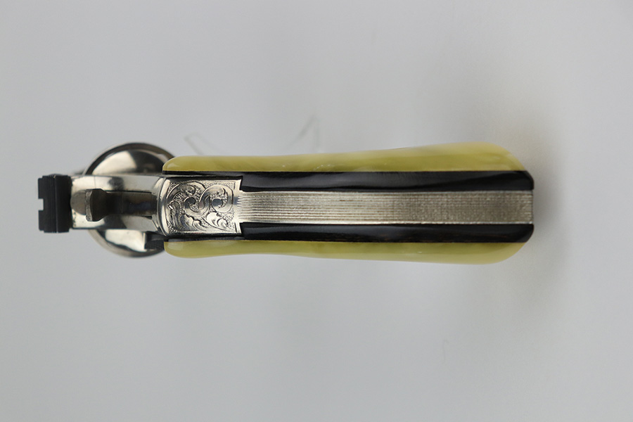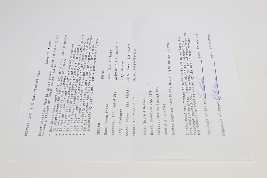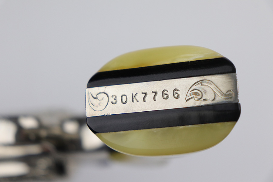 9/3/21 – This is a gorgeous and interesting Smith & Wesson model 15-4 revolver that was owned by master engraver Leon White. The listing includes an original bill of sale from Leon to the father of our consignor, and states that Mr. White personally engraved it himself in the Moors style. Leon White learned under nationally known Cole Agee, and the listing also includes a copy of a newspaper article about White. The gun itself is in mint condition, there is no wear or scuffs, no turn line on cylinder, and the bore is mint. Engraving covers 80-90% of the metal surfaces and the work is high quality. White’s work has been featured in magazines and books, and this revolver shows why. Other features include mother of pearl grips and a 4in barrel. FFL required.