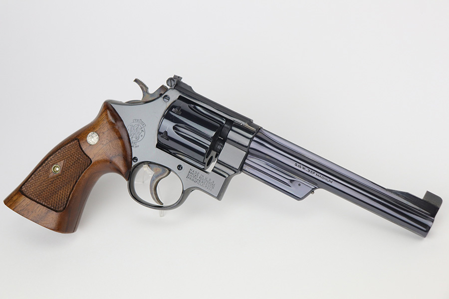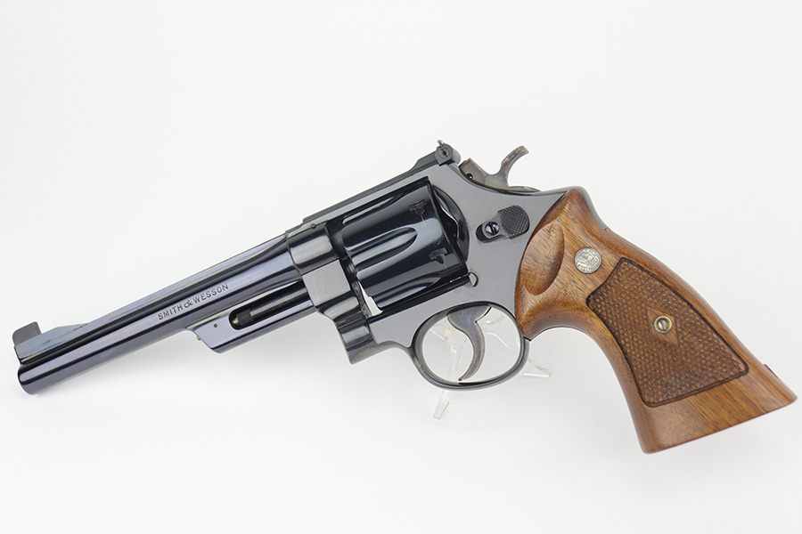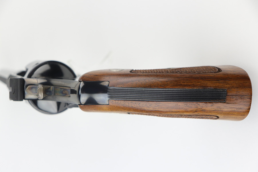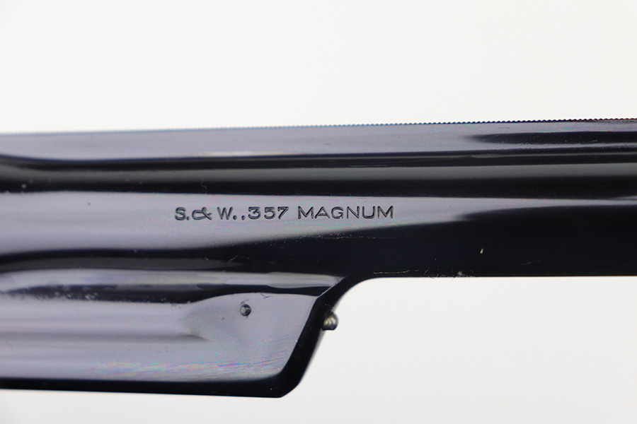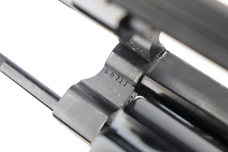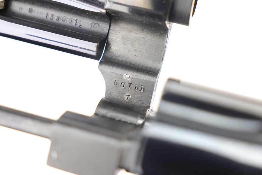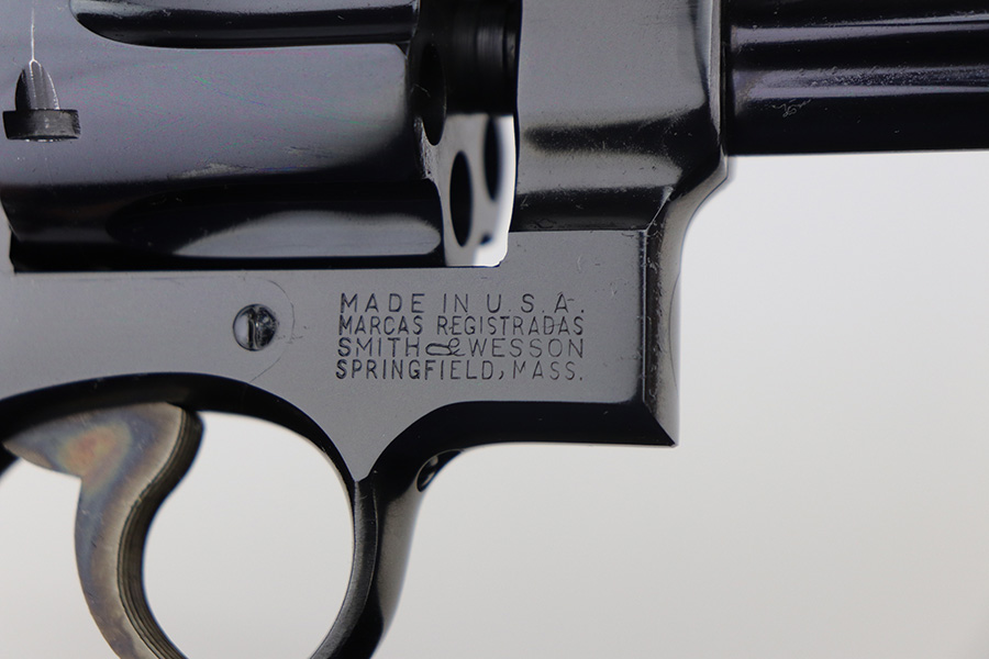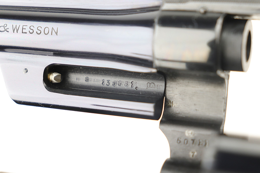3/15/23 – This is a gorgeous example of an original Smith & Wesson Pre-27 revolver from late 1954. All matching and original with 98-99% of the blue remaining. There’s a minor turn line on the cylinder, a couple of minuscule scratches on the left side of the barrel, and the front sight has been painted. Beautiful case hardening on the hammer and trigger. Excellent original grips with minimal handling wear. Barrel is 6.5in with a minty bore. Smooth action, with proper timing and lockup.