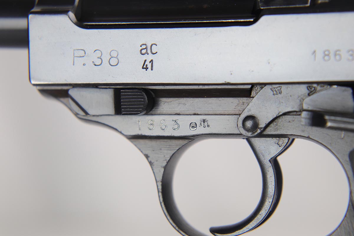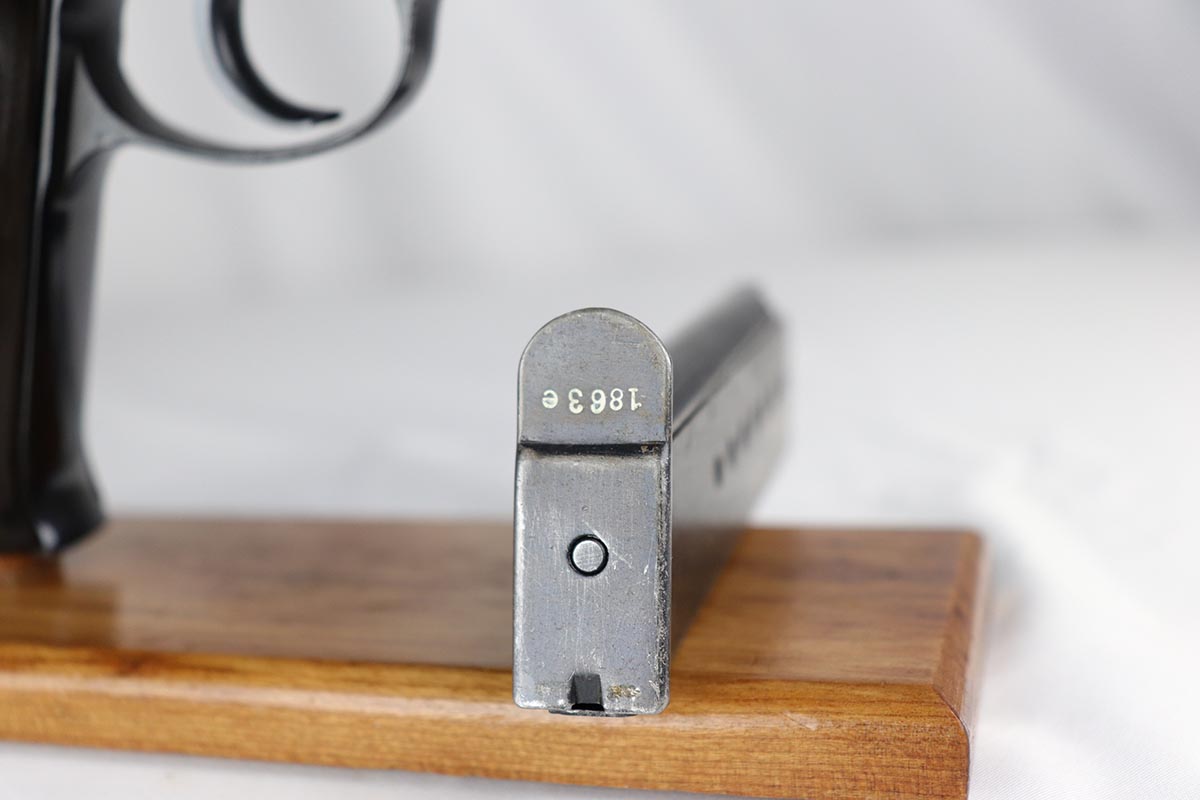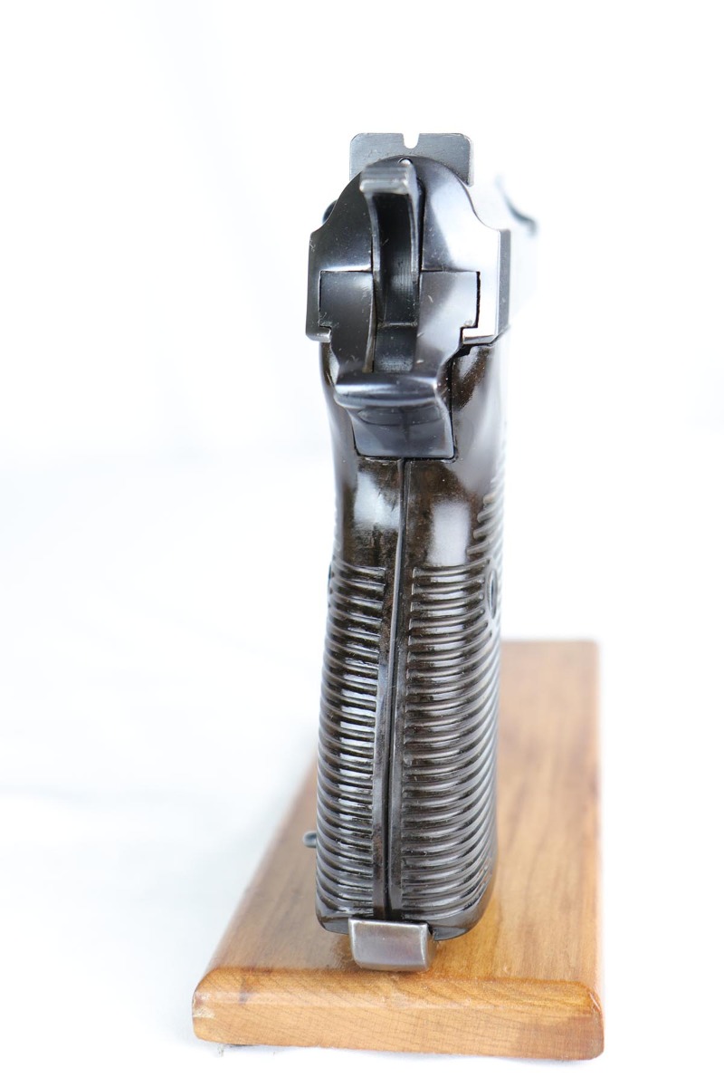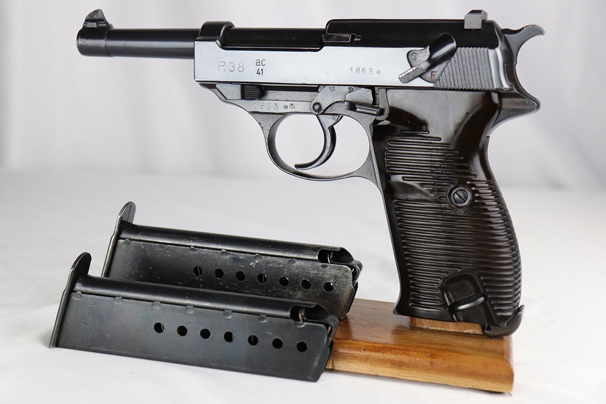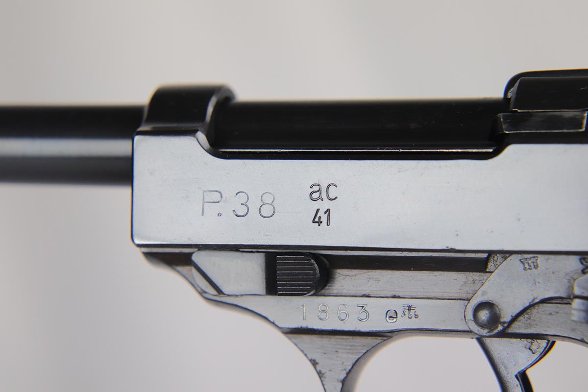 4/12/18 – This is a near-mint Walther P.38 from 1941, with about 98% original high-polish blue.  This is a second variation ac 41, with minor freckling on the trigger guard and minor edge wear on the left side of the pistol, and the top of the barrel.  The magazine is numbered to the pistol, but it does appear to have been done post-factory.  NOTE THAT ONLY THE NUMBERED MAG IS INCLUDED IN THIS LISTING.  The grips are unnumbered and waffen marked.  The bore is mint!