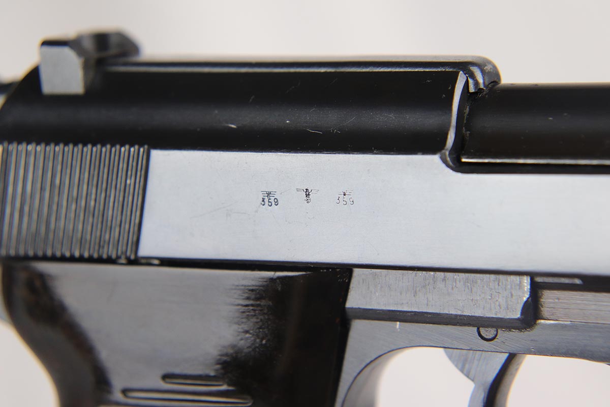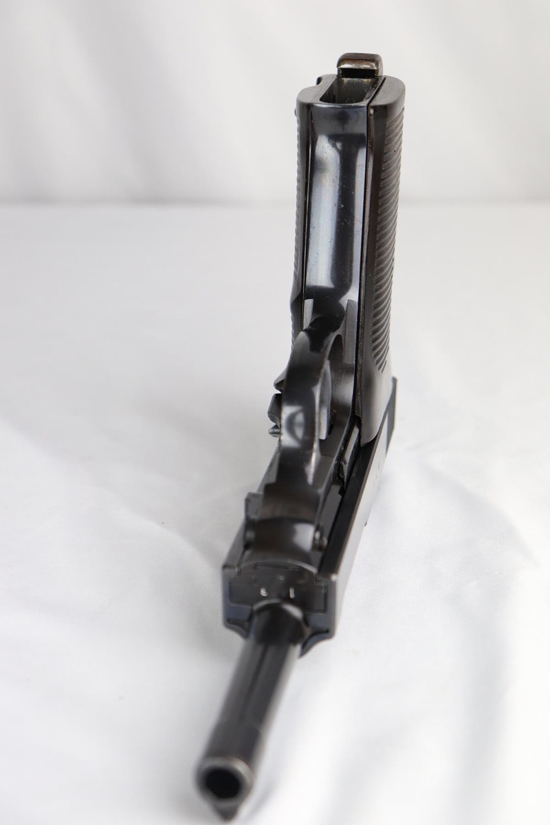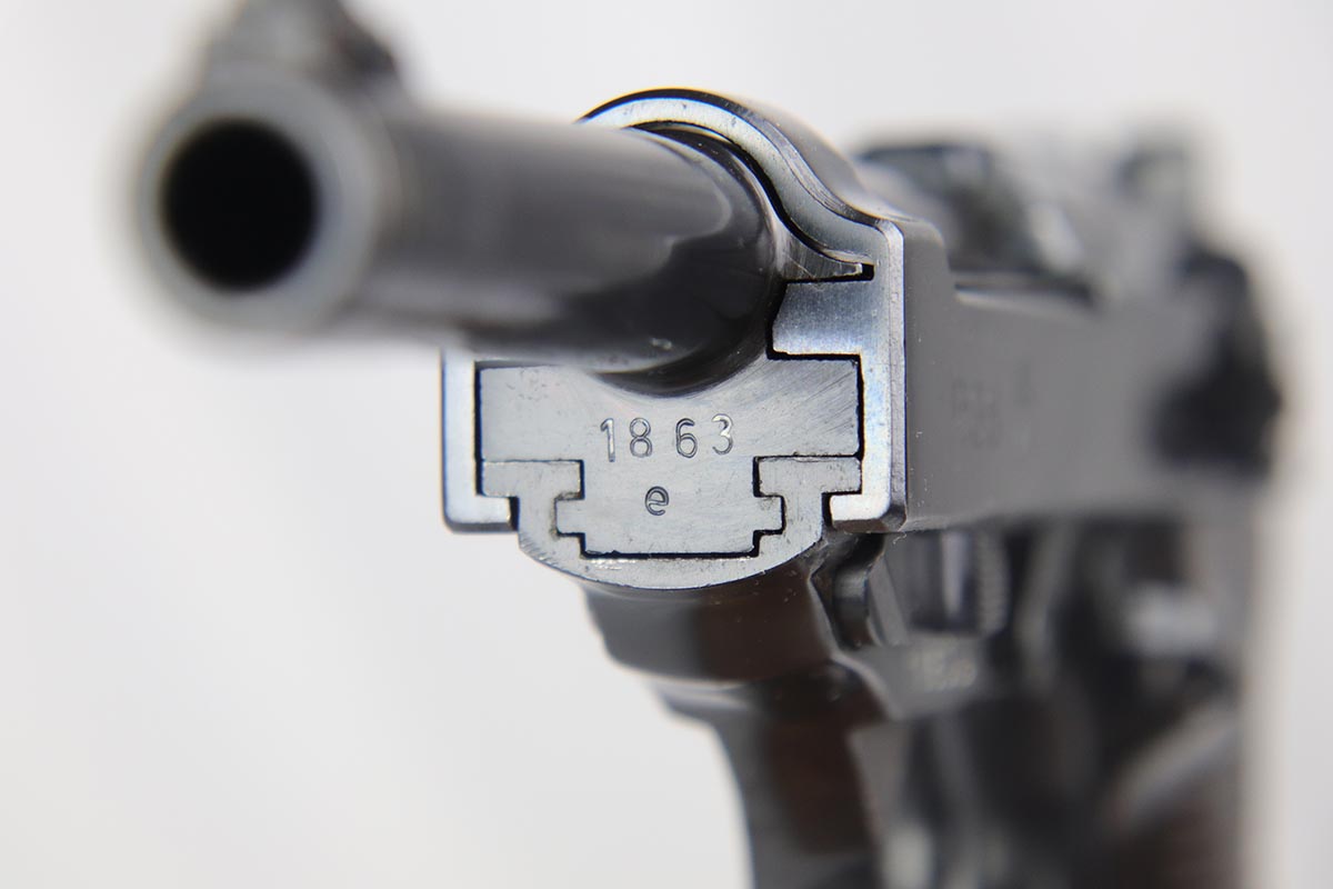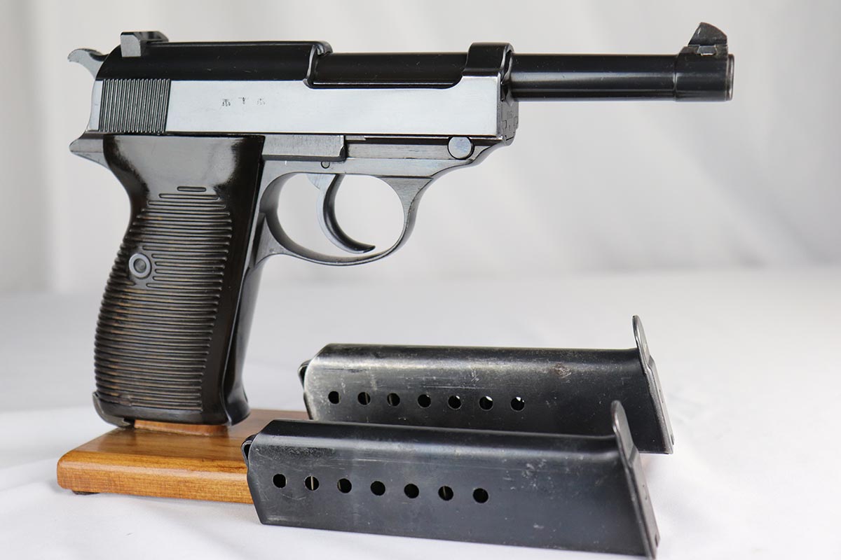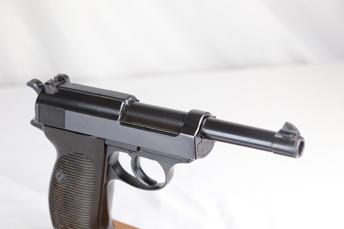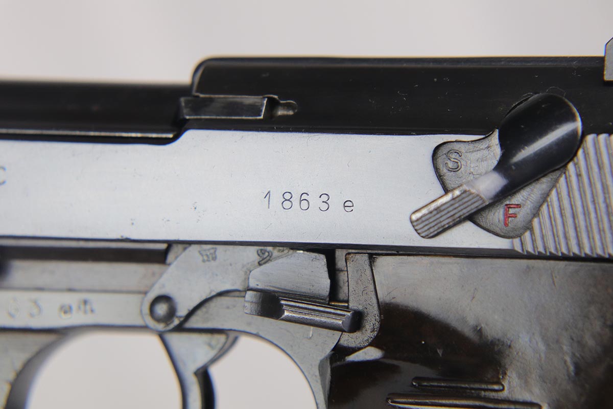 4/12/18 – This is a near-mint Walther P.38 from 1941, with about 98% original high-polish blue.  This is a second variation ac 41, with minor freckling on the trigger guard and minor edge wear on the left side of the pistol, and the top of the barrel.  The magazine is numbered to the pistol, but it does appear to have been done post-factory.  NOTE THAT ONLY THE NUMBERED MAG IS INCLUDED IN THIS LISTING.  The grips are unnumbered and waffen marked.  The bore is mint!