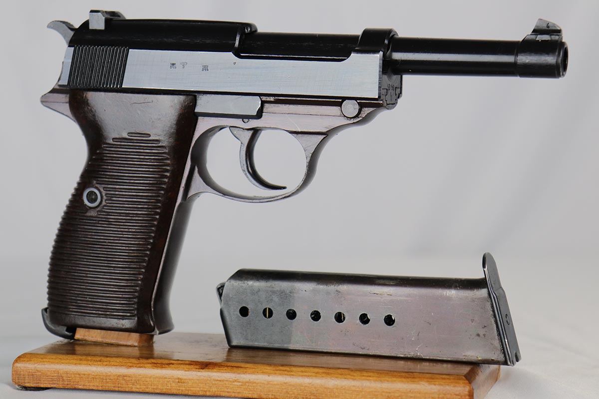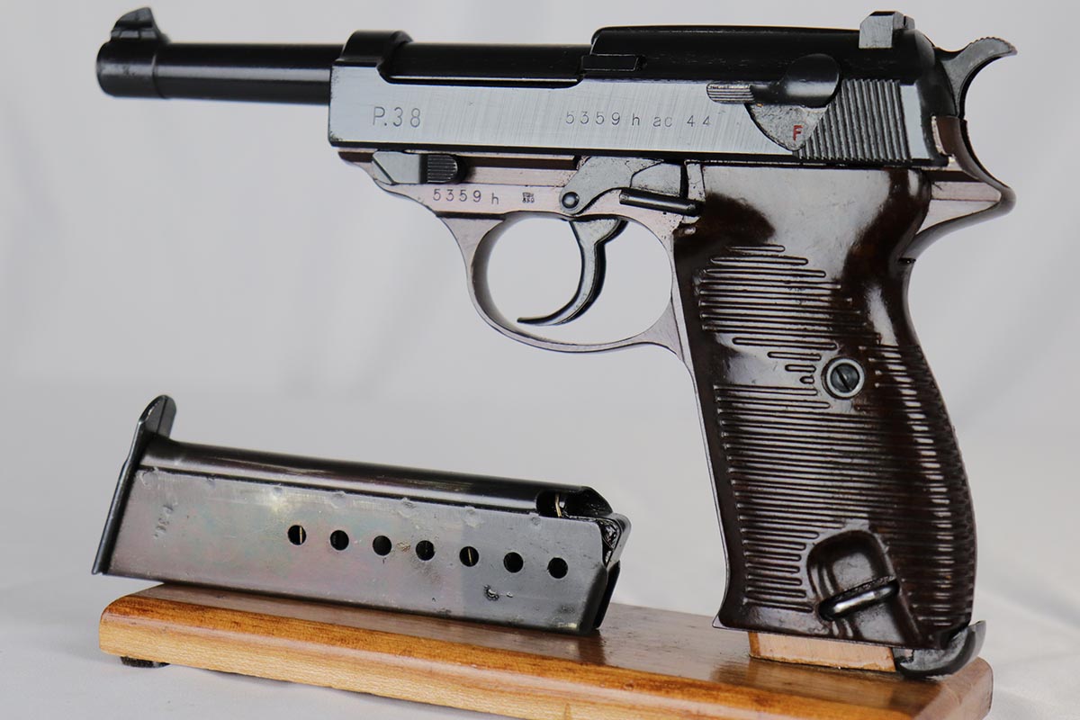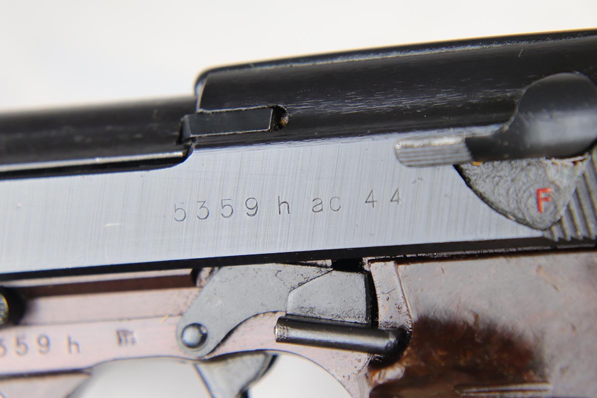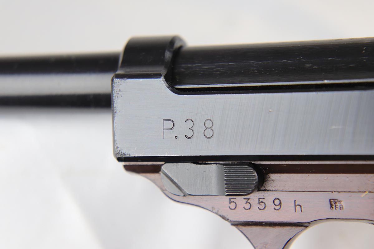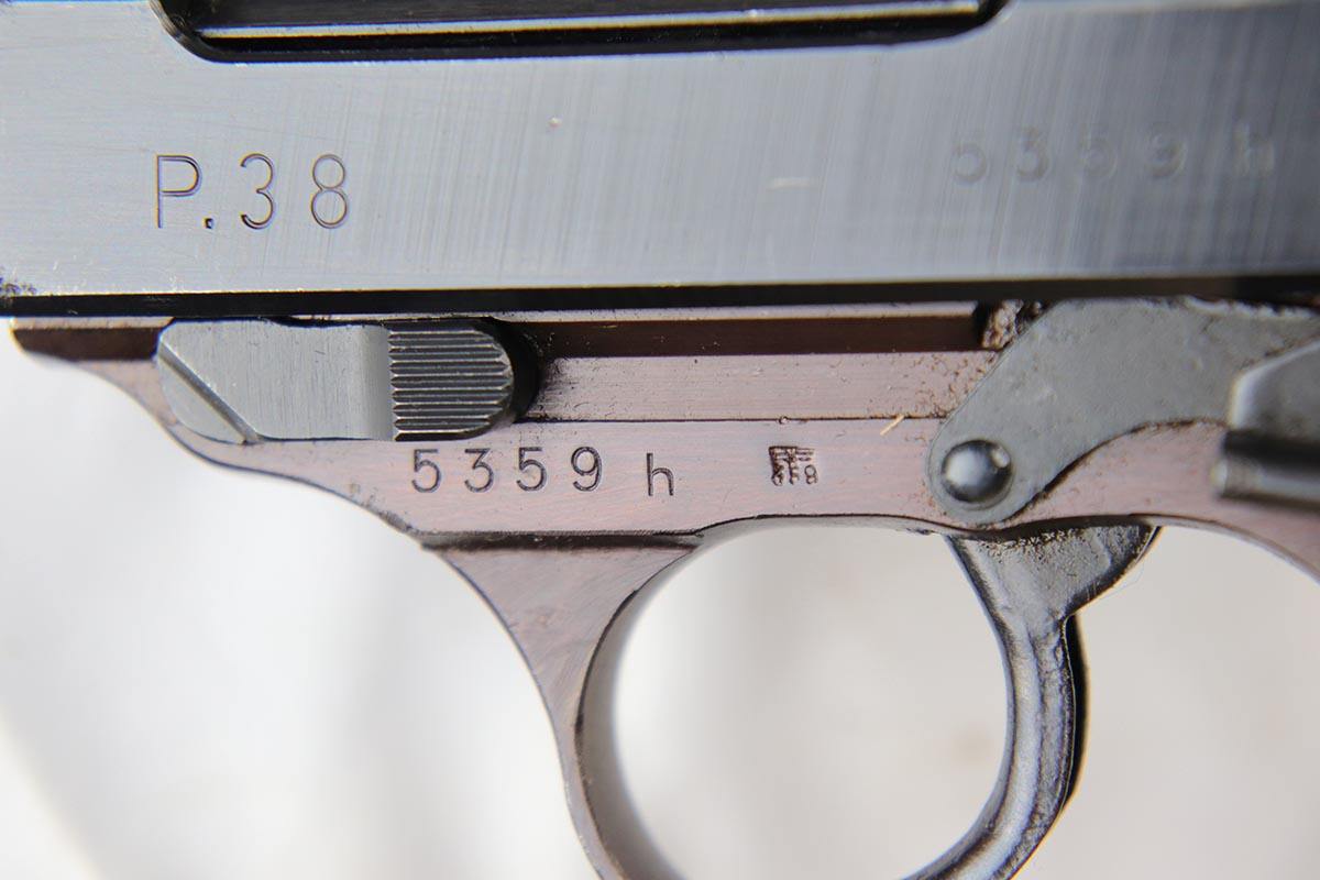 5/15/18 – This is a gorgeous Walther P.38 from 1944 that has about 97-98% original finish remaining.  The slide/profile is gorgeous, with a plum hue to the frame.  All matching parts, with minty bore and grips.  There is slight thinning on the front strap and a small casting flaw on the trigger guard.  Walther magazine.