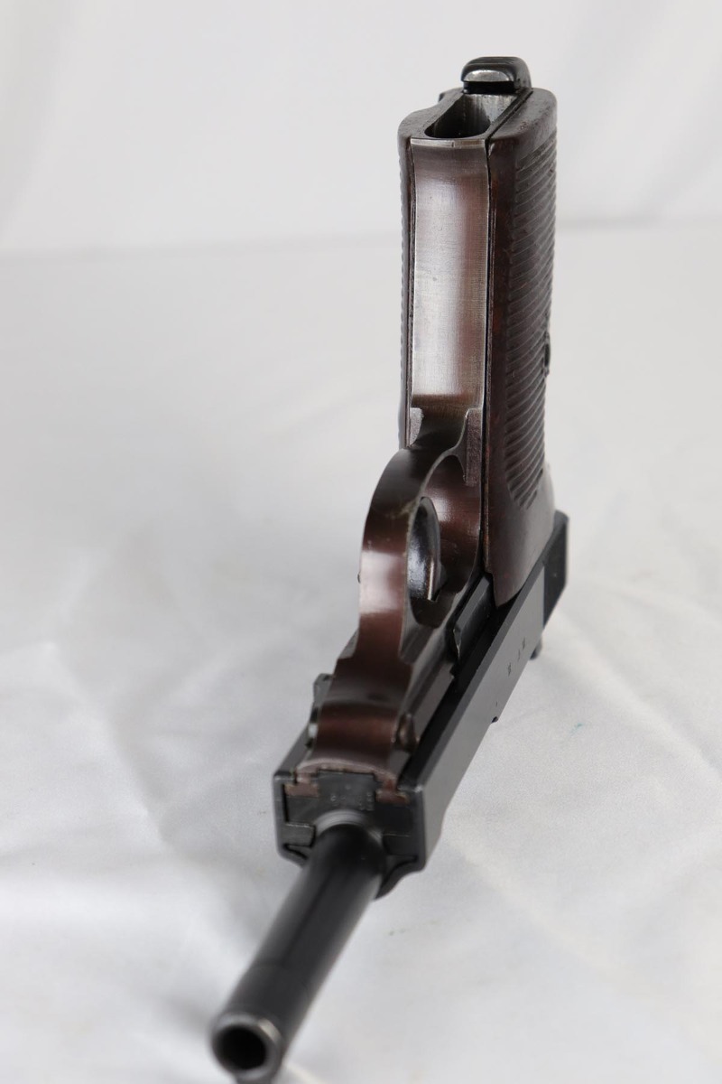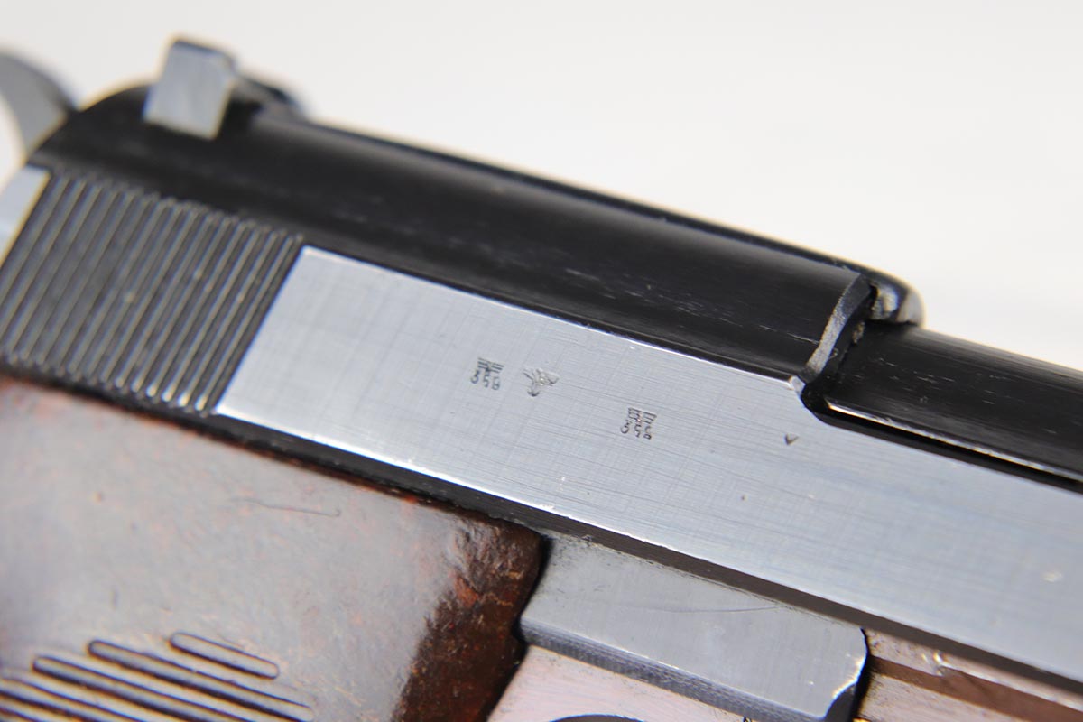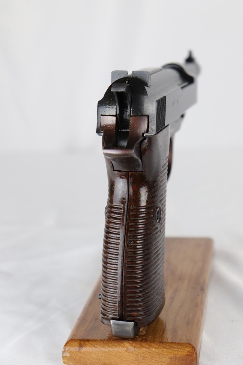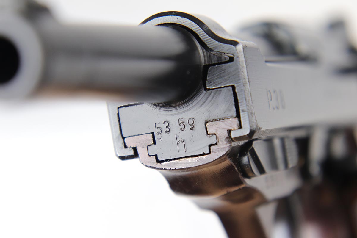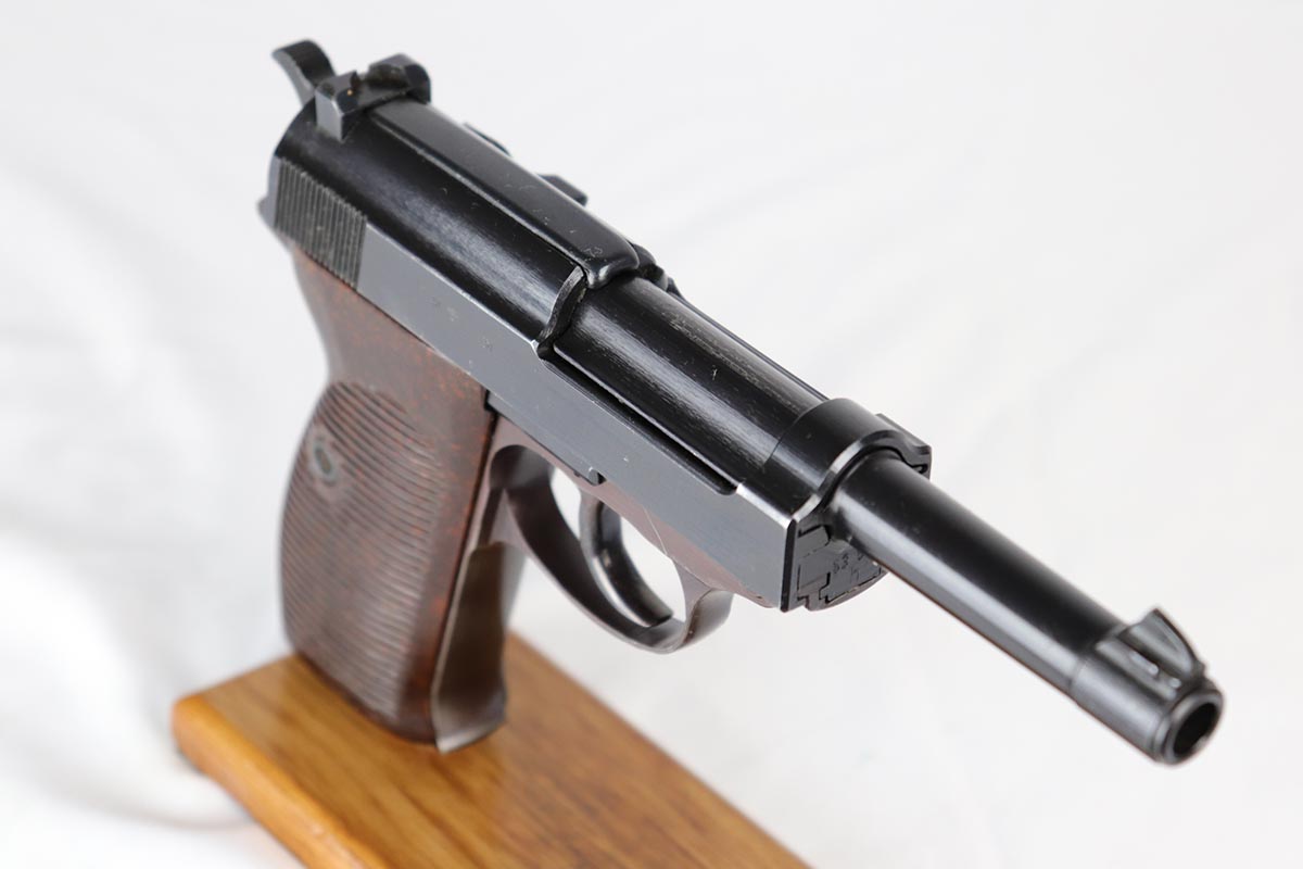 5/15/18 – This is a gorgeous Walther P.38 from 1944 that has about 97-98% original finish remaining.  The slide/profile is gorgeous, with a plum hue to the frame.  All matching parts, with minty bore and grips.  There is slight thinning on the front strap and a small casting flaw on the trigger guard.  Walther magazine.