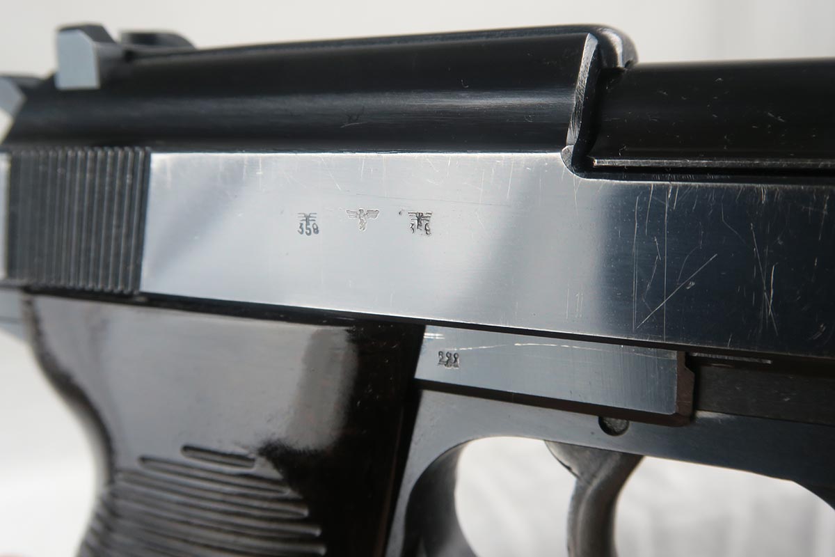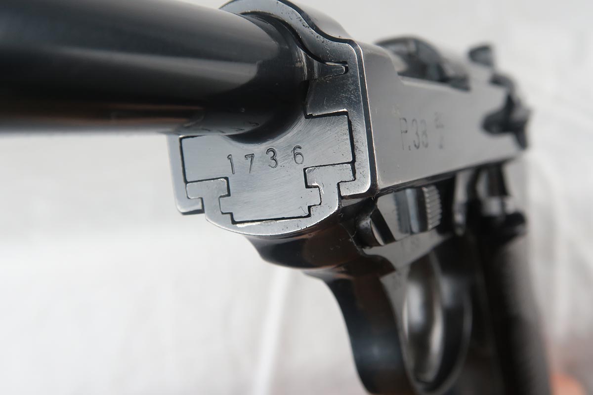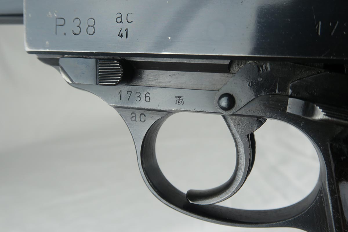 2/19/19 – This is a gorgeous, high-polish Walther P.38 from 1941. It is a first variation ac 41, meaning polished blue and ‘ac’ proof on trigger guard. Gun is all matching and all small parts are waffen proofed, as they should be. The grips are waffen proofed but not numbered, and the magazine is correct and numbered but to a different pistol. The original finish rates at about 97% with high edge wear on the slide. Mint bore.