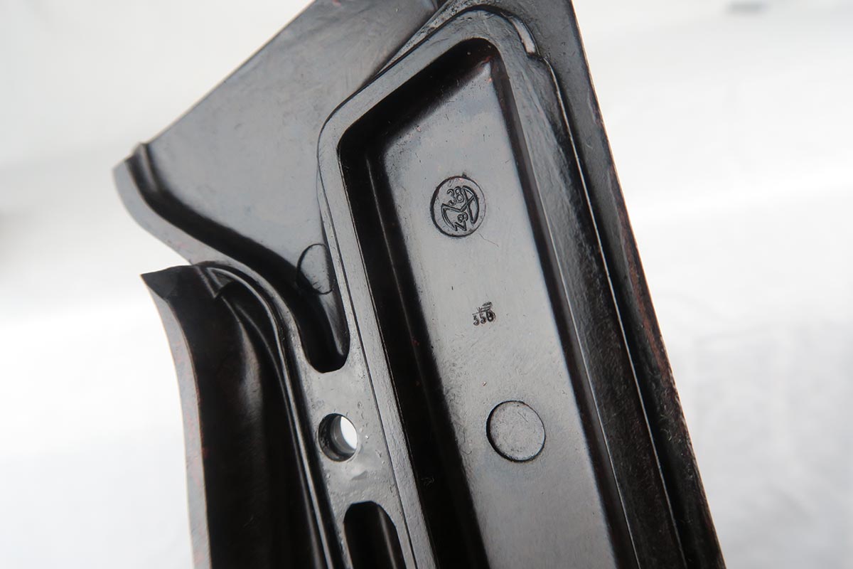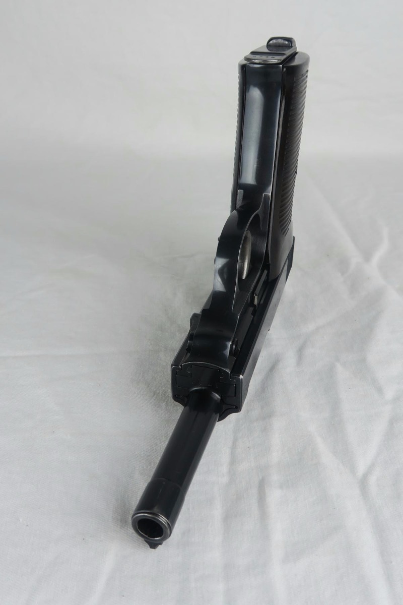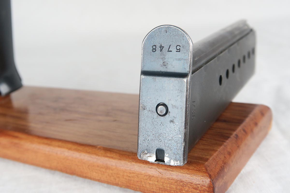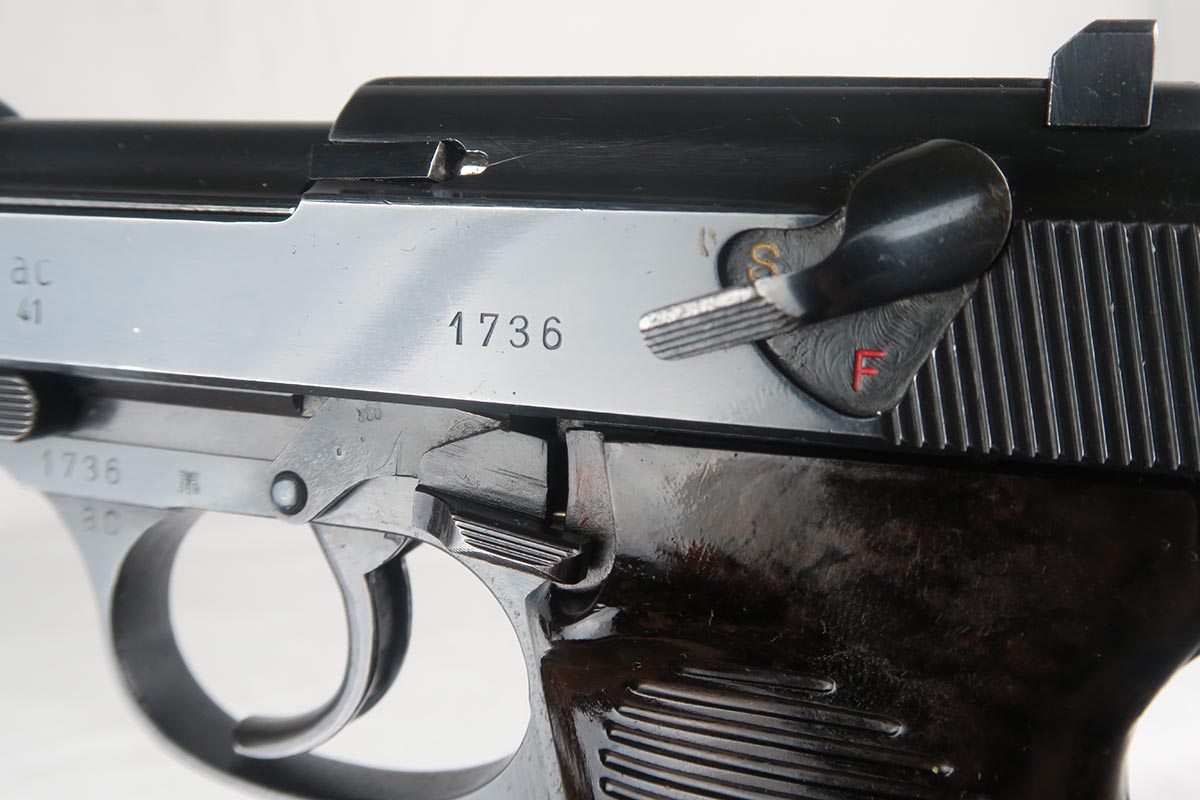 2/19/19 – This is a gorgeous, high-polish Walther P.38 from 1941. It is a first variation ac 41, meaning polished blue and ‘ac’ proof on trigger guard. Gun is all matching and all small parts are waffen proofed, as they should be. The grips are waffen proofed but not numbered, and the magazine is correct and numbered but to a different pistol. The original finish rates at about 97% with high edge wear on the slide. Mint bore.