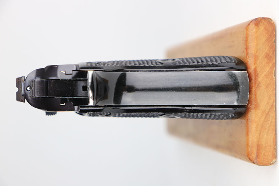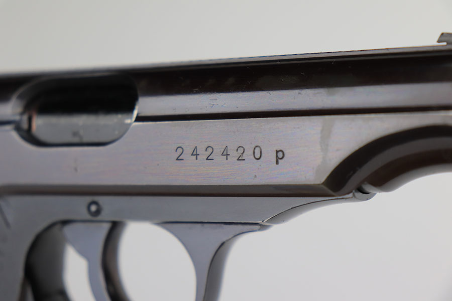 1/8/21 – This is a fantastic Walther PP from 1942 with desirable and uncommon aluminum frame. The polished finish shows minor muzzle wear on the slide, tiny bits of edge wear on the straps, and a small spot of discoloration on the right side of the slide. It’s in fantastic condition overall, though, and has a nice plum hue to the slide. Mint bore and very nice grips. Finger extension magazine.