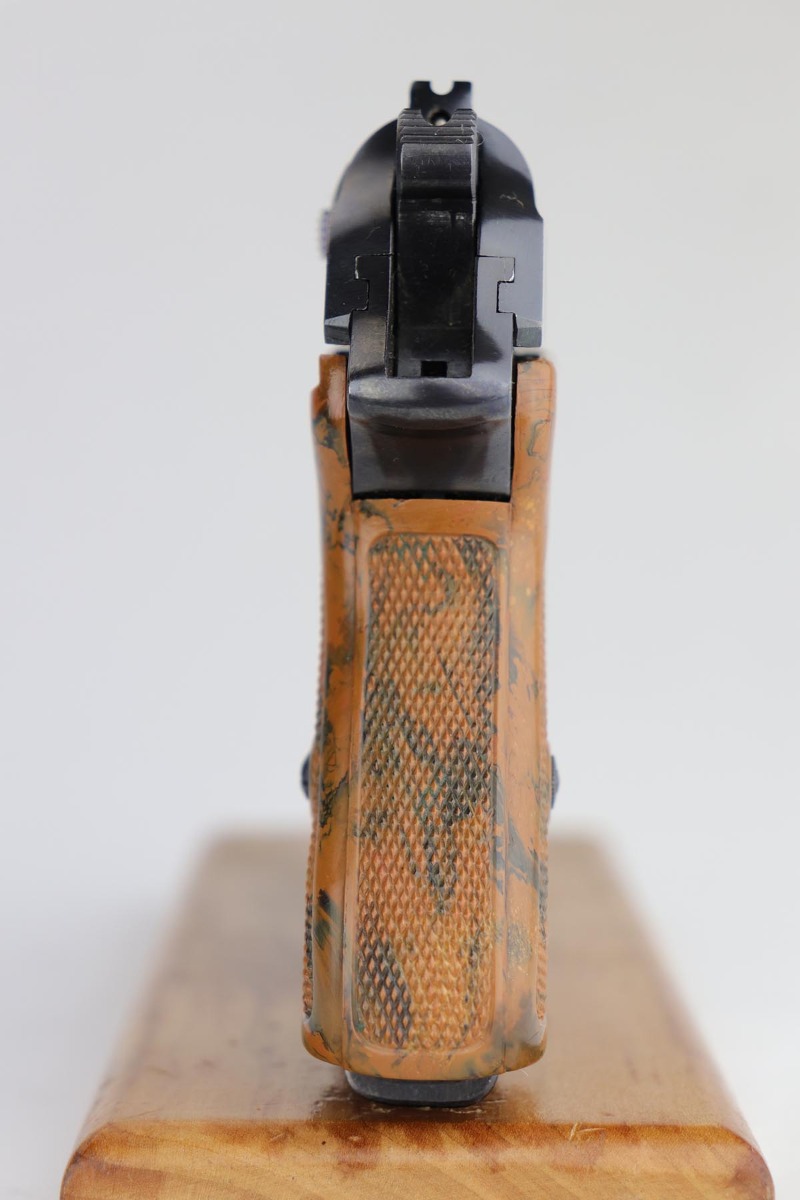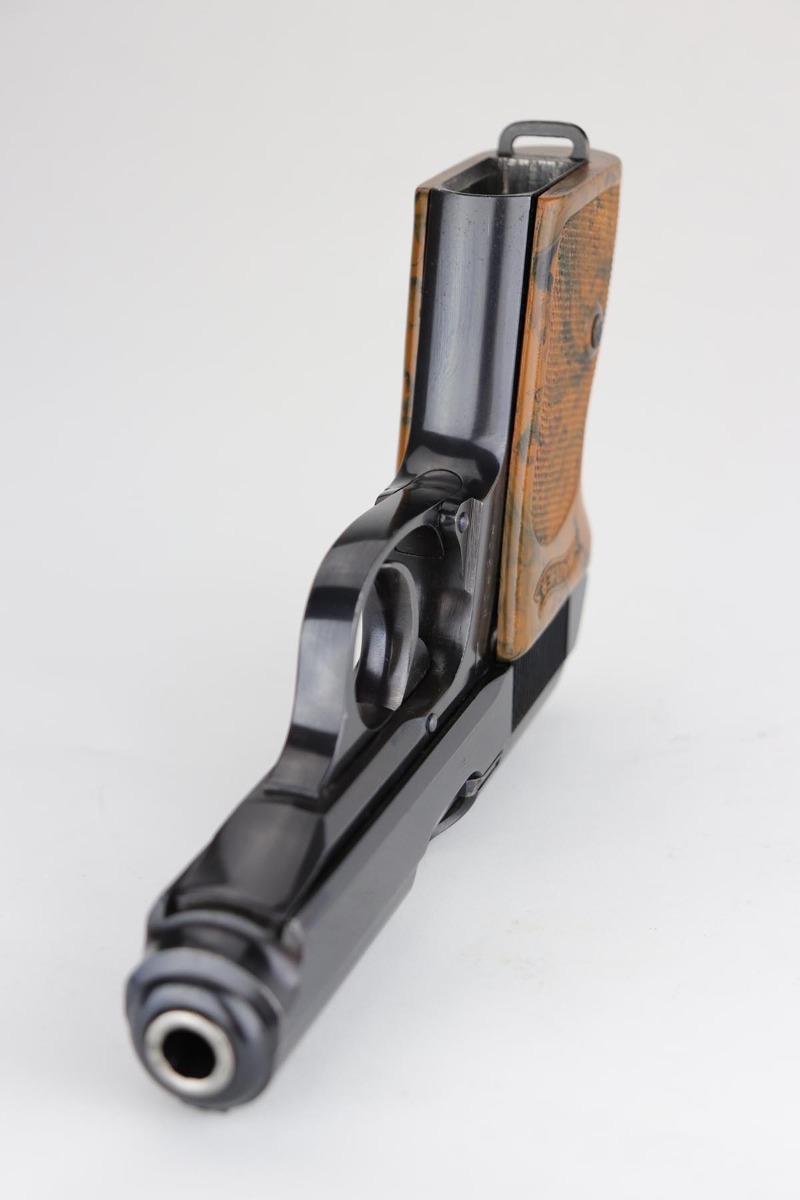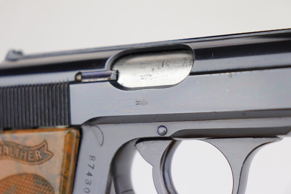 2/27/20 – This is a gorgeous and original commercial Walther PPK from 1935. The high-polish blue rates at 98-99% with just minor hints of muzzle wear. Early 90 degree safety with some of the original fire blue remaining. Mint bore and excellent grip with no cracks or chips. Early banner magazine.