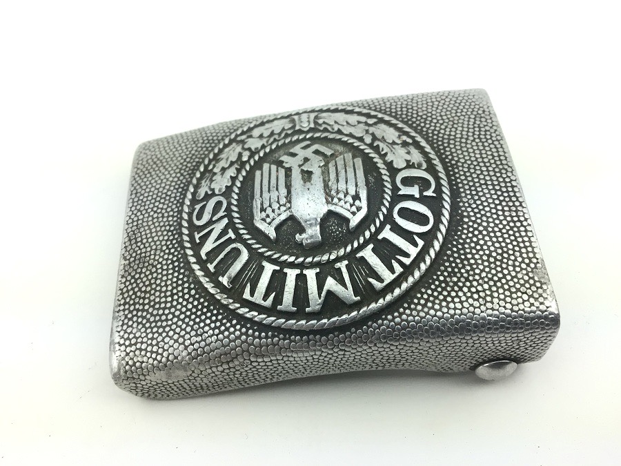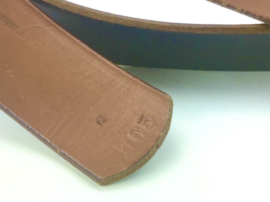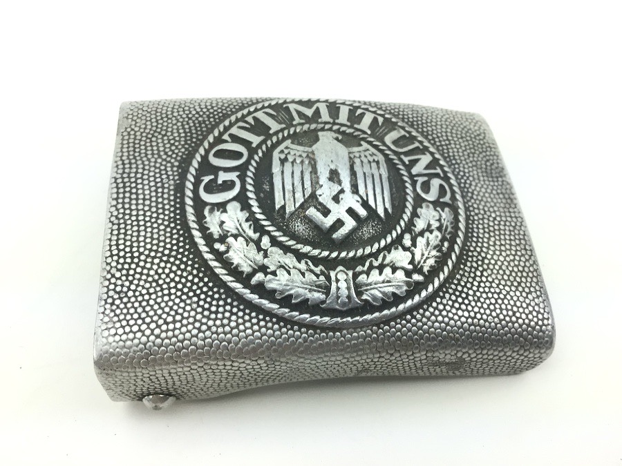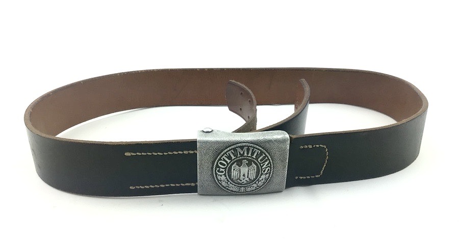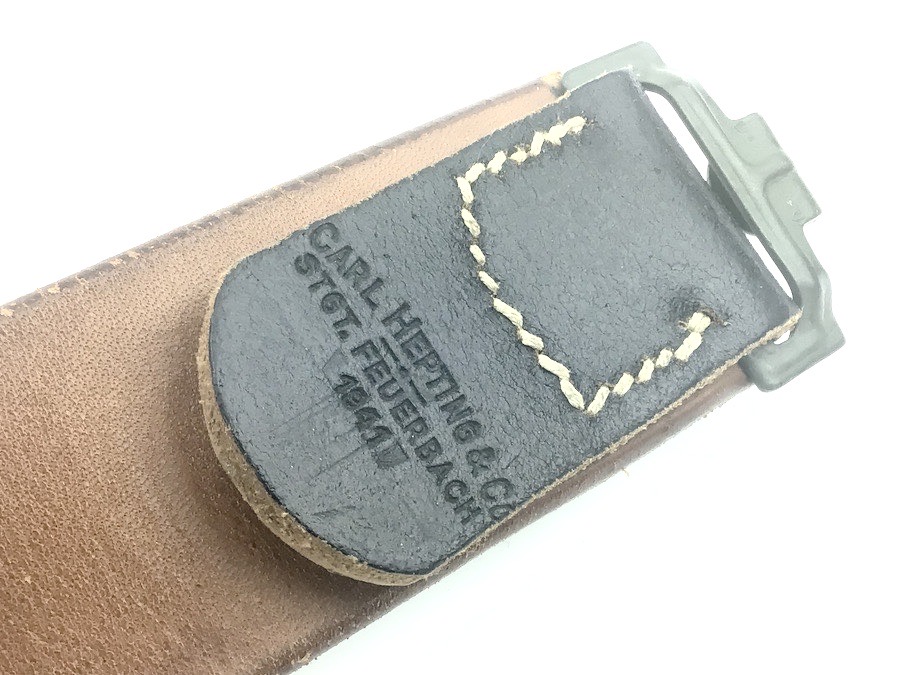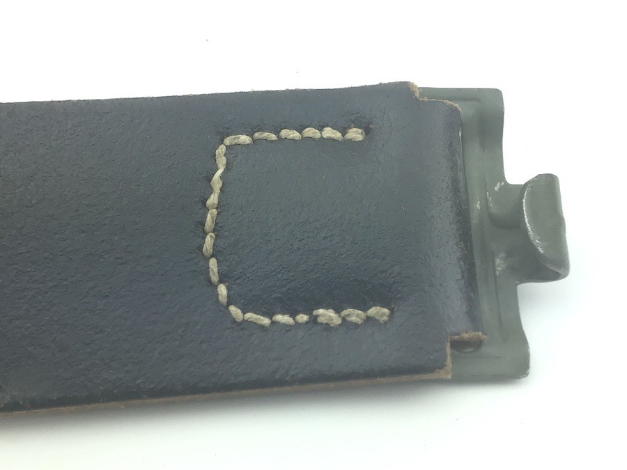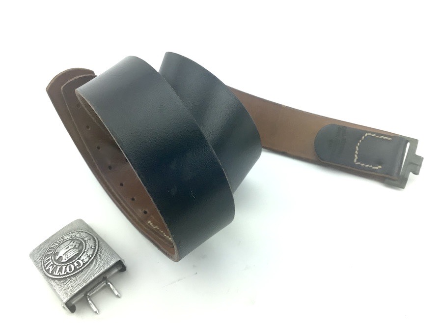 1/29/22 – Located at our Ohio office. This is an original WW2 German Army belt and buckle. The buckle is aluminum and un-marked. It shows minor aging and wear on the eagle. The reverse has some remnants of the original olive paint. The leather belt is in great shape, with distinct maker stamp and date. The leather is pliable and has minimal wear. Measures about 41 inches long with a “105” stamped on the inside tip.