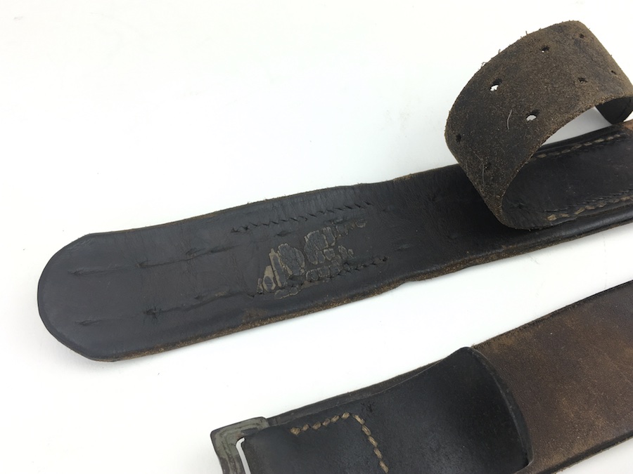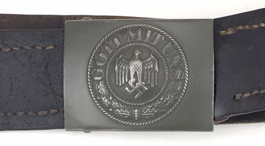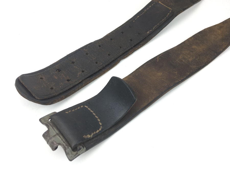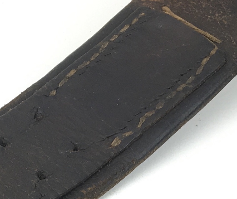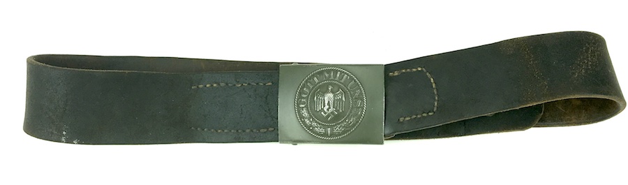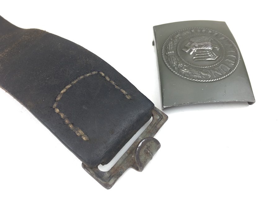 10/2/19 – This is an original and very good condition “Gott Mit Uns” Black Belt and Buckle from WWII. The buckle and leather tab are un-marked. The buckle is stamped steel with green color paint. This is proper for military issue. The leather belt is 35″ long and appears to have been restitched or repaired on the interior strap. However, all other stitching is original. The leather has some minor wear from use with a few surface scuffs. Nice original piece.