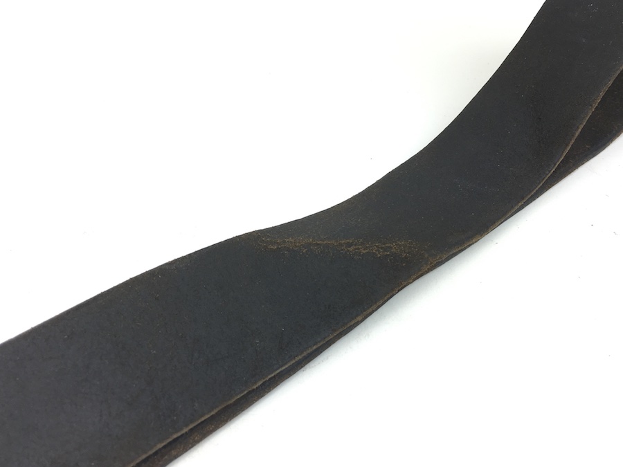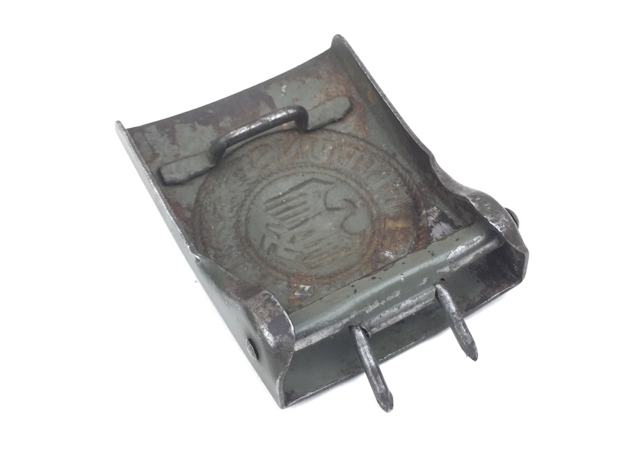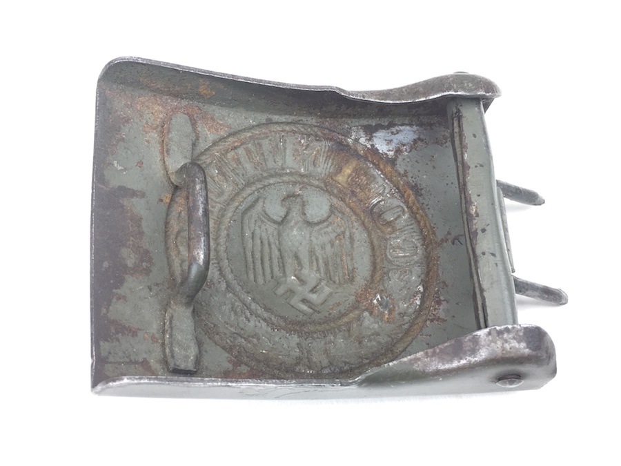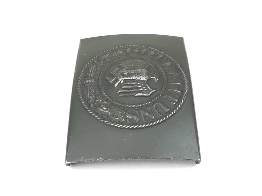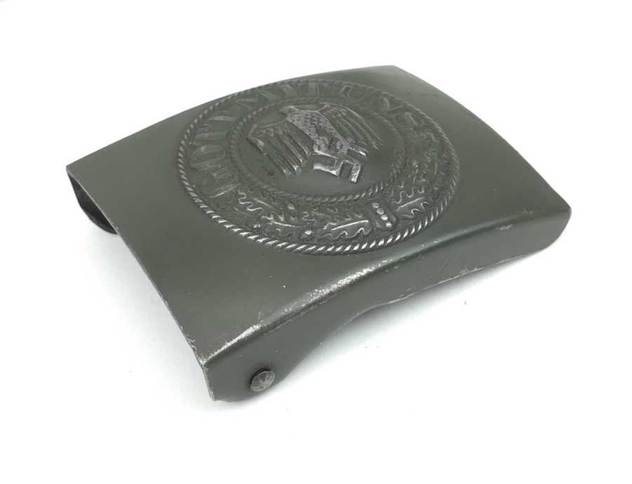 10/2/19 – This is an original and very good condition “Gott Mit Uns” Black Belt and Buckle from WWII. The buckle and leather tab are un-marked. The buckle is stamped steel with green color paint. This is proper for military issue. The leather belt is 35″ long and appears to have been restitched or repaired on the interior strap. However, all other stitching is original. The leather has some minor wear from use with a few surface scuffs. Nice original piece.