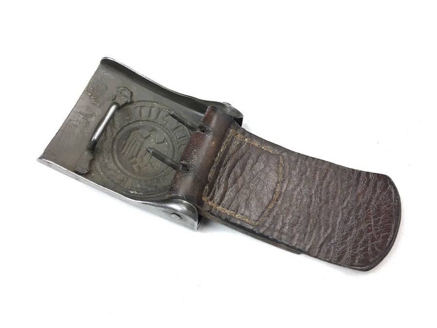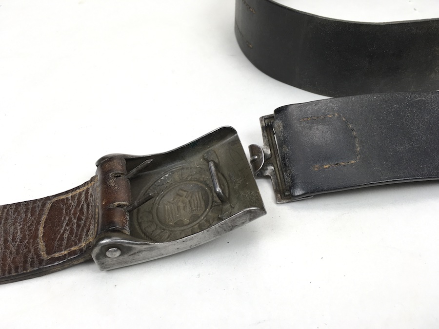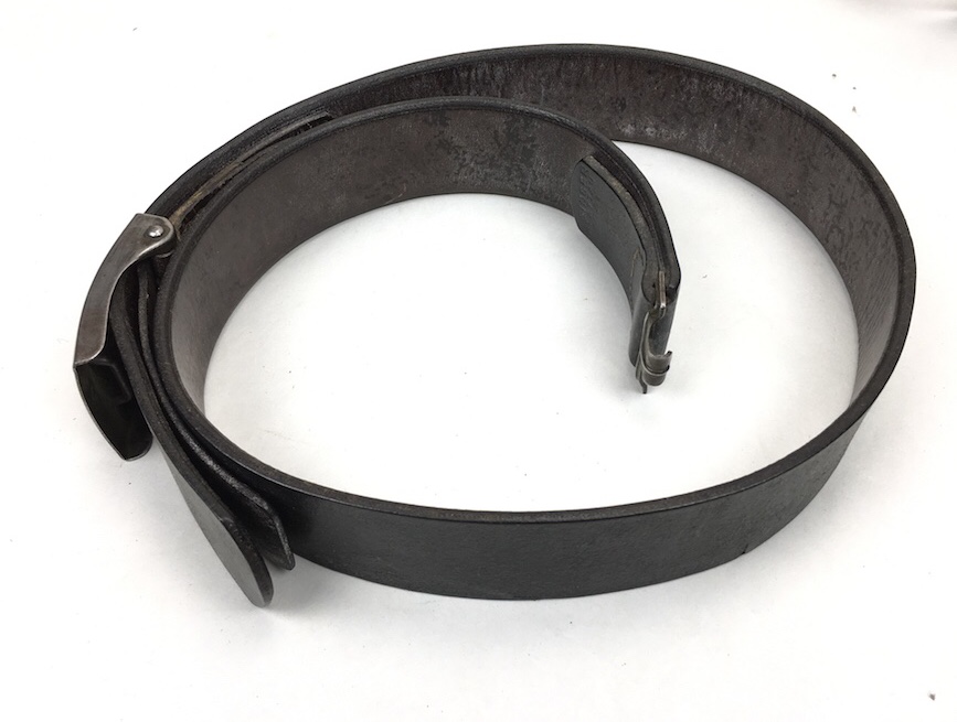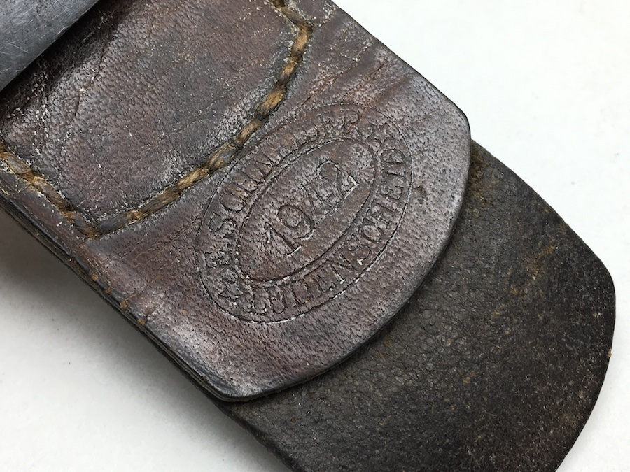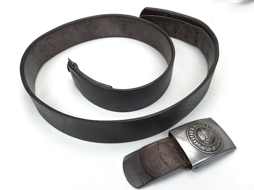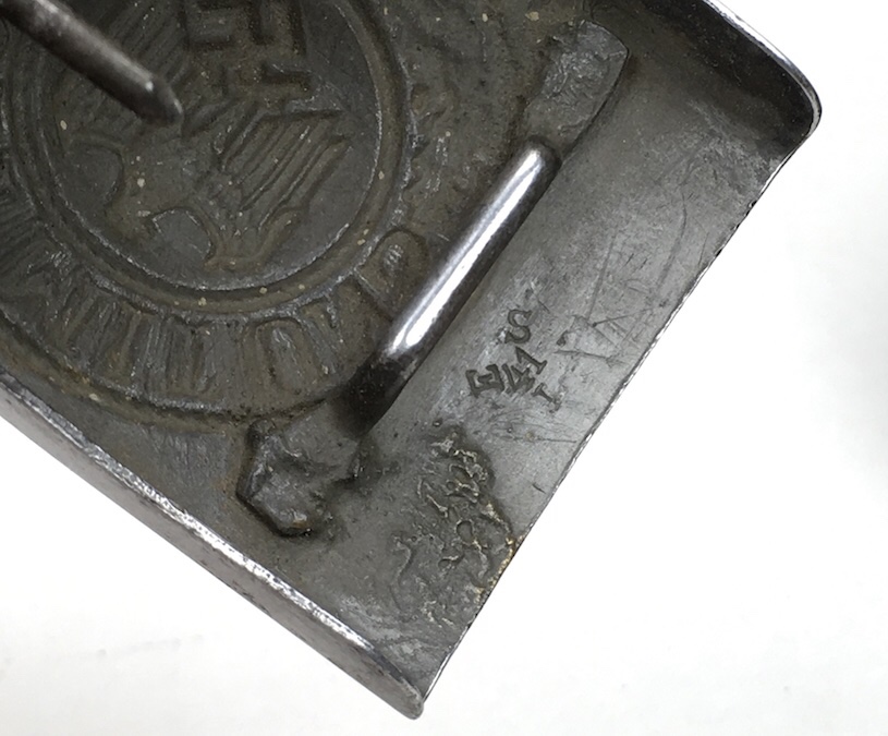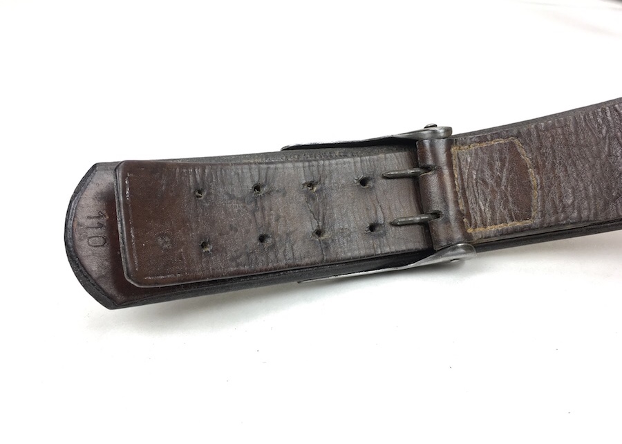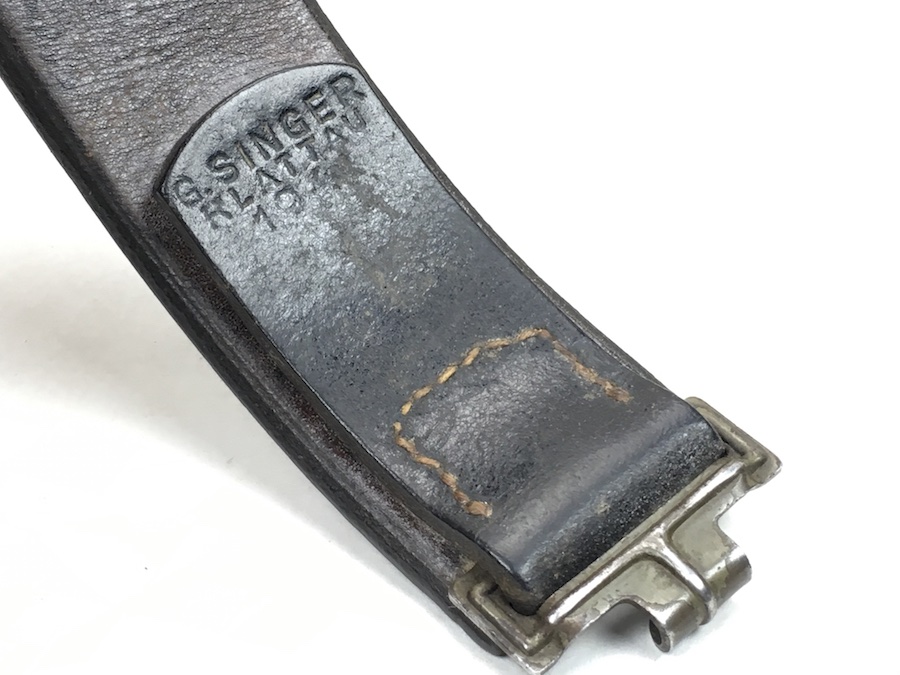 6/13/19 – This is an original and excellent “Gott Mit Uns” Black Belt and Buckle from 1942. The buckle and leather tab are maker stamped “E. SCHNEIDER” along with 1942 date. The back of the buckle has the “ES” maker stamp. The leather belt is 44″ long and marked with a “110” size near the tip. The leather is stamped “G. SLINGER – KLATTAU” The date stamp is distinct except for the last number. It’s either a 1 or a 2. All stitching is original and intact. No cracking or bad surface scuffs. Nice original piece.