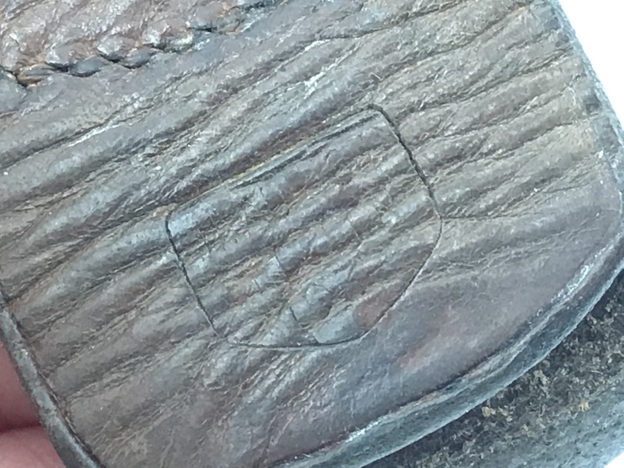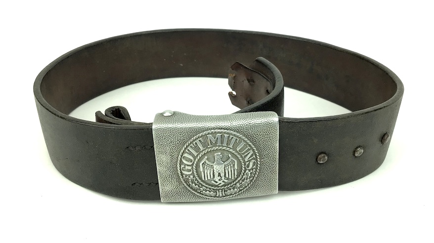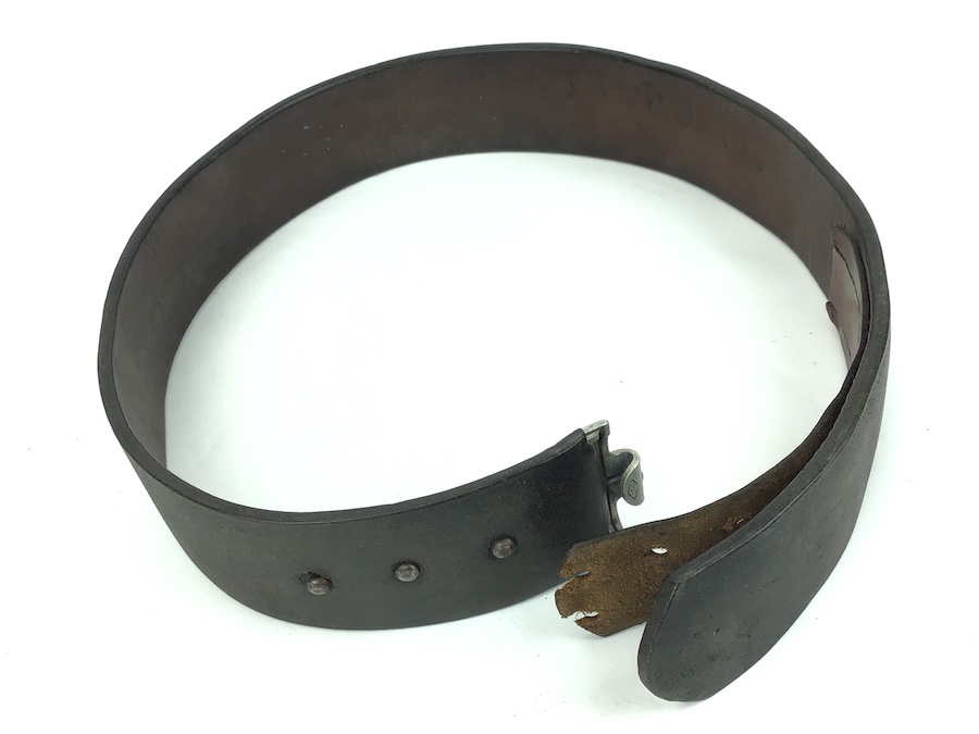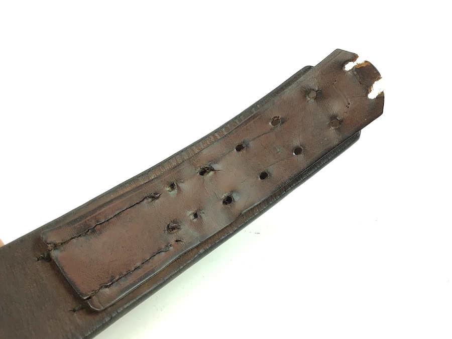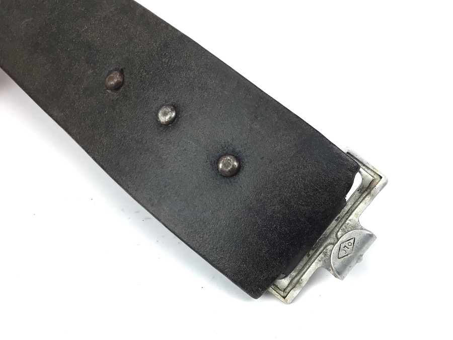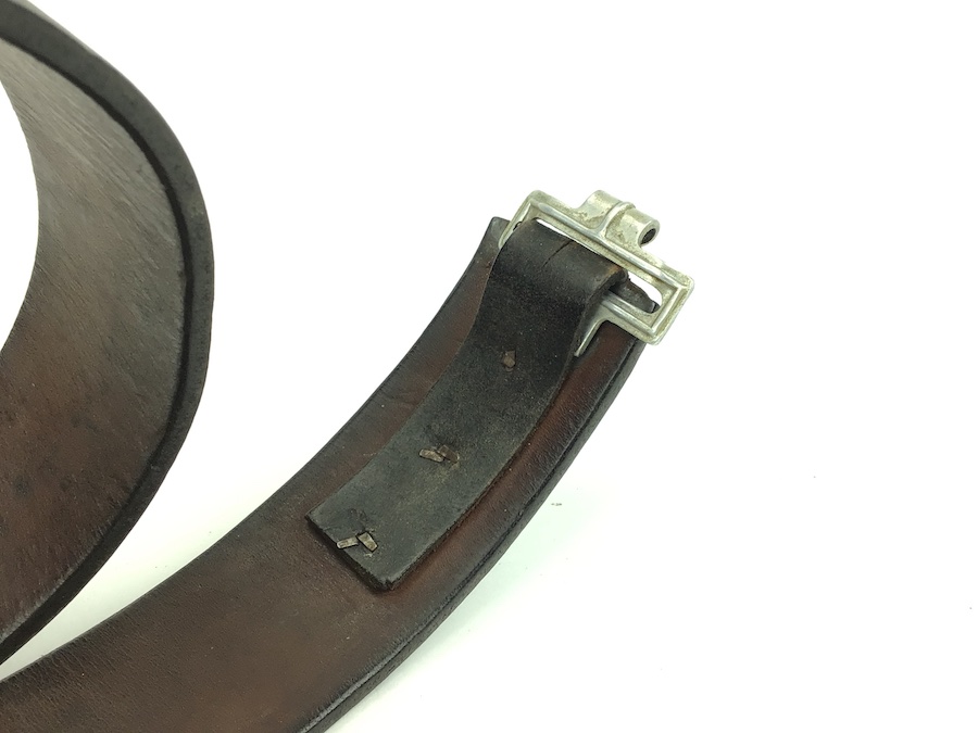 8/6/21 – This is an original and very good condition “Gott Mit Uns” Black Belt and Buckle from early WW2. The buckle and leather tab are maker and date stamped, however, only the numerals “193” are visible.  The leather belt is 30″ long. Possibly shortened at some point in the past and riveted at the latch. The leather strip has been torn at the first set of holes, and the stitching is somewhat loose. Priced accordingly.