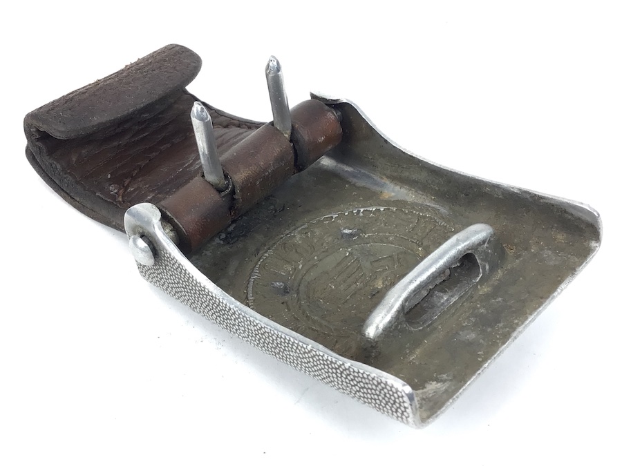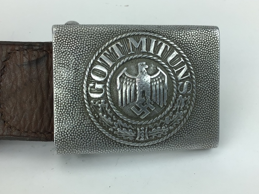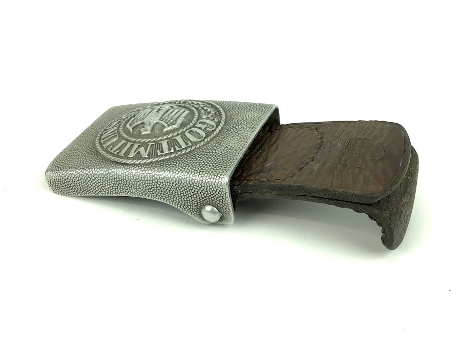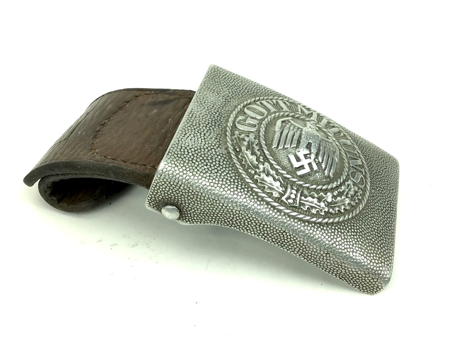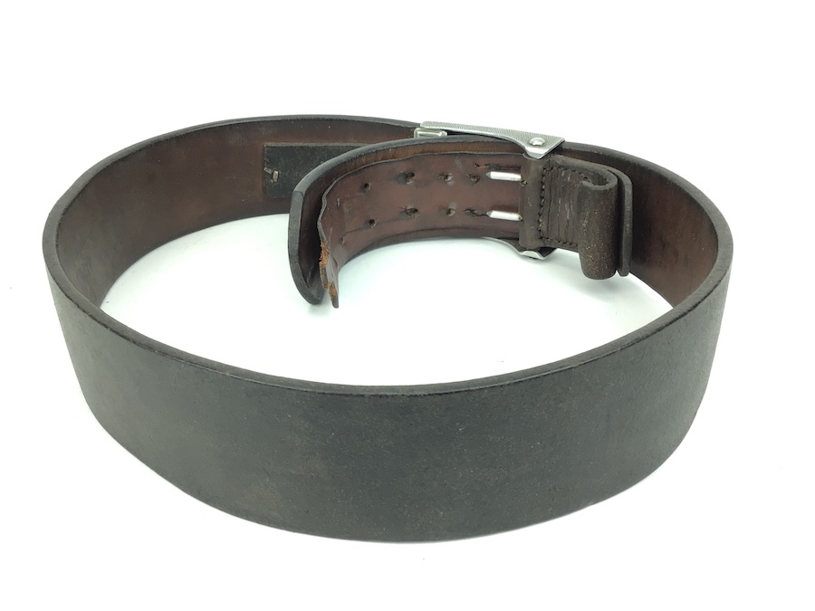 8/6/21 – This is an original and very good condition “Gott Mit Uns” Black Belt and Buckle from early WW2. The buckle and leather tab are maker and date stamped, however, only the numerals “193” are visible.  The leather belt is 30″ long. Possibly shortened at some point in the past and riveted at the latch. The leather strip has been torn at the first set of holes, and the stitching is somewhat loose. Priced accordingly.