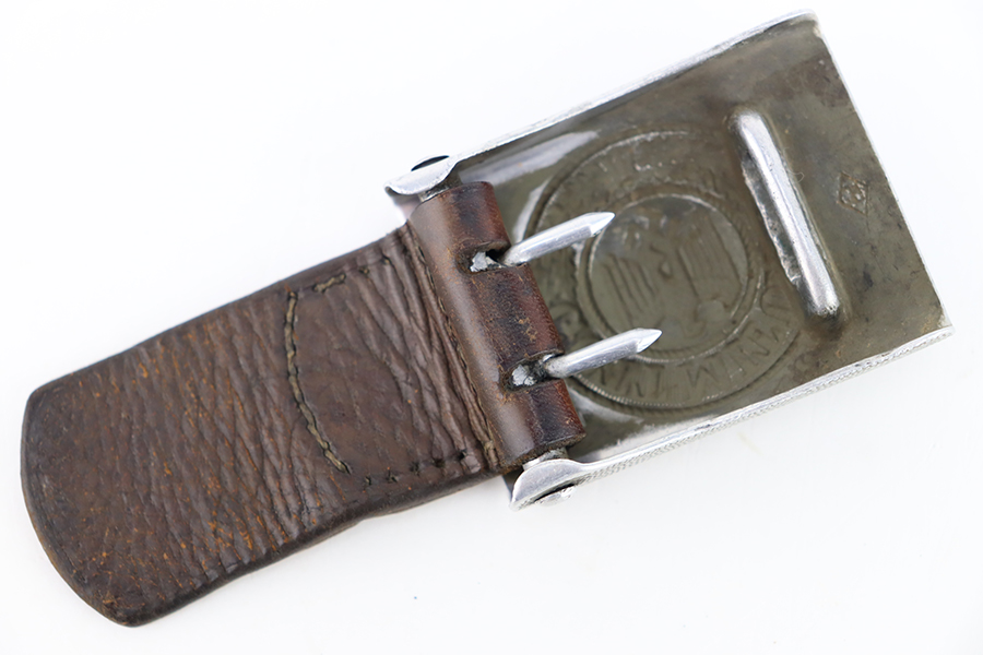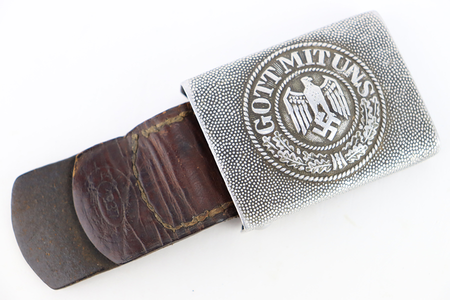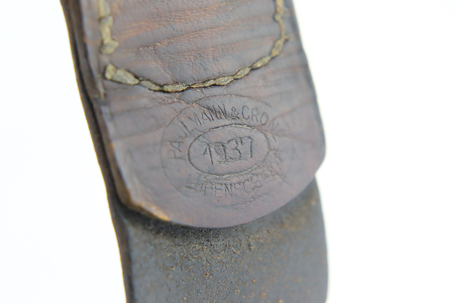 2/2/24 – This is a very nice example of a German “Gott Mit Uns” combat belt buckle and leather tab from WW2. The leather tab is maker marked and dated 1937. The buckle is very nice condition overall with just minor dulling around the high edges.