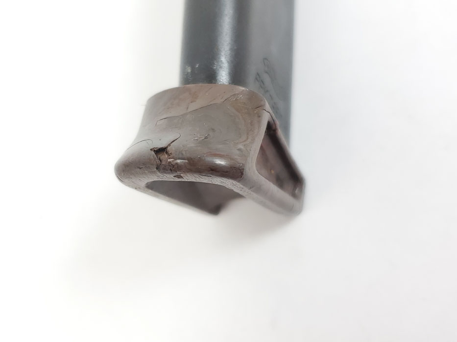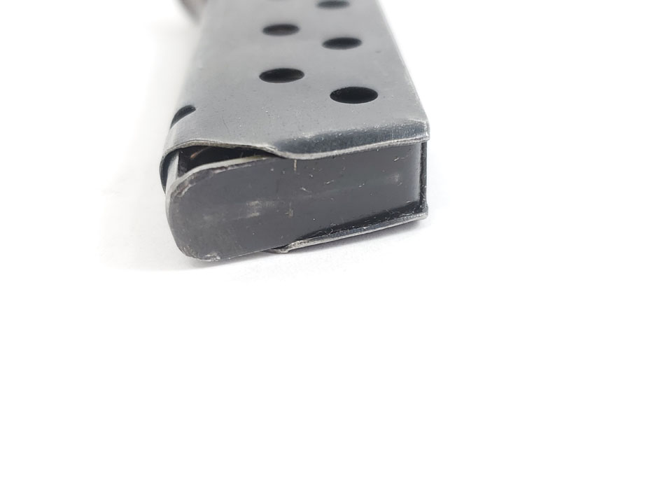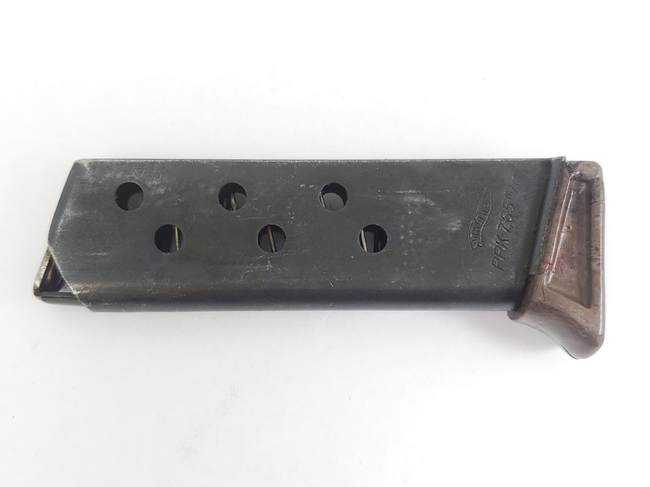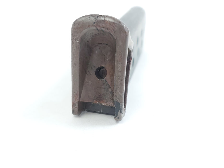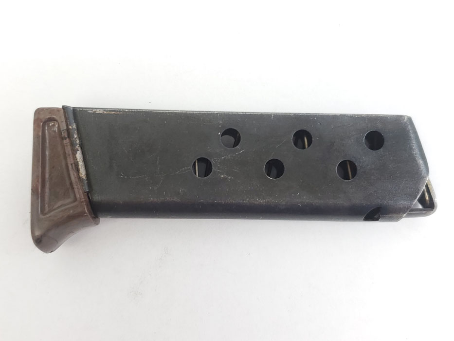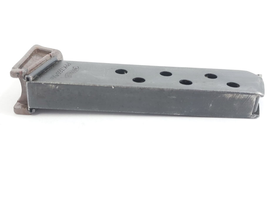 5/22/20 – This is an original WW2 era production Walther PPK finger extension magazine with a rare gray finger extension. The bakelite finger extension has an interesting swirl of dark gray, black, red, and brown colors. A prime example of how every bakelite PPK grip and finger extension is unique. The only flaw on this magazine is the small chip in the front of the toe. Otherwise excellent bluing, strong spring, and all original.
