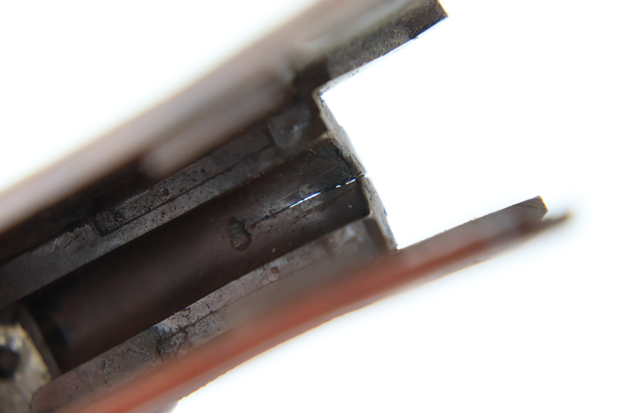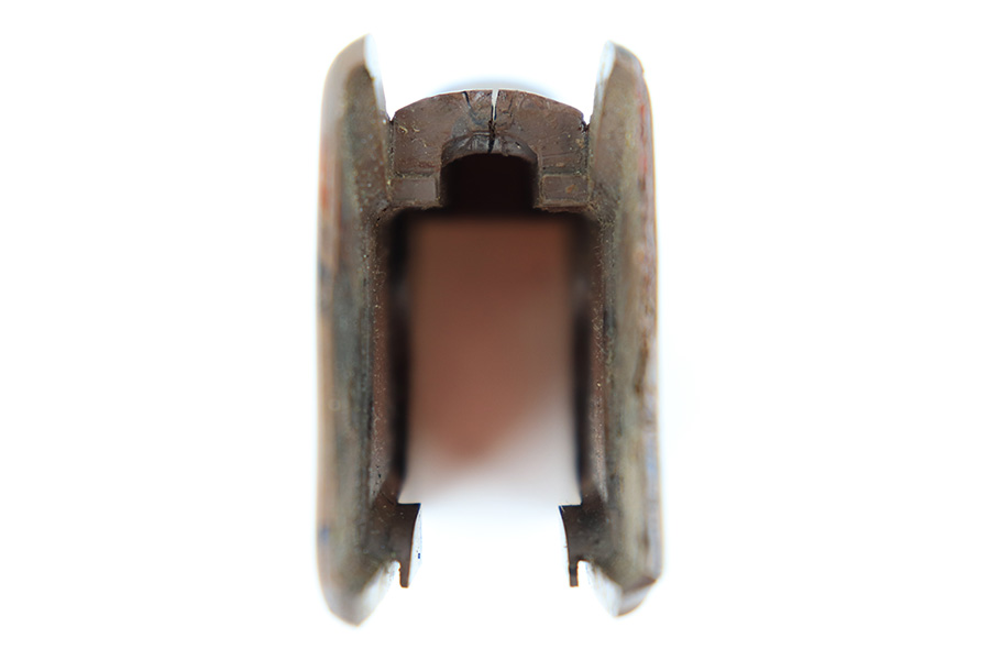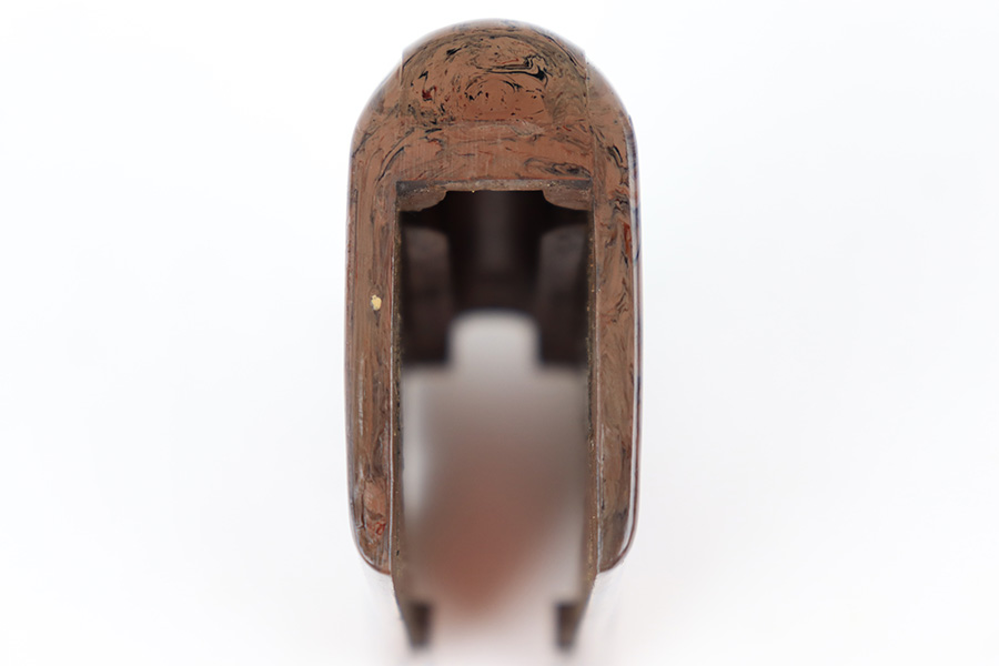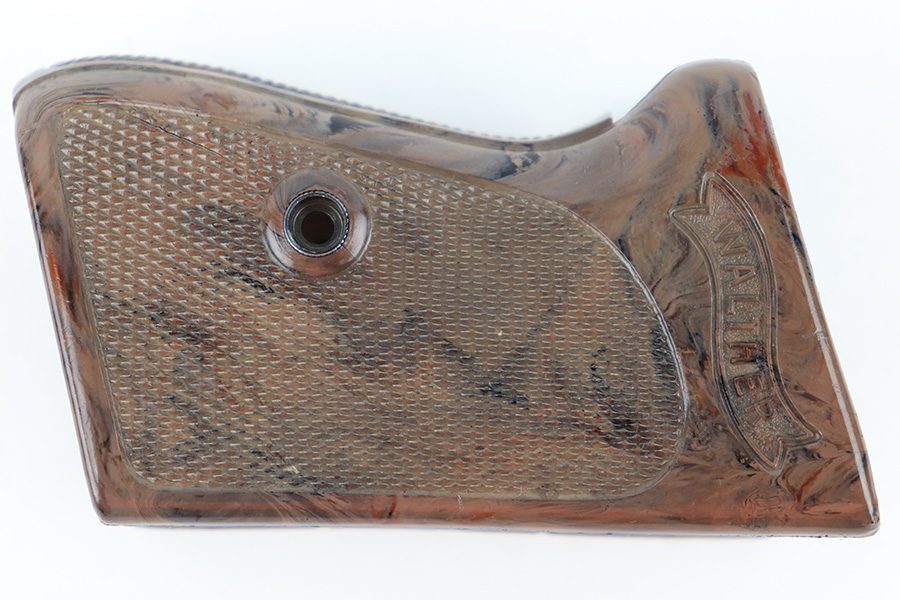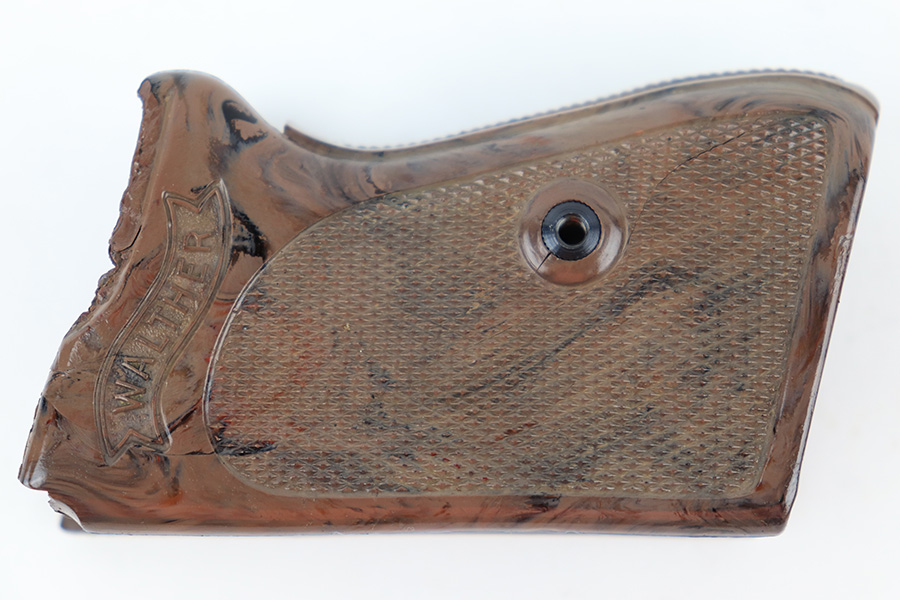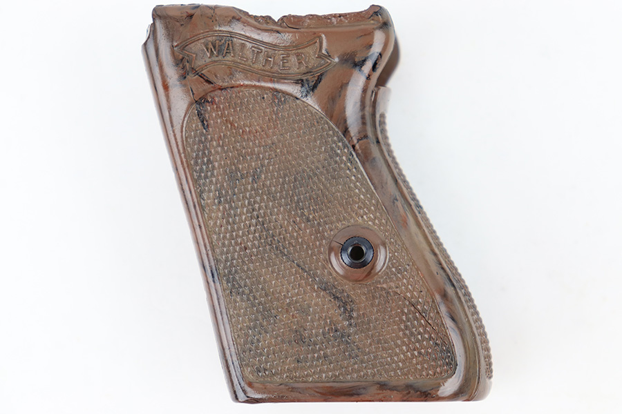 7/25/23 – This is a fairly rare variation grey colored bakelite Walther PPK grip. The 1 piece grip comes with both escutcheons, but no screw is included. The spine of the grip has a crack, as shown. The left side of the grip has some minor chipping along the top edge. The top of the grip has minor “flaring” or slight warping in the bakelite. Still fits and functions on any WW2 era PPK pistol.