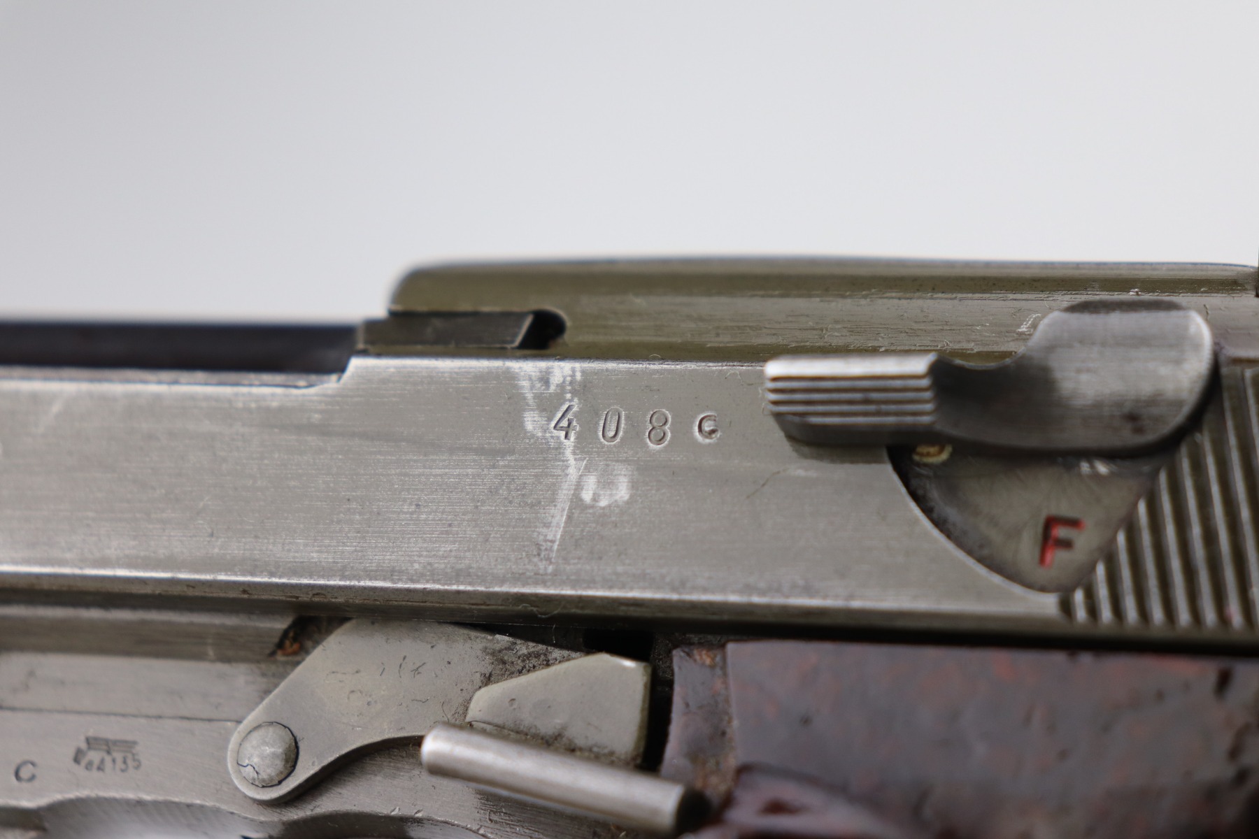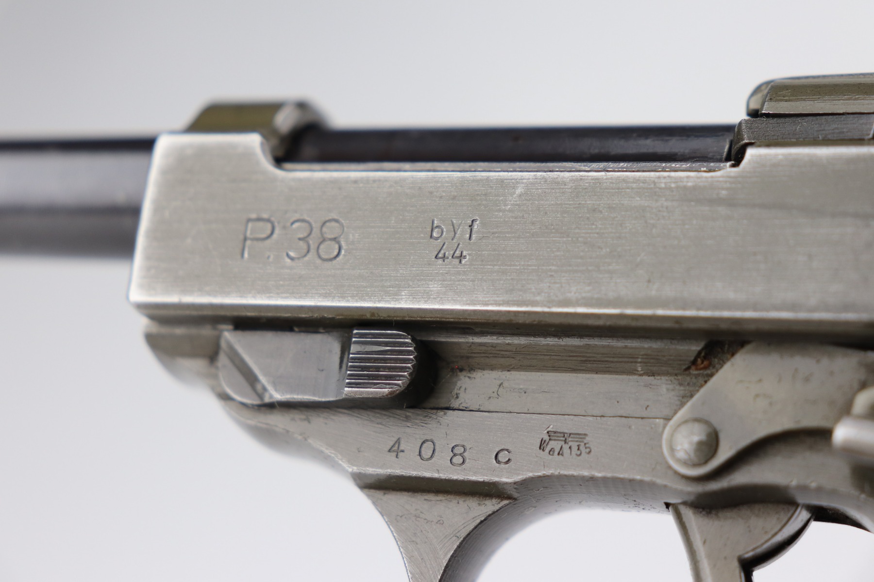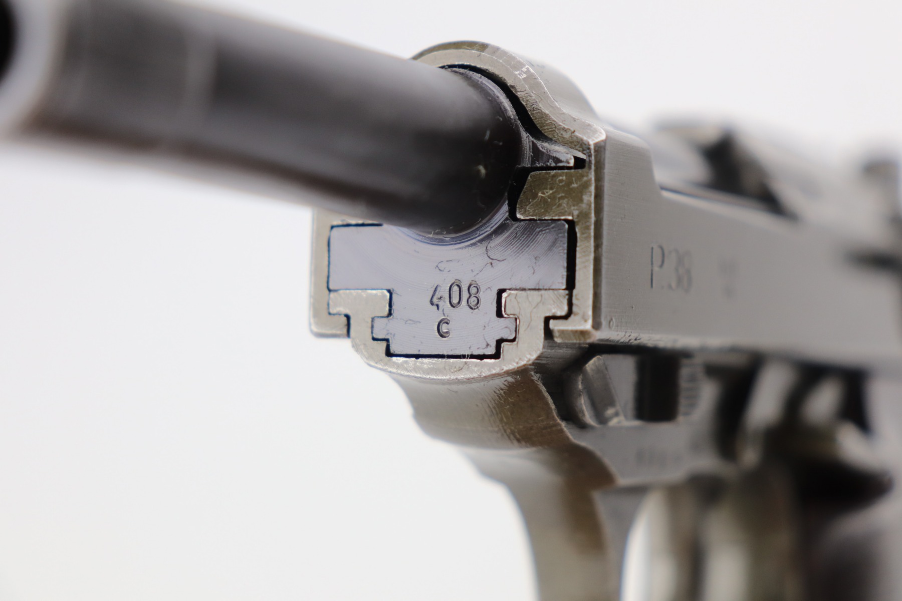 3/4/21 – This is an excellent example of a dual-tone Mauser P.38 with a seldom seen greenish colored phosphate. This pistol was issued to the Nazi military in 1944. It gets the dual-tone appearance from a blued barrel and a phosphate frame and slide. This one is all matching and has the proper “Waffen 135” military proofs. It has retained about 95% of its original finish. There is thinning on the front strap and minor wear around the muzzle and high edges of the slide. Minor wear on the barrel through the ejection port. One spotty area of wear on the left side of the slide. Excellent grips and a period-correct magazine. Stone-mint bore. De-cocker is functional.