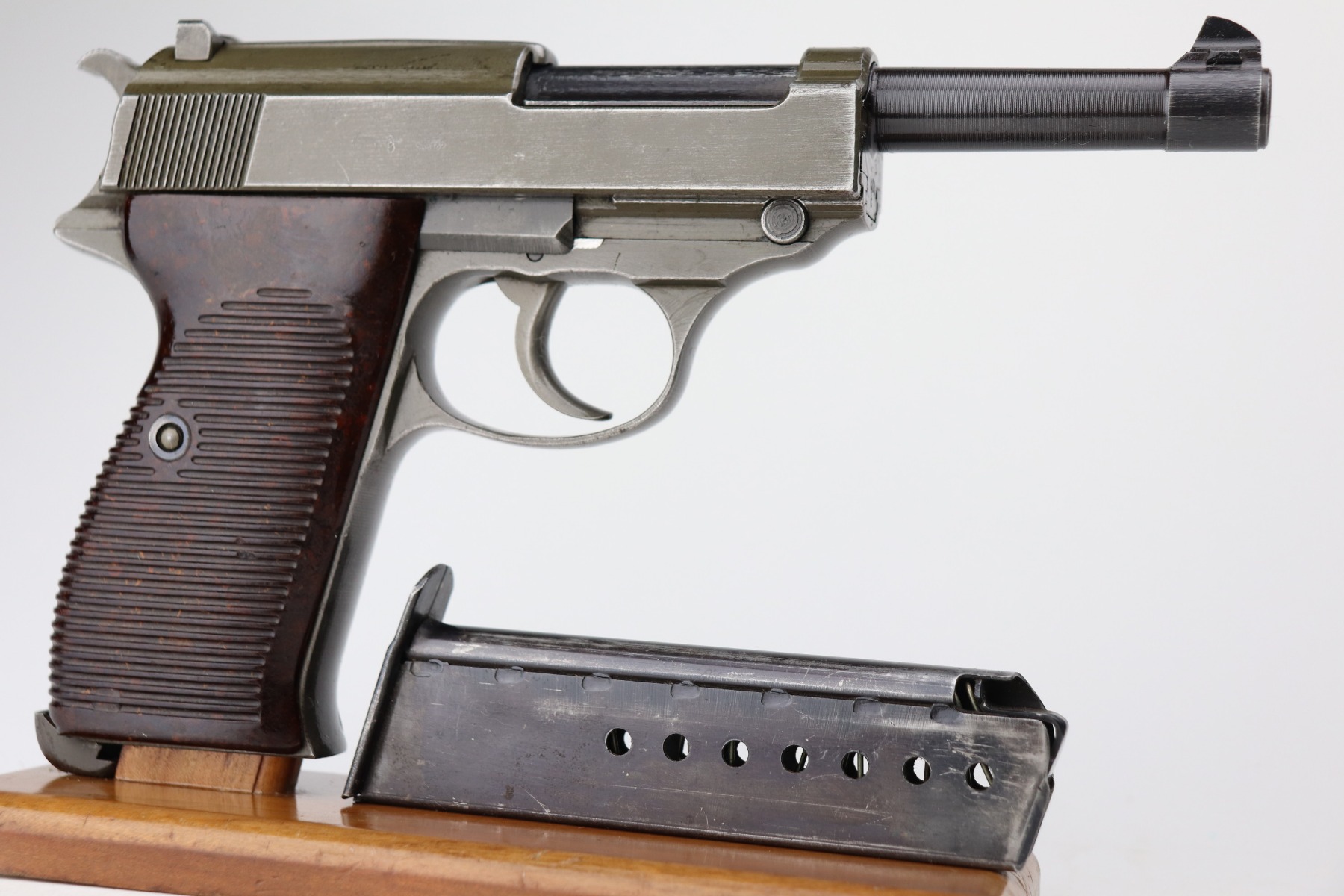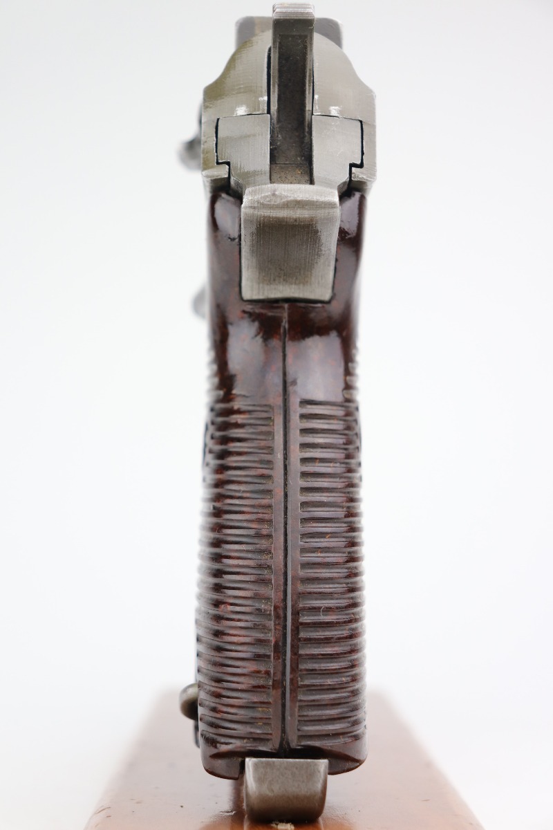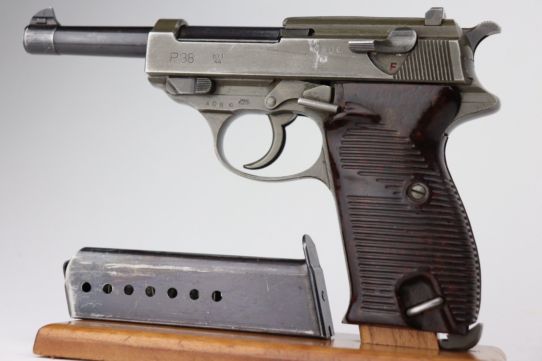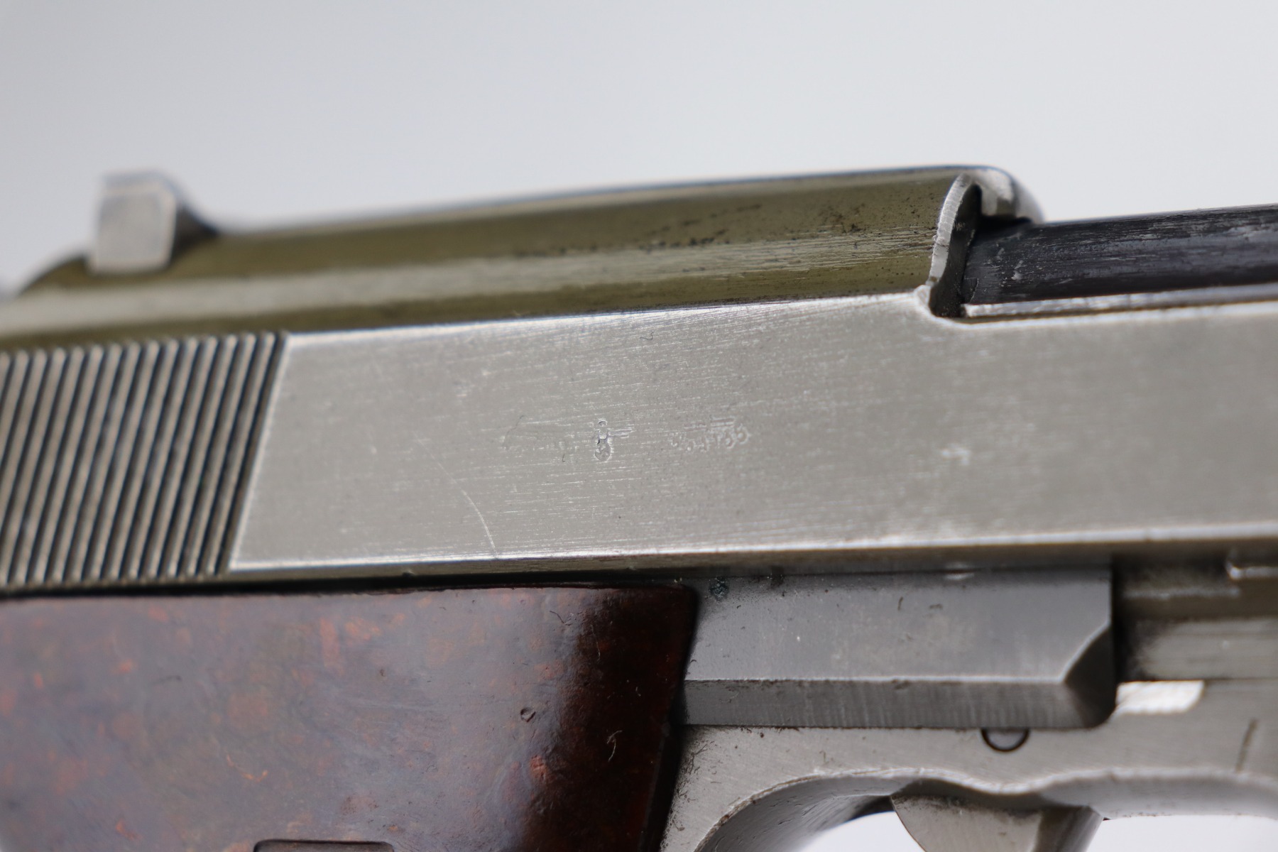 3/4/21 – This is an excellent example of a dual-tone Mauser P.38 with a seldom seen greenish colored phosphate. This pistol was issued to the Nazi military in 1944. It gets the dual-tone appearance from a blued barrel and a phosphate frame and slide. This one is all matching and has the proper “Waffen 135” military proofs. It has retained about 95% of its original finish. There is thinning on the front strap and minor wear around the muzzle and high edges of the slide. Minor wear on the barrel through the ejection port. One spotty area of wear on the left side of the slide. Excellent grips and a period-correct magazine. Stone-mint bore. De-cocker is functional.