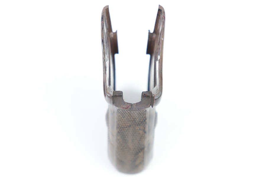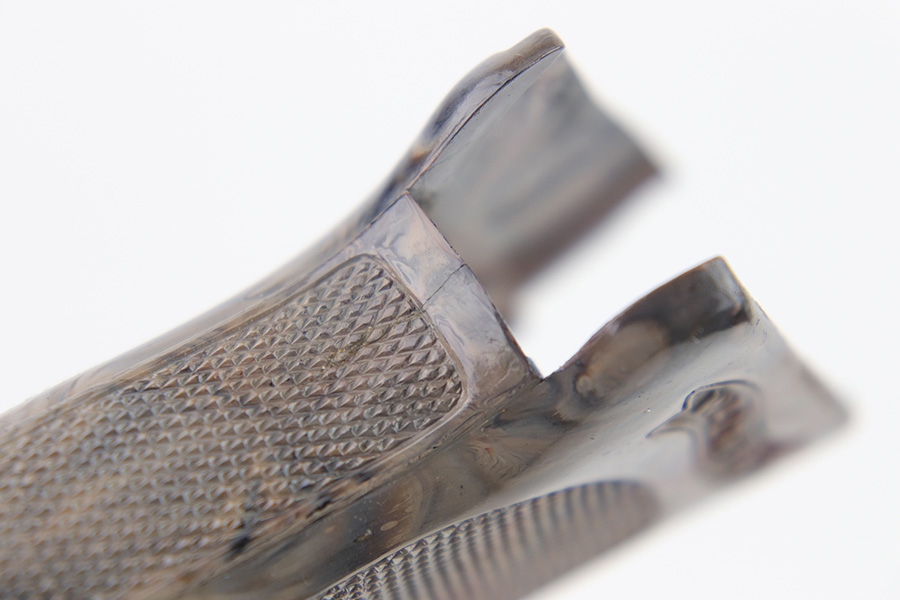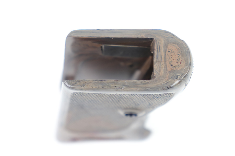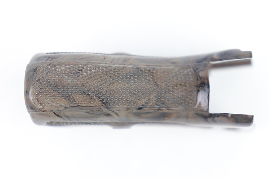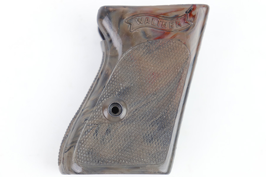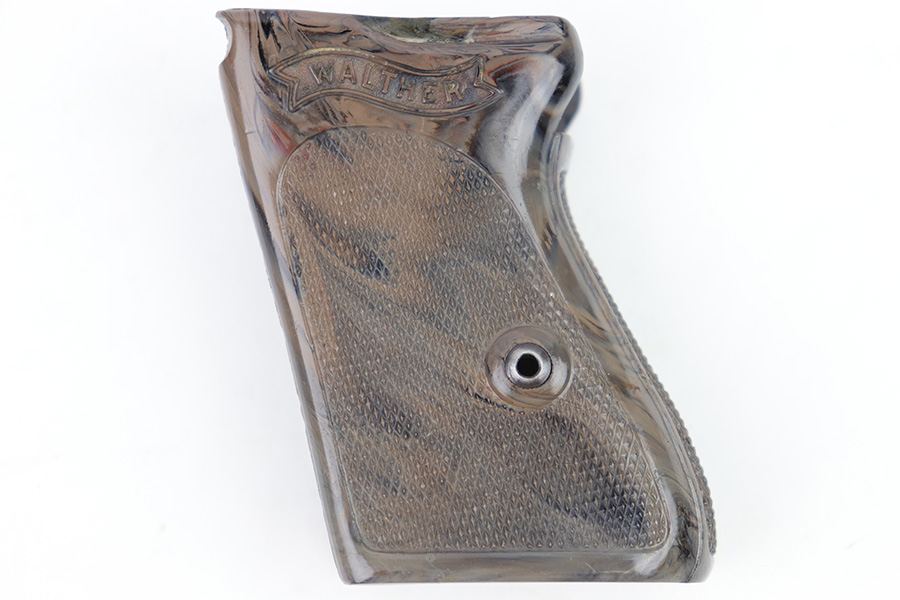 3/8/23 – This is an original WW2 production Walther PPK grip made from mostly grey bakelite. There’s also a nice black marbling and some hints of red throughout the grip. This was characteristic of wartime production as the Walther factory was trying different bakelite mixes. They ultimately went from brown to black, but there are a short run of grey-grip PPKs produced during the war, making these grey examples rare and more desirable. This grip has some flaring / warping at the top of the grip and a small hairline stress-crack on the spine as shown. This doesn’t affect functionality. No screw included, but the grip does have both escutcheons intact.