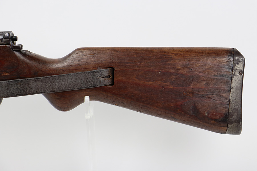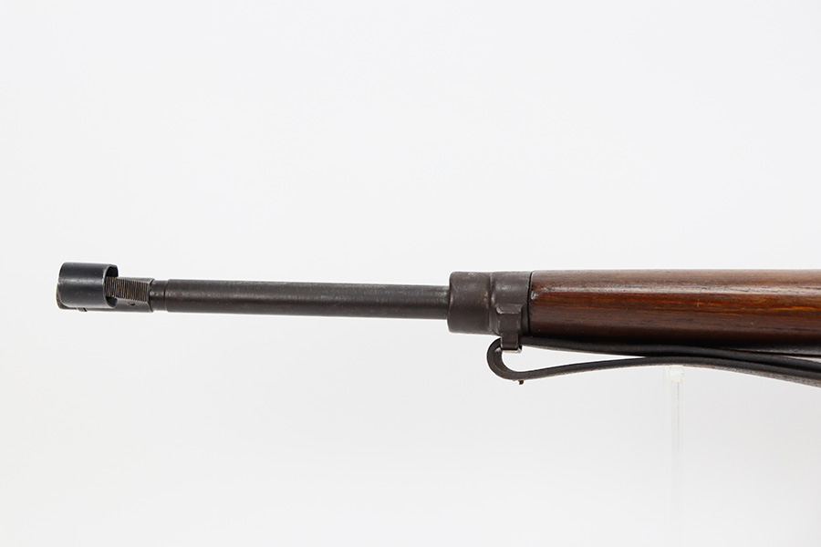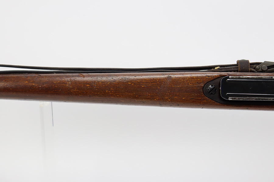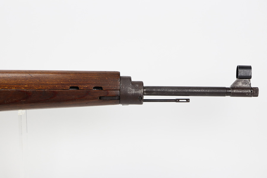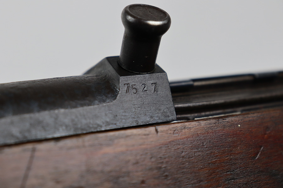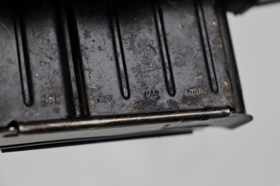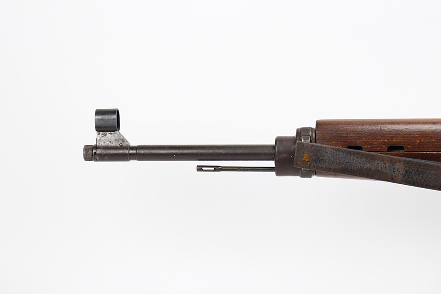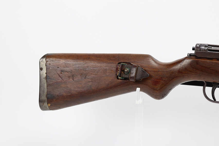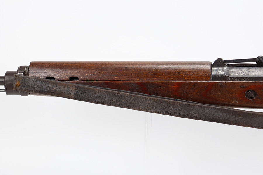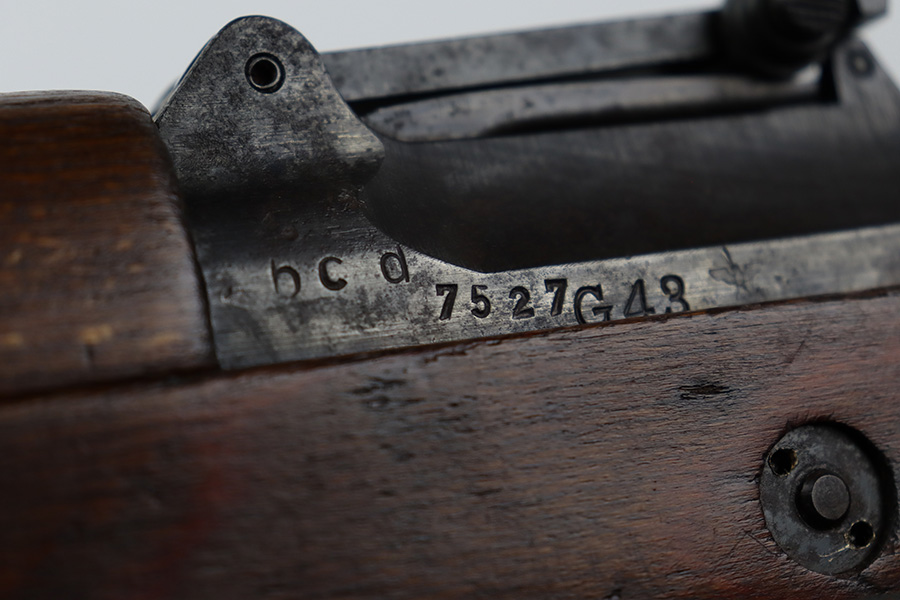 8/9/23 – This is a Gustloff-Werke G.43 rifle from 1944. It’s one of the first ~7,500 made, with no serial suffix. The receiver/bolt carrier group are matching but the stock is a period-original mismatch. The metal finish shows some thinning on the receiver, and minor corrosion on the right side of the receiver. Bore has strong rifling but minor frost throughout. The stock is in good condition, with a very minor surface crack on the wrist and a few minor dings/gouges. Comes with sight hood, cleaning rod and a period sling.