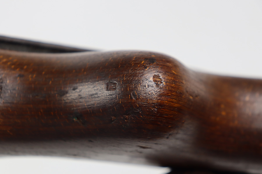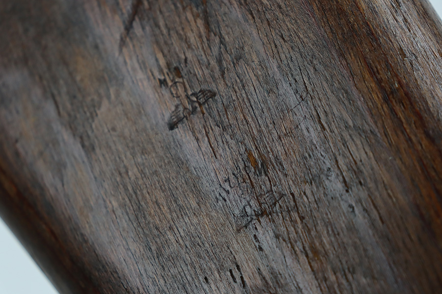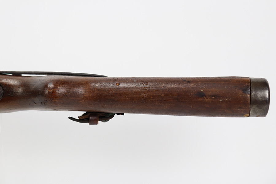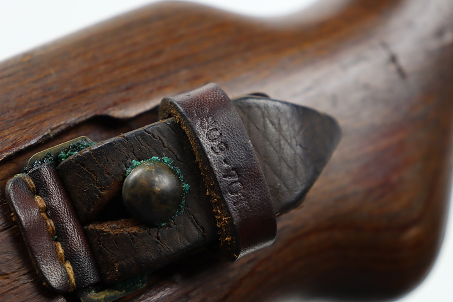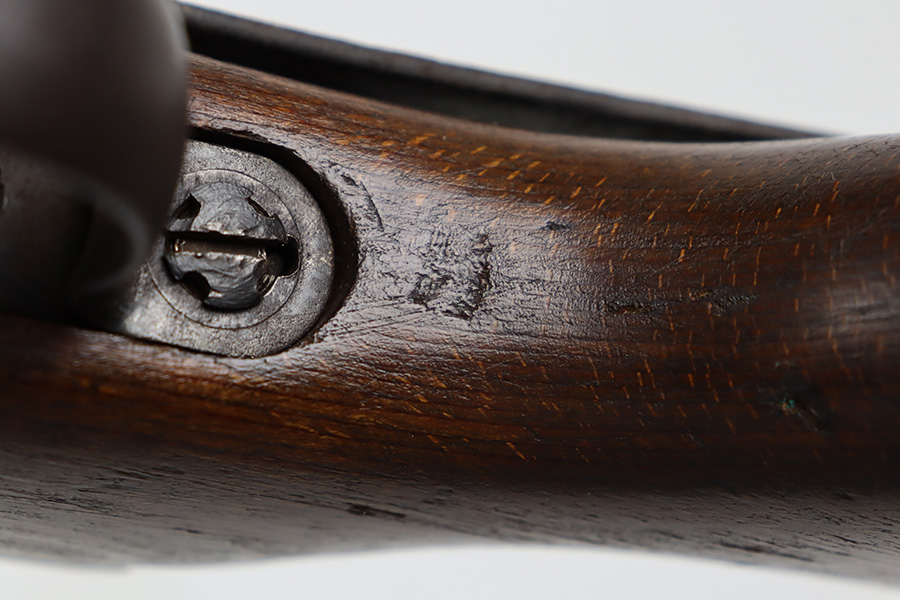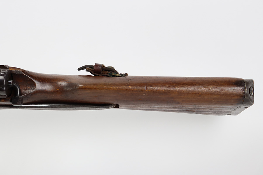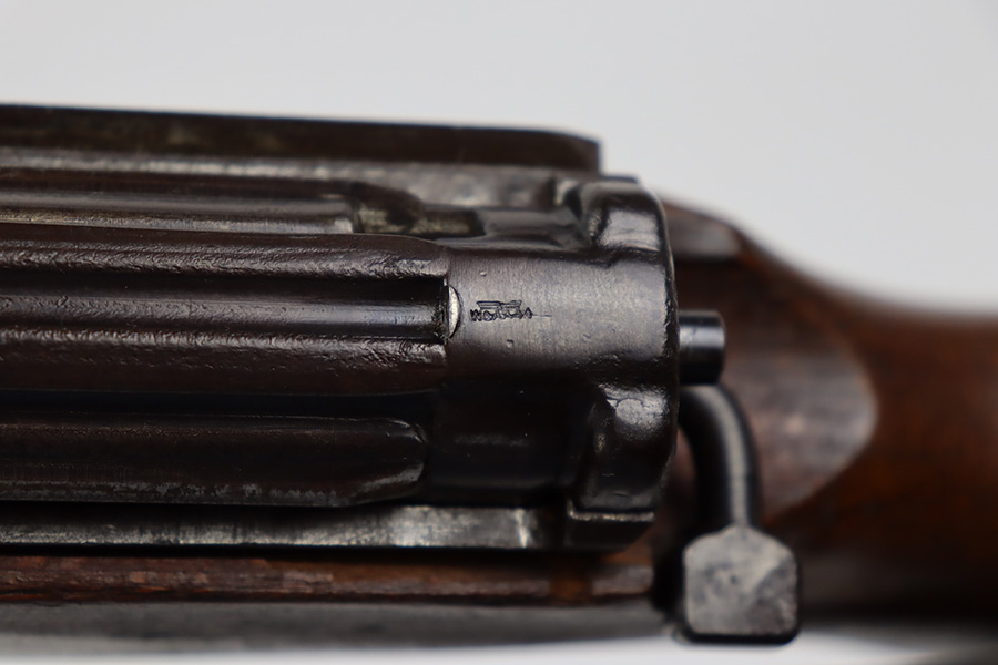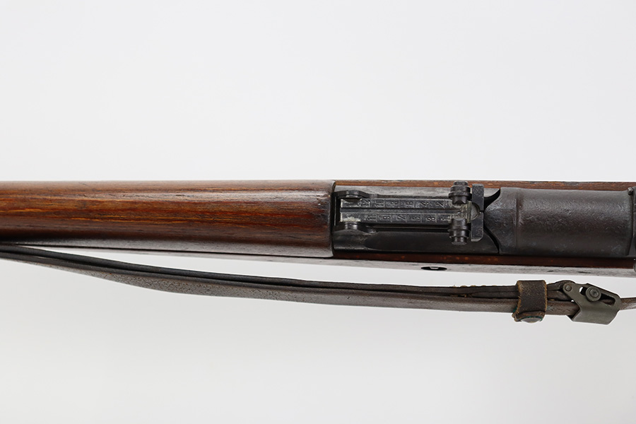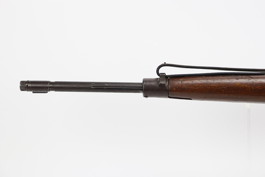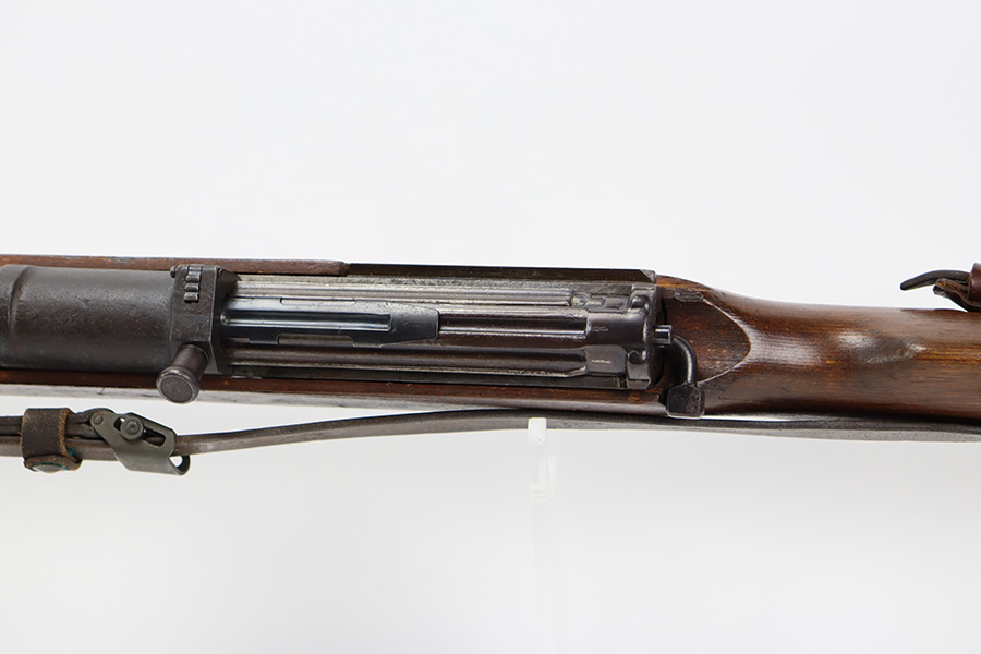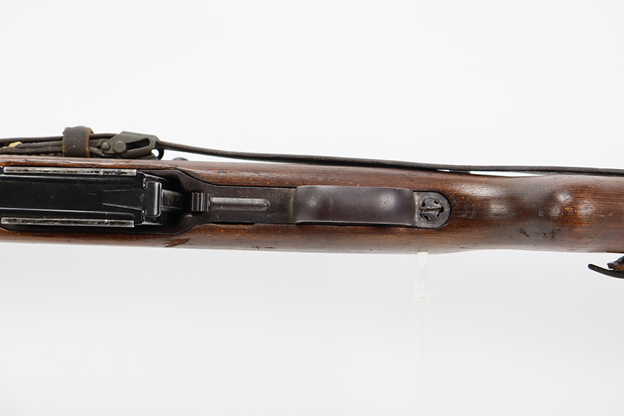 8/9/23 – This is a Gustloff-Werke G.43 rifle from 1944. It’s one of the first ~7,500 made, with no serial suffix. The receiver/bolt carrier group are matching but the stock is a period-original mismatch. The metal finish shows some thinning on the receiver, and minor corrosion on the right side of the receiver. Bore has strong rifling but minor frost throughout. The stock is in good condition, with a very minor surface crack on the wrist and a few minor dings/gouges. Comes with sight hood, cleaning rod and a period sling.