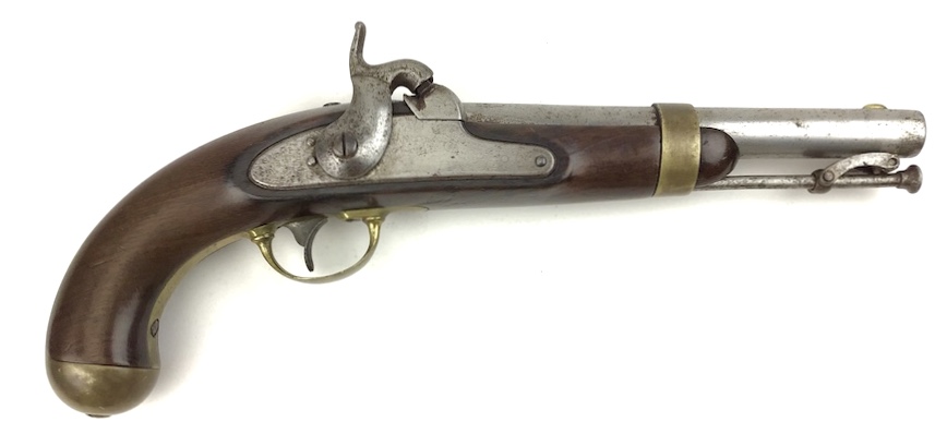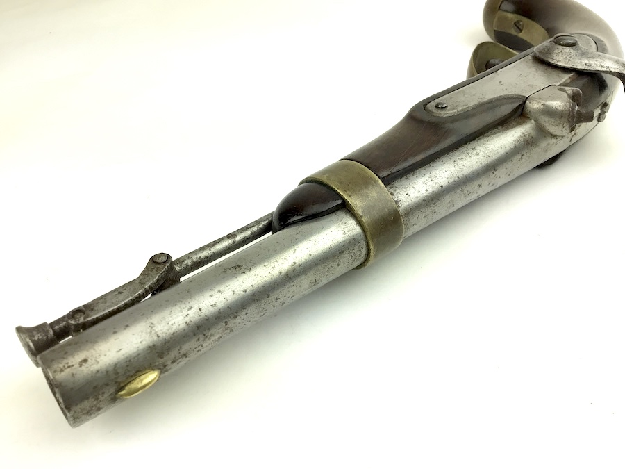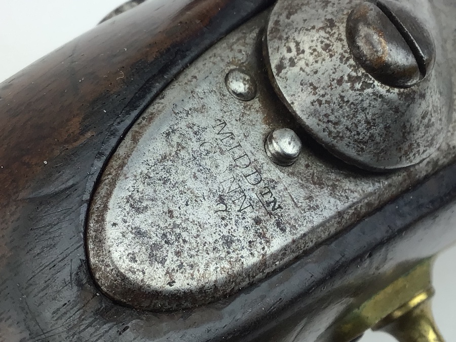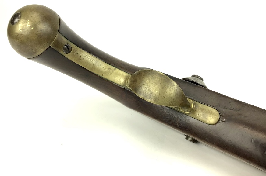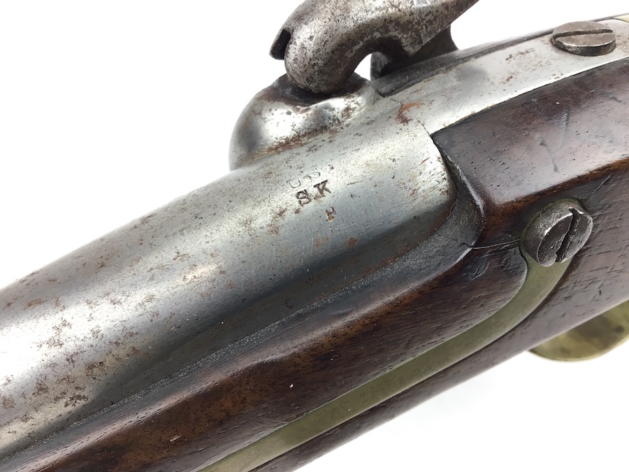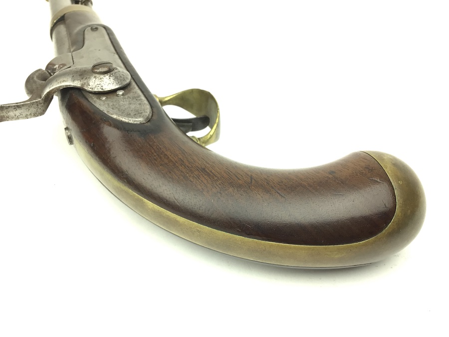 8/6/21 – Original and great condition. H. Aston, antique martial pistol, in .54 caliber. Percussion, no serial number, 1842 model, matching numbers, SK proof marks (inspected by Samuel Knows, Springfield Armory). Beautiful Cherry wood with brass fittings. The metal was cleaned sometime in the past. Stamped with ” MIDDTN / CONN” on side plate behind hammer, and dated, we believe with 1847. Most numbers worn off but visible by high magnification. Minor crack in the right side of the stock, however, it is secure. Many of these guns were used in the Civil War.