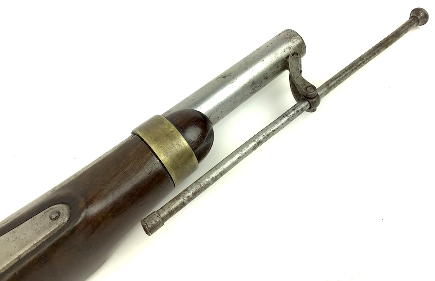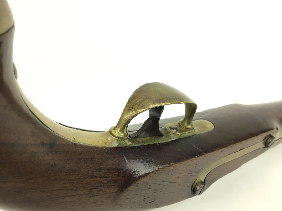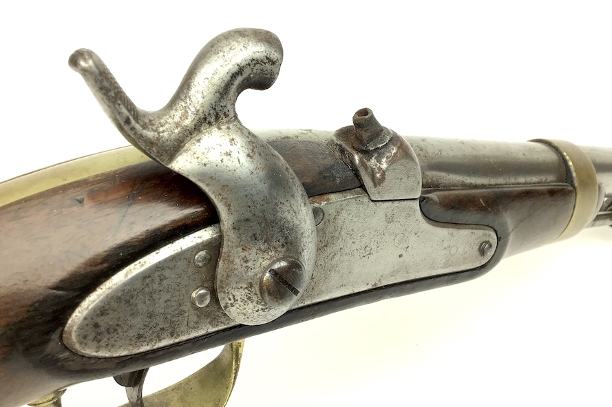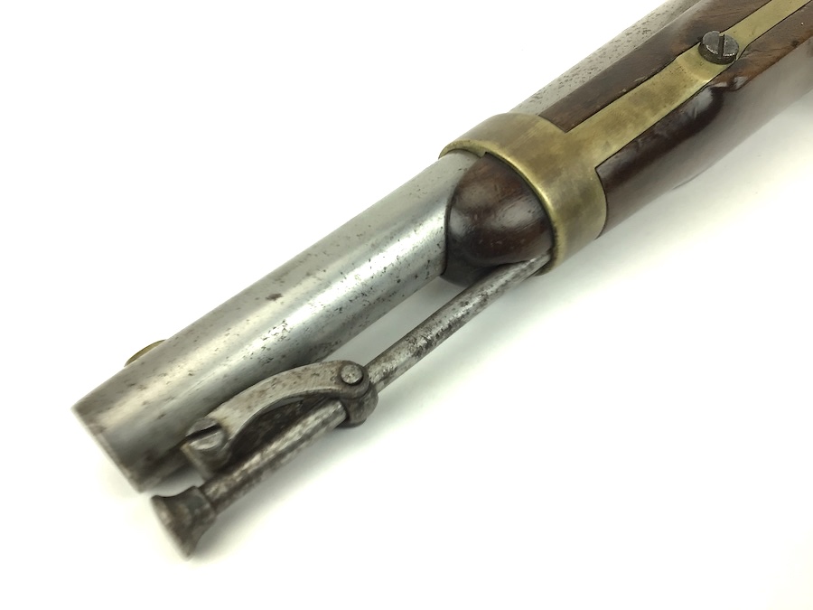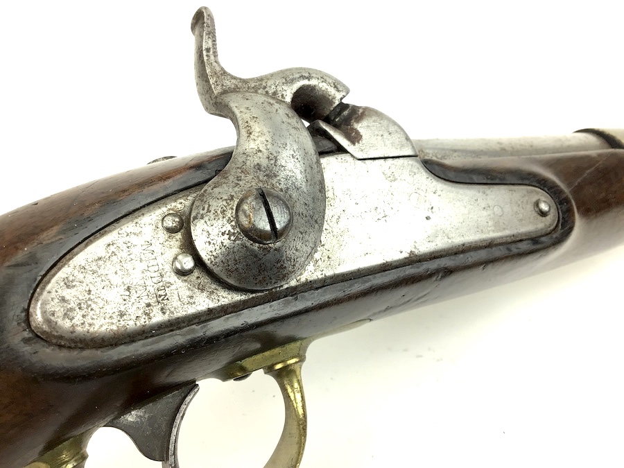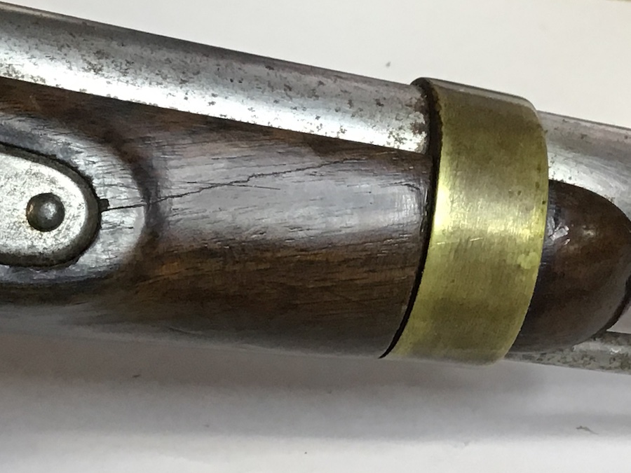 8/6/21 – Original and great condition. H. Aston, antique martial pistol, in .54 caliber. Percussion, no serial number, 1842 model, matching numbers, SK proof marks (inspected by Samuel Knows, Springfield Armory). Beautiful Cherry wood with brass fittings. The metal was cleaned sometime in the past. Stamped with ” MIDDTN / CONN” on side plate behind hammer, and dated, we believe with 1847. Most numbers worn off but visible by high magnification. Minor crack in the right side of the stock, however, it is secure. Many of these guns were used in the Civil War.