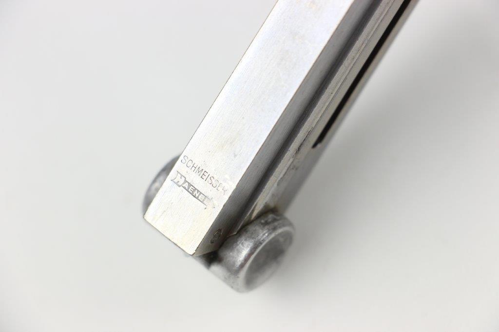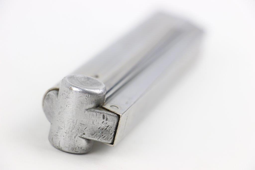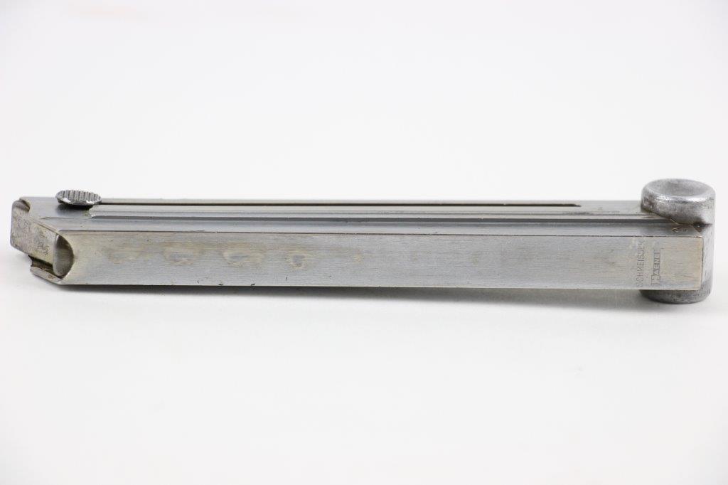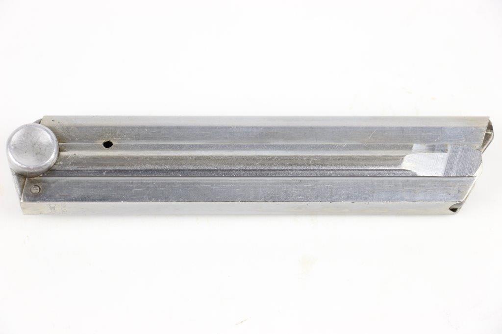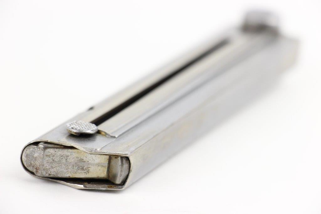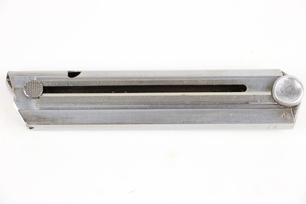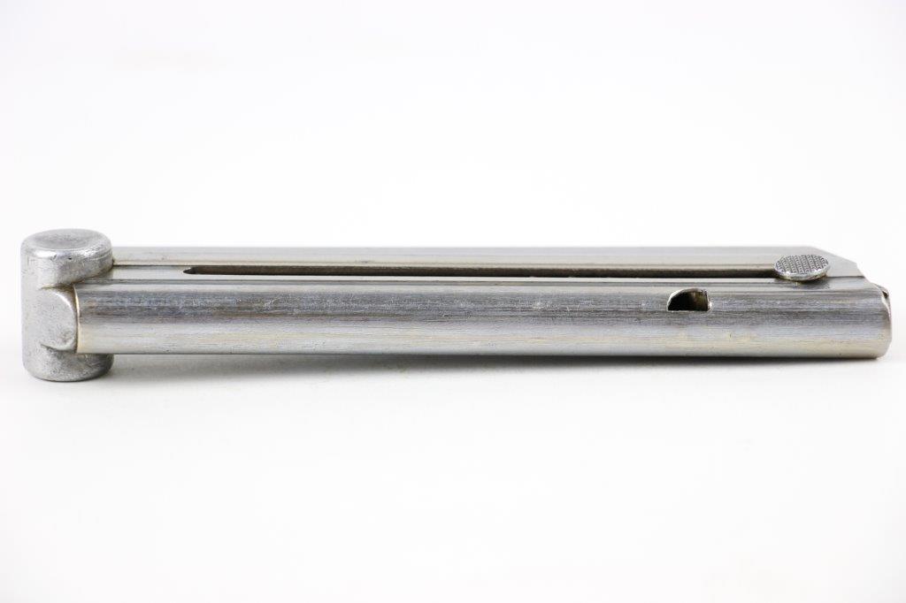 6/3/24 – This is an original WW2 production Luger magazine by Haenel. The magazine has a nickel plated finish on the tube, and an aluminum base. The base has a few dings and small dents, but what’s desirable about this example is the lack of markings or stamps on the base. The base has no signs of alteration or removed markings as well. The tube has light surface wear but no major issues and is maker stamped by Haenel on the base of the spine. Typically, these are police examples, but without any markings or proofs this example would be great for most WW2 production Lugers. Strong, functional spring.