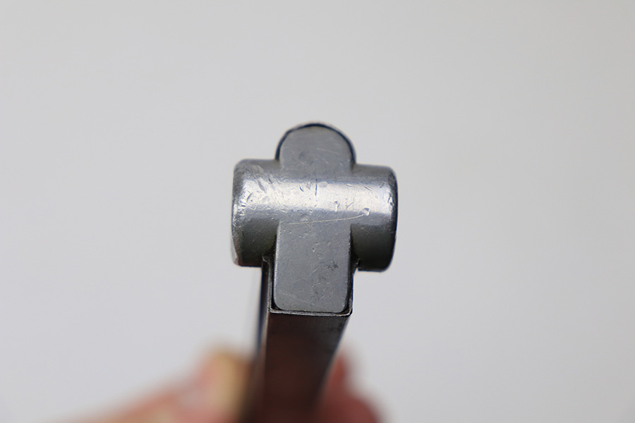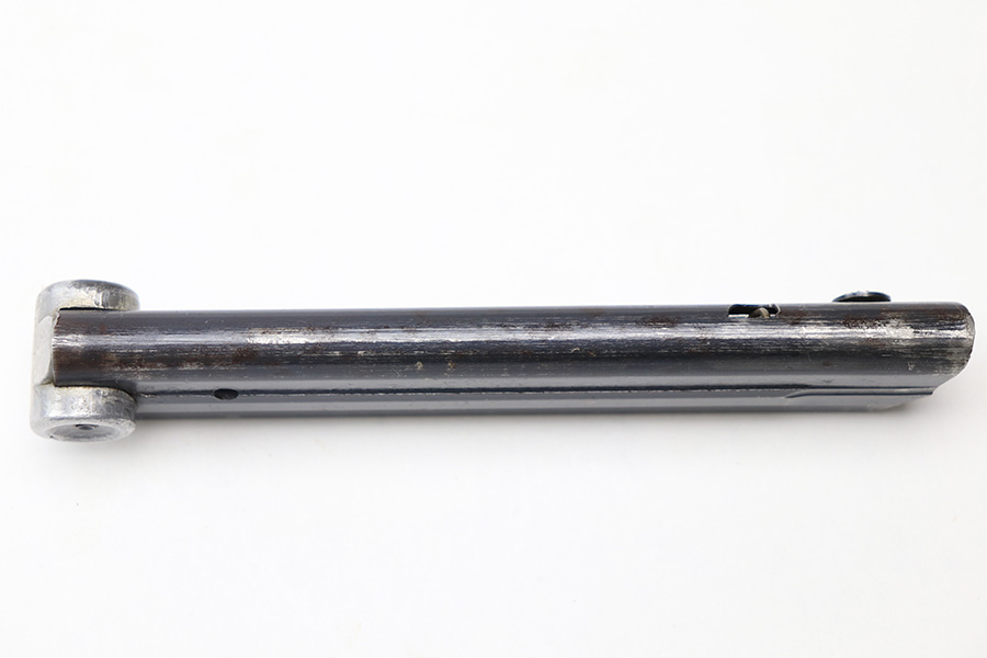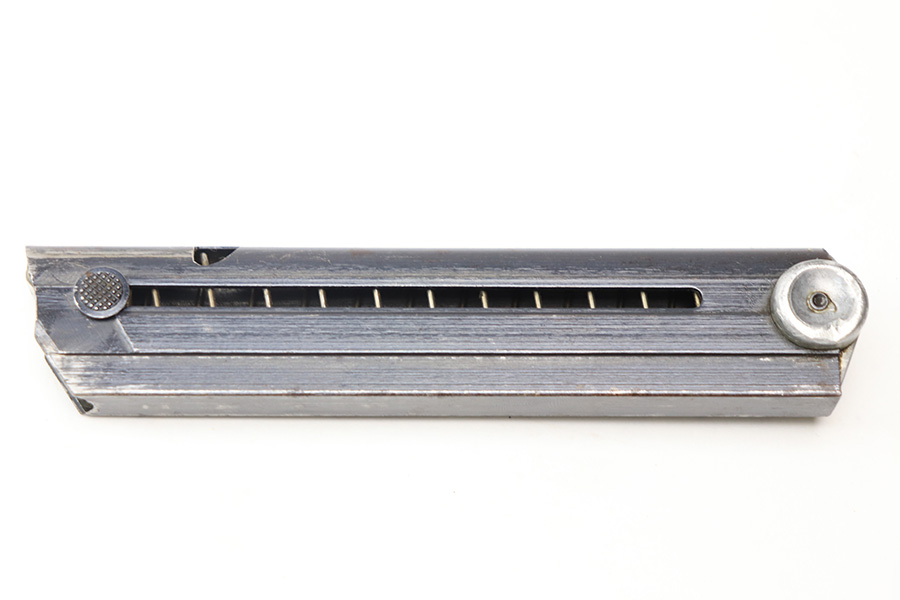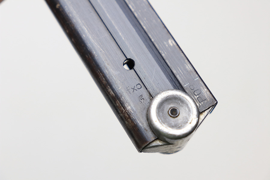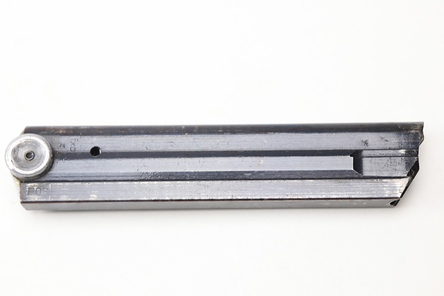 1/3/22 – This is a great example of a luger magazine produced by Haenel during WW2. The blued tube of the magazine is in great condition. The tube has maintained most of its finish, showing only minor use wear that is mostly isolated to the spine of the magazine. The magazine bottom is blank. The left side of the magazine features Haenel’s maker mark “fxo” and two “E/37” proofs. The spring and follower are strong and functional.