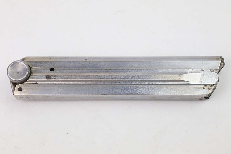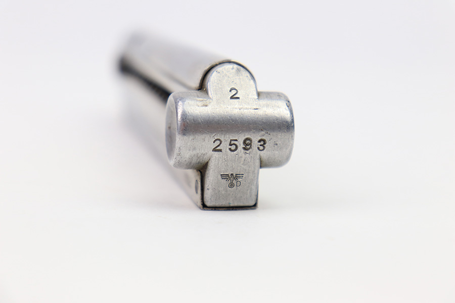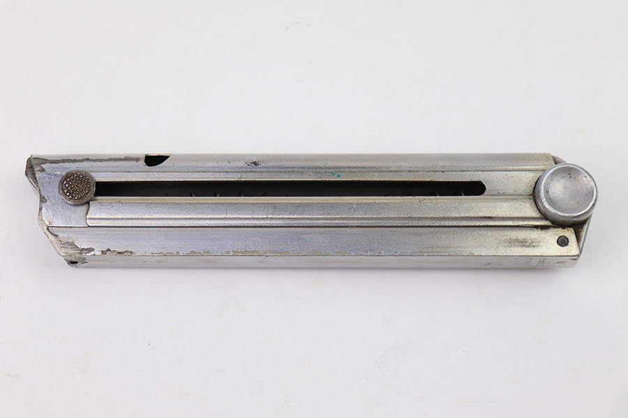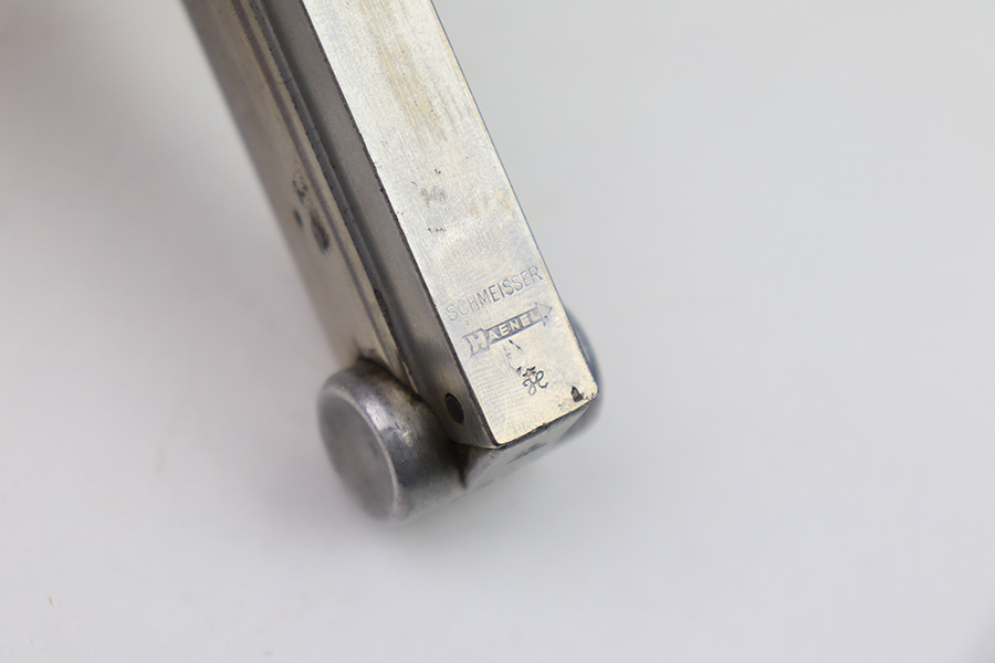 1/4/23 – This is an original Haenel made police Luger magazine from WW2. The magazine base is serial numbered 2593 with a numeral “2” above and an eagle/D police proof stamp below the serial number. The tube is Haenel maker stamped with a crown/H proof on the spine. The tube has some mild surface wear but no rust or pitting. The spring is strong and fully functional.