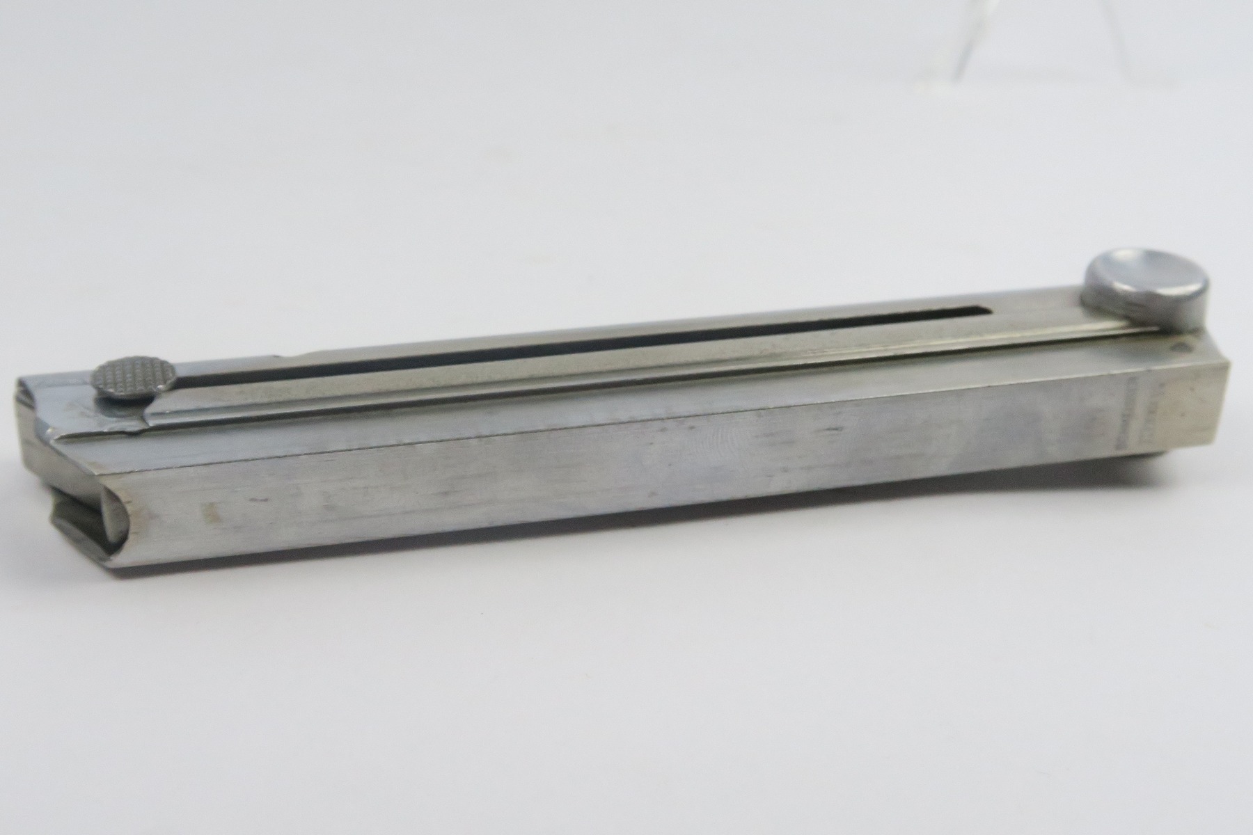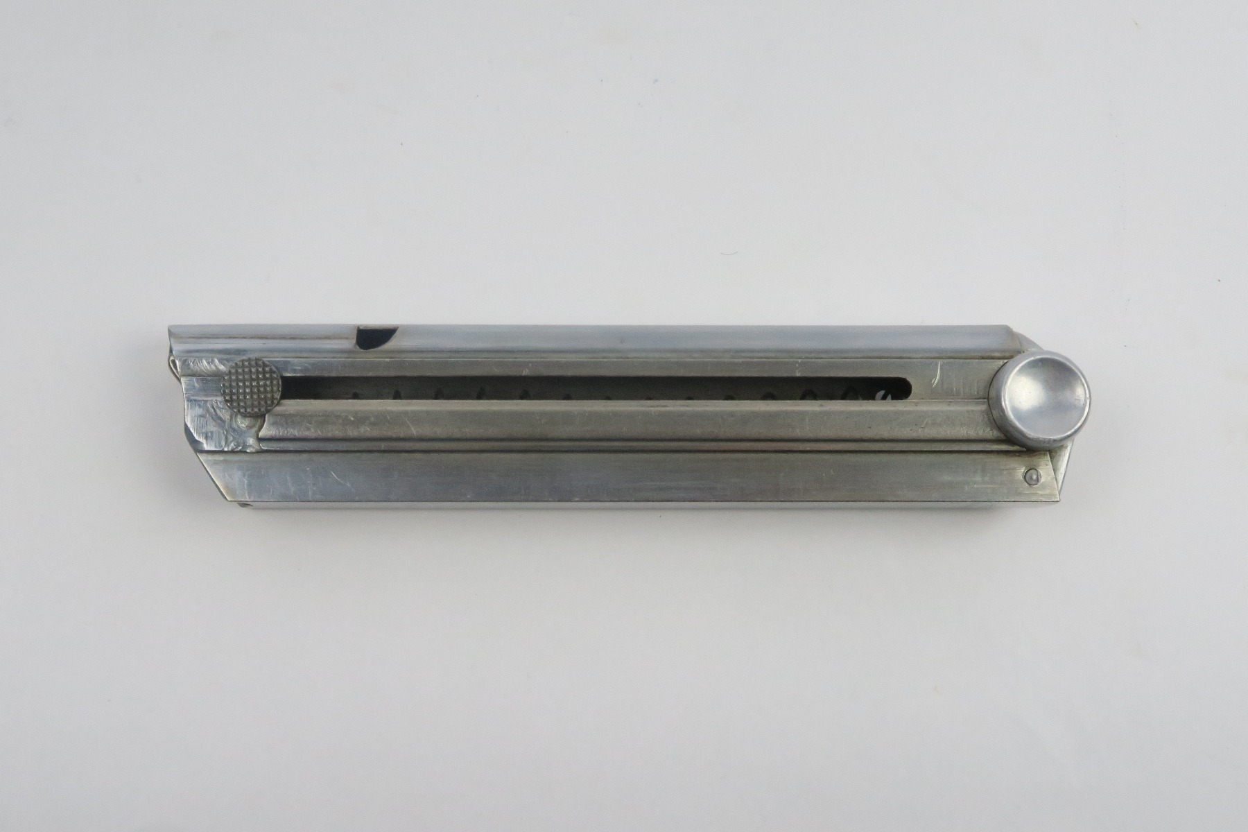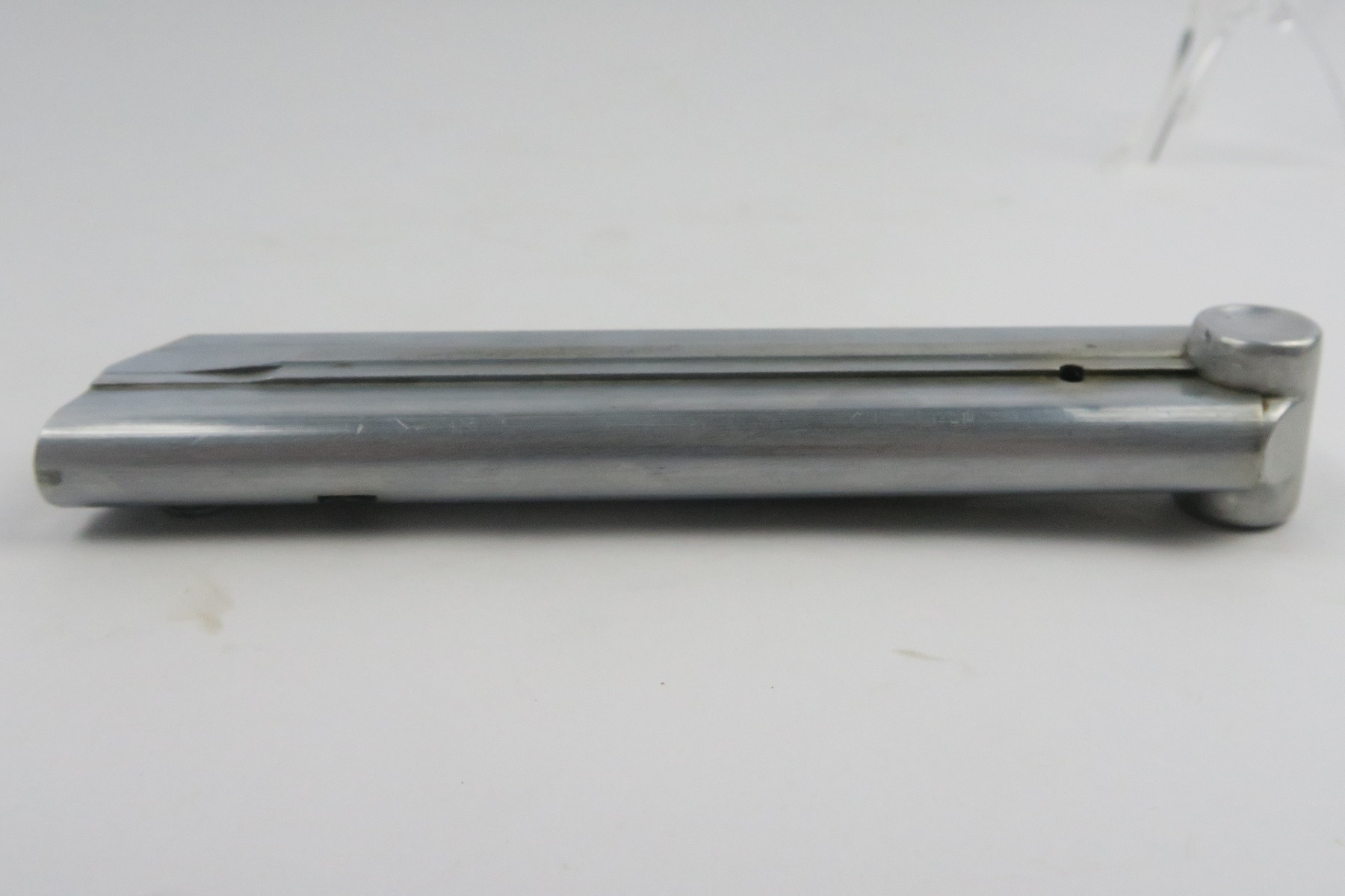 12/27/17 – This is an original Police Luger P.08 magazine. The magazine is stamped on the spine “Haenel Schmeisser” which is the maker of premier Luger magazines (most of which went to the police). The base of the magazine is eagle/L proof stamped, which is an extremely rare proof as not many magazines have this proof. There is no serial number on the base. The spring is strong and fully functional. Guaranteed original.