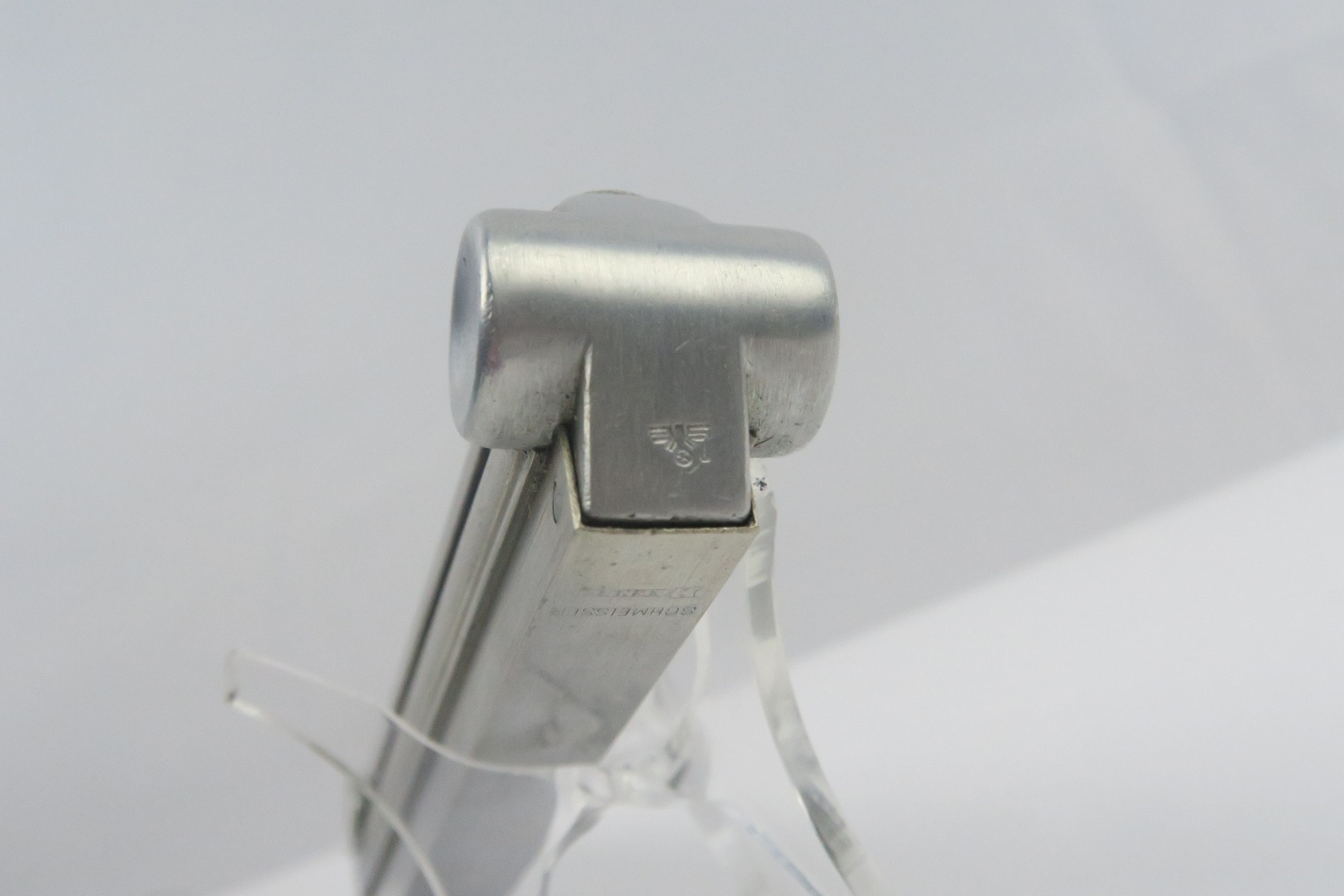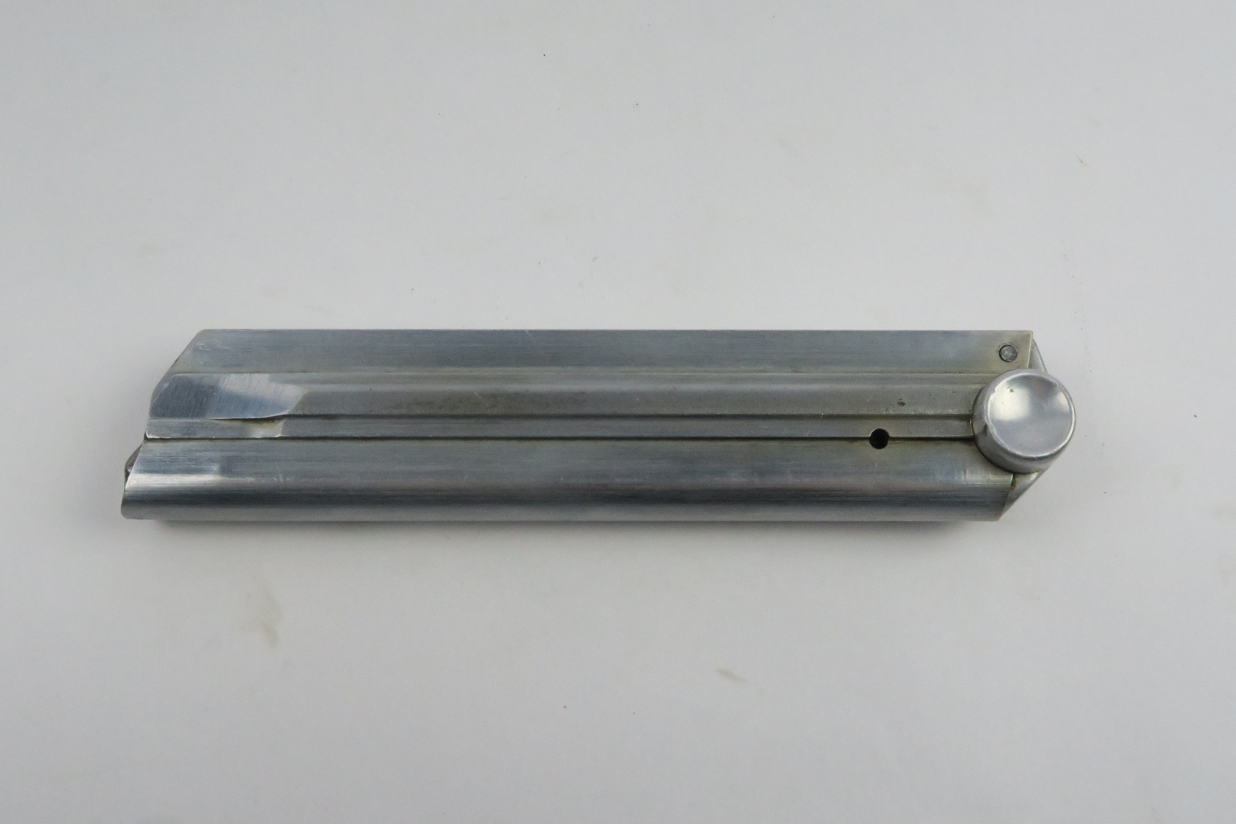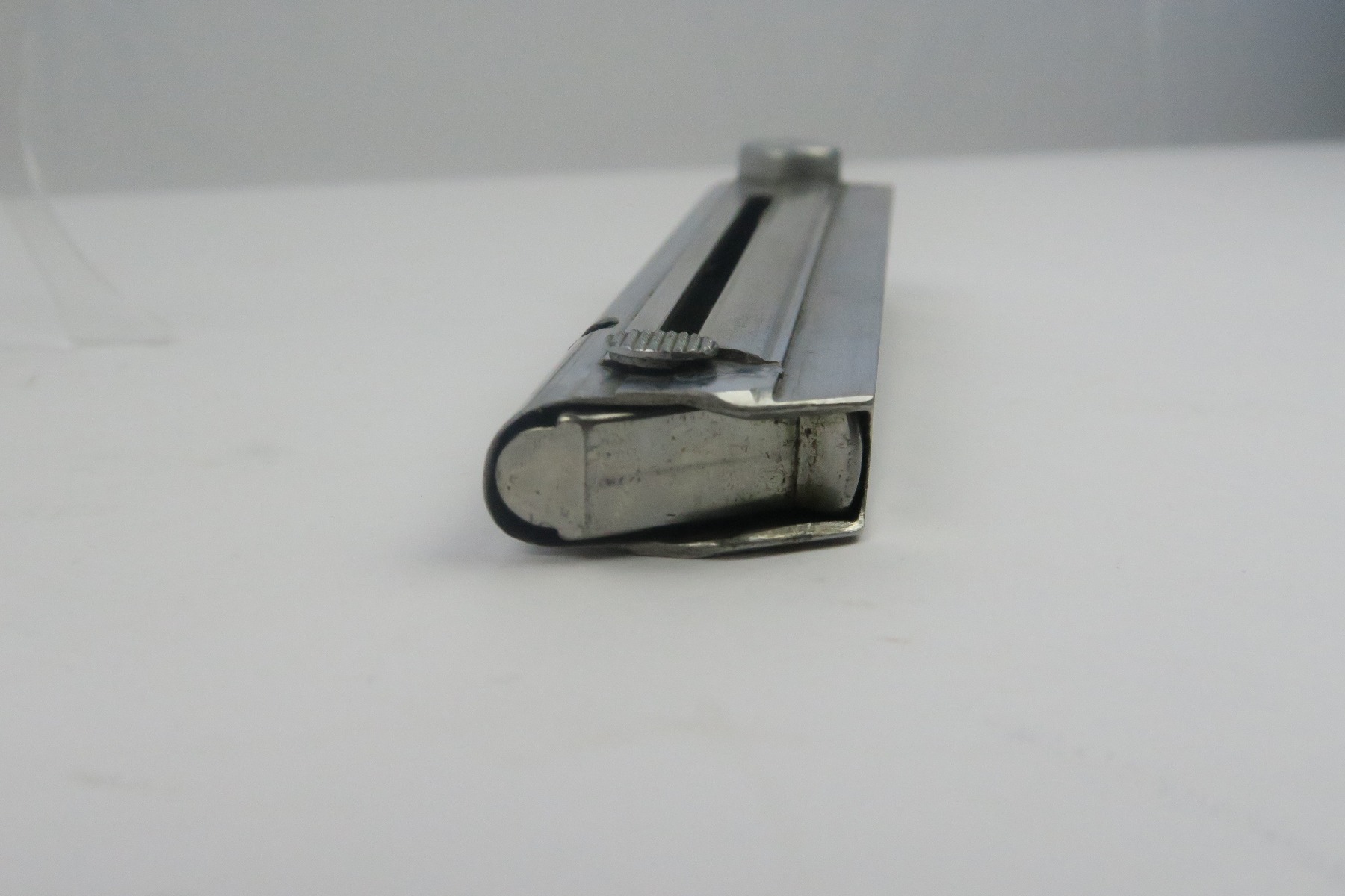 12/27/17 – This is an original Police Luger P.08 magazine. The magazine is stamped on the spine “Haenel Schmeisser” which is the maker of premier Luger magazines (most of which went to the police). The base of the magazine is eagle/L proof stamped, which is an extremely rare proof as not many magazines have this proof. There is no serial number on the base. The spring is strong and fully functional. Guaranteed original.