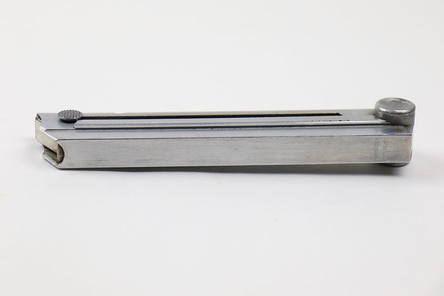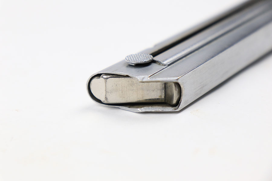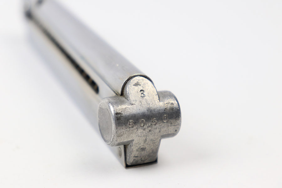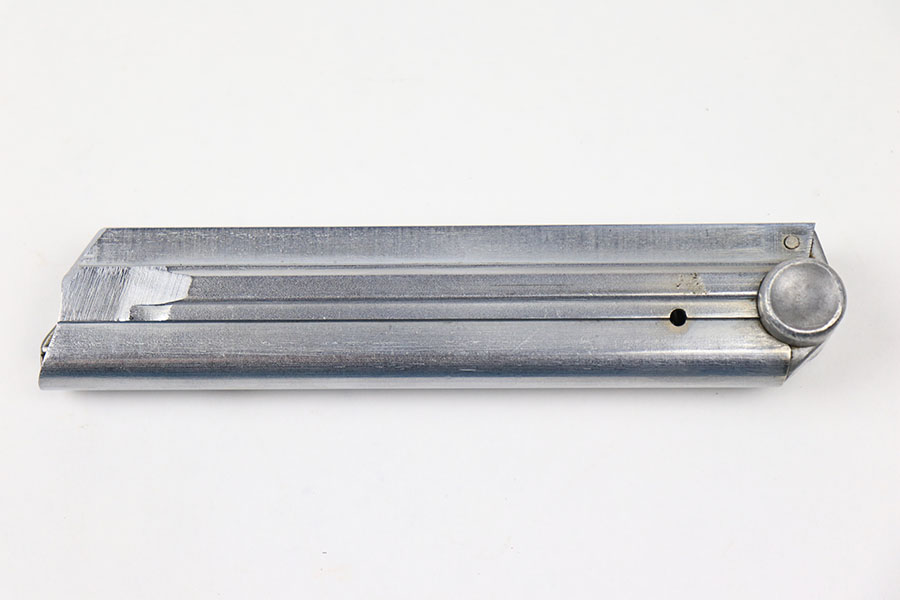 8/16/21 – This is an original Haenel made Police Luger magazine from WW2. The magazine is in excellent condition with a strong, functional magazine. Clean tube and base with minimal wear. The base is serial numbered “6056” with a “3” above and a Haenel maker stamp underneath. See photos.