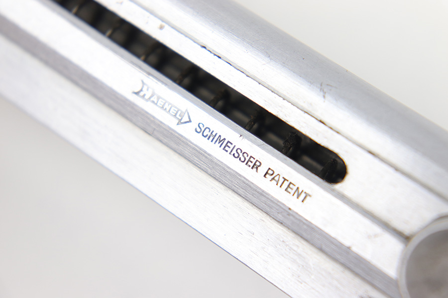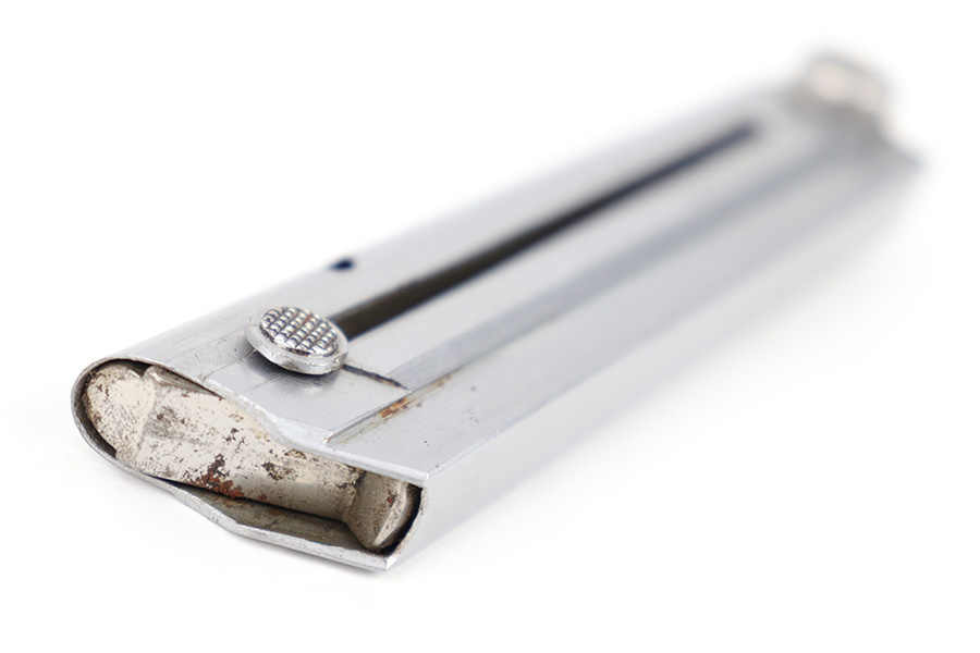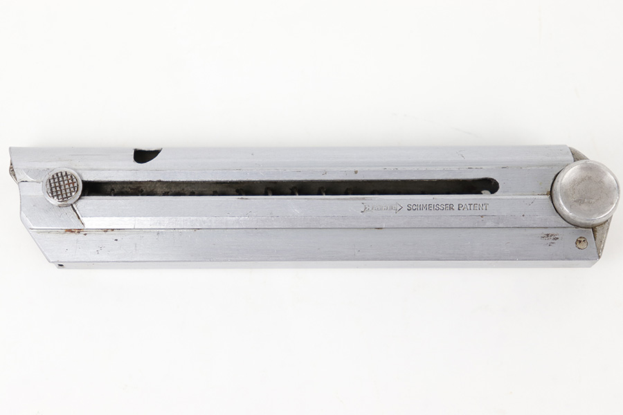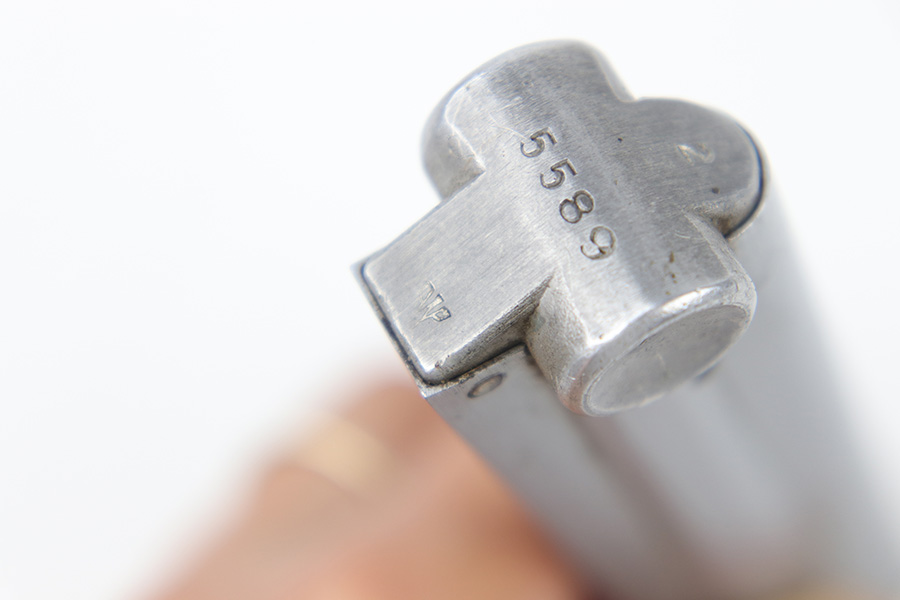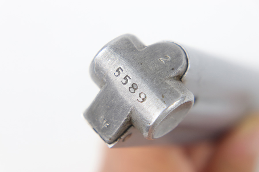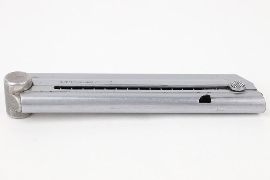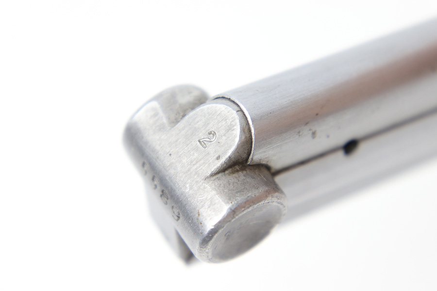 5/5/23 – This is an original, excellent condition WW2 Police Luger magazine. The magazine is maker stamped by Haenel on the tube, and is serial numbered on the aluminum base, as shown. The base is also stamped “2” for the spare magazine, and has a police eagle proof stamp. The spring is strong and fully functional.