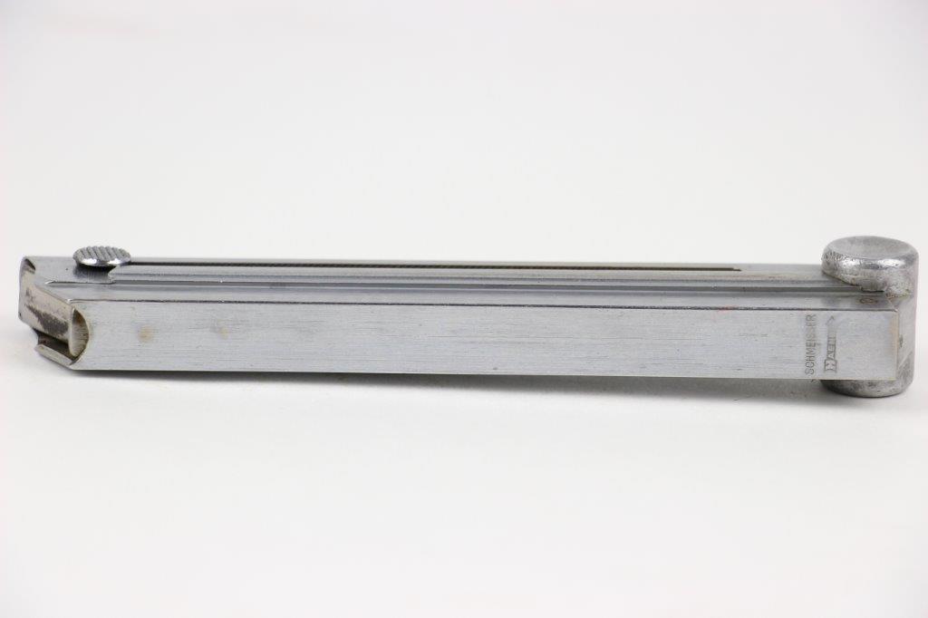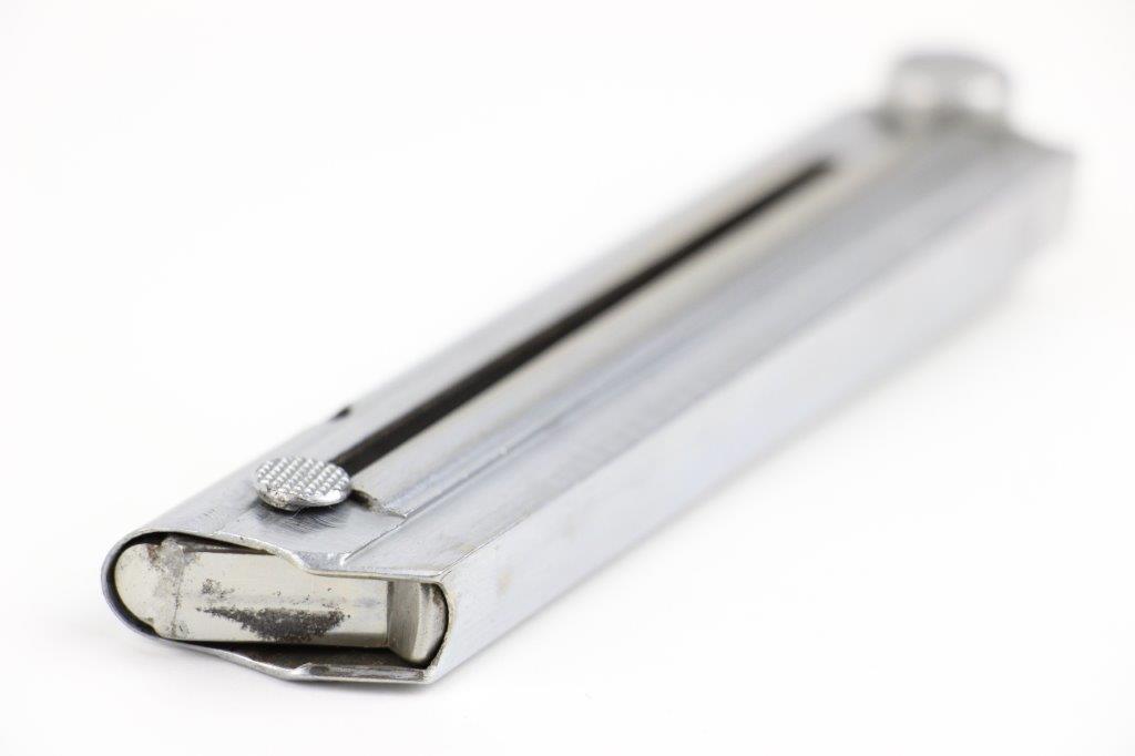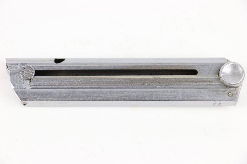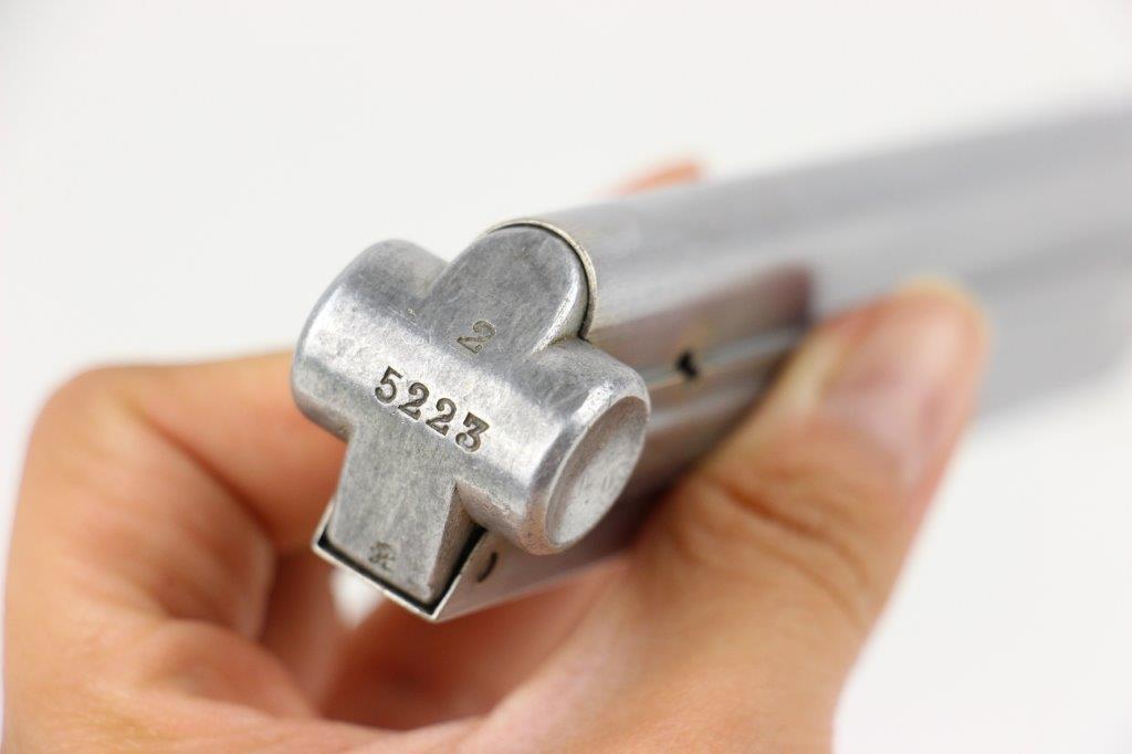5/28/24 – This is an excellent condition WW2 Police issued Luger magazine by Haenel. The magazine has a nickel tube that has light handling wear and minimal discoloration. No rust or pitting and a strong, functional spring. The spine of the tube is maker stamped by Haenel. The base of the magazine is aluminum and struck with a crisp serial number “5223”. There’s a police style “2” above the serial number, meaning this is the spare magazine. The bottom of the base is stamped with a Police crown/h proof stamp by Haenel. A very nice original example.