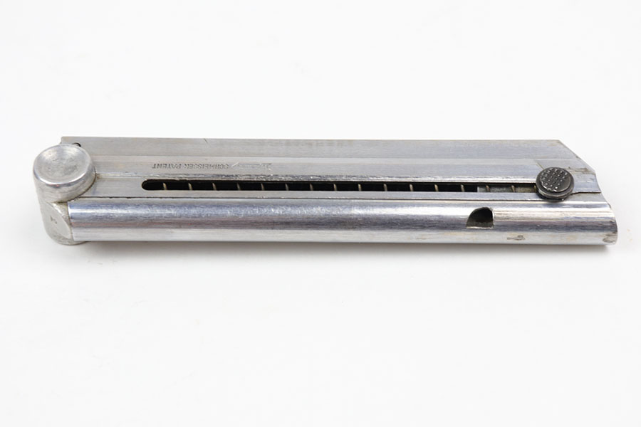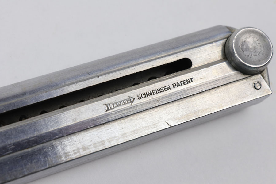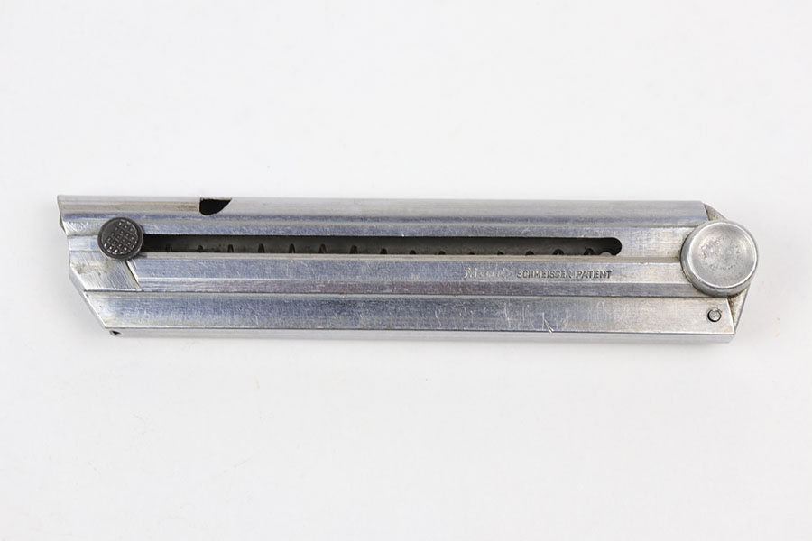10/21/20 – This is an original, excellent condition and high quality police luger magazine made by Haenel. No rust or pitting, nearly perfect finish. Police numbered on the base, and maker stamped on the frame. Fully functional spring.